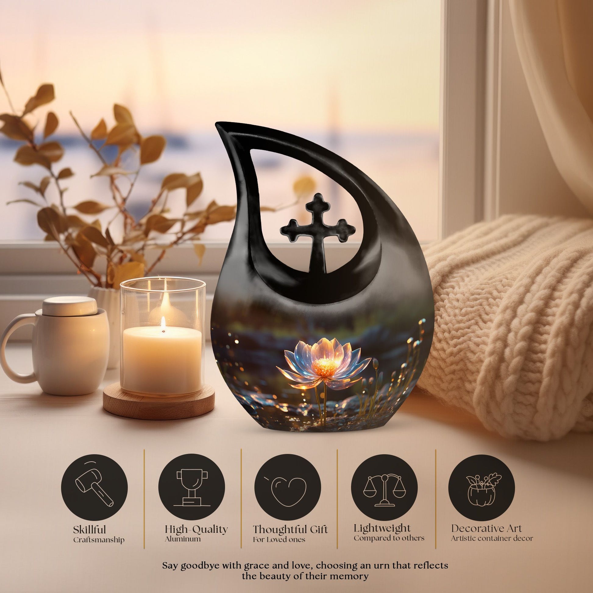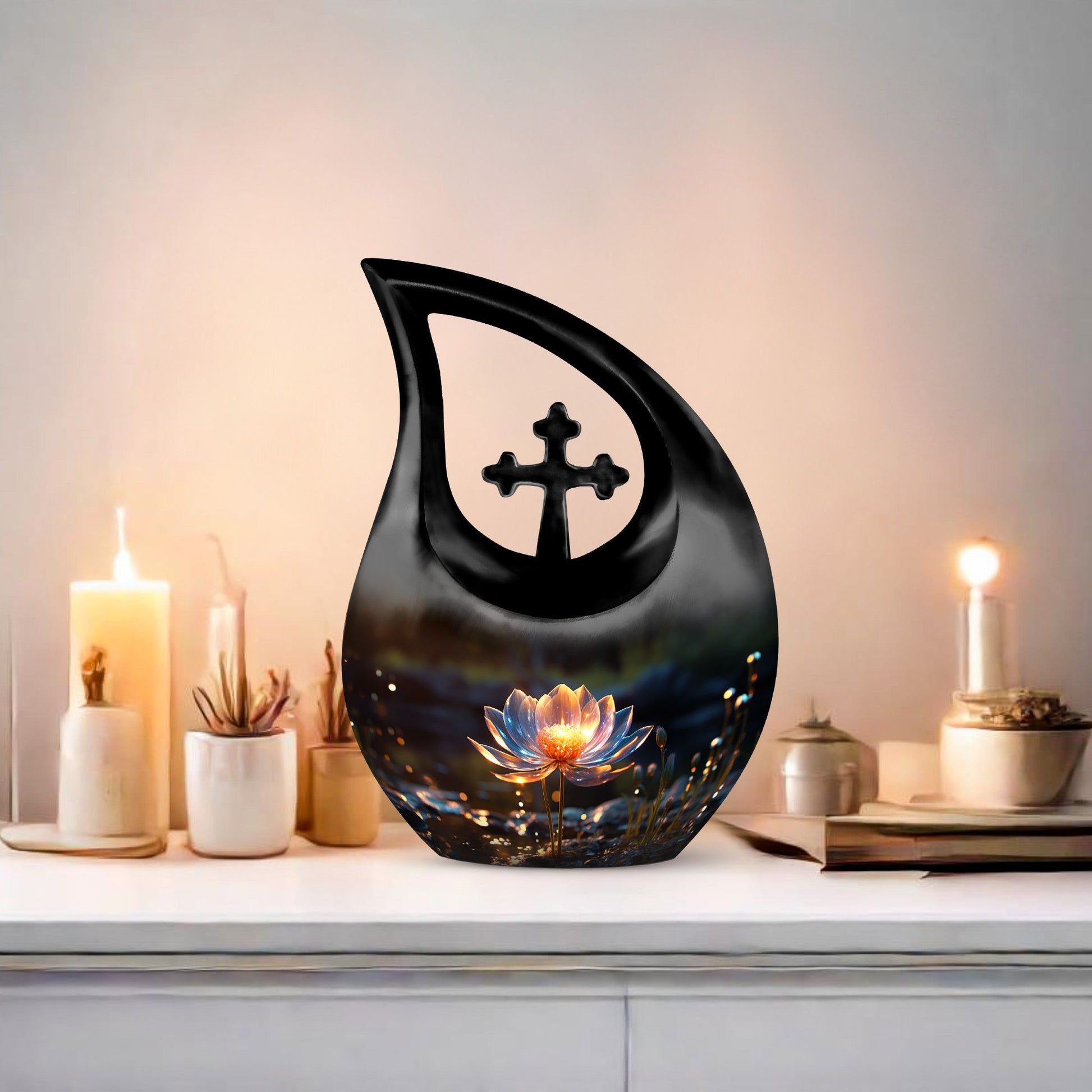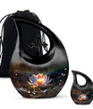 Expertly handcrafted from high-quality aluminum, this cremation urn large is both durable and visually stunning. Its deep black finish contrasts beautifully with the intricately engraved lotus flower, a timeless emblem of eternal life. The sleek shape and refined craftsmanship make it a standout piece among large cremation urns for human ashes. Suitable for display at home or in a memorial setting, this large cremation urn ensures your loved one’s ashes are kept safe while radiating serenity and beauty.