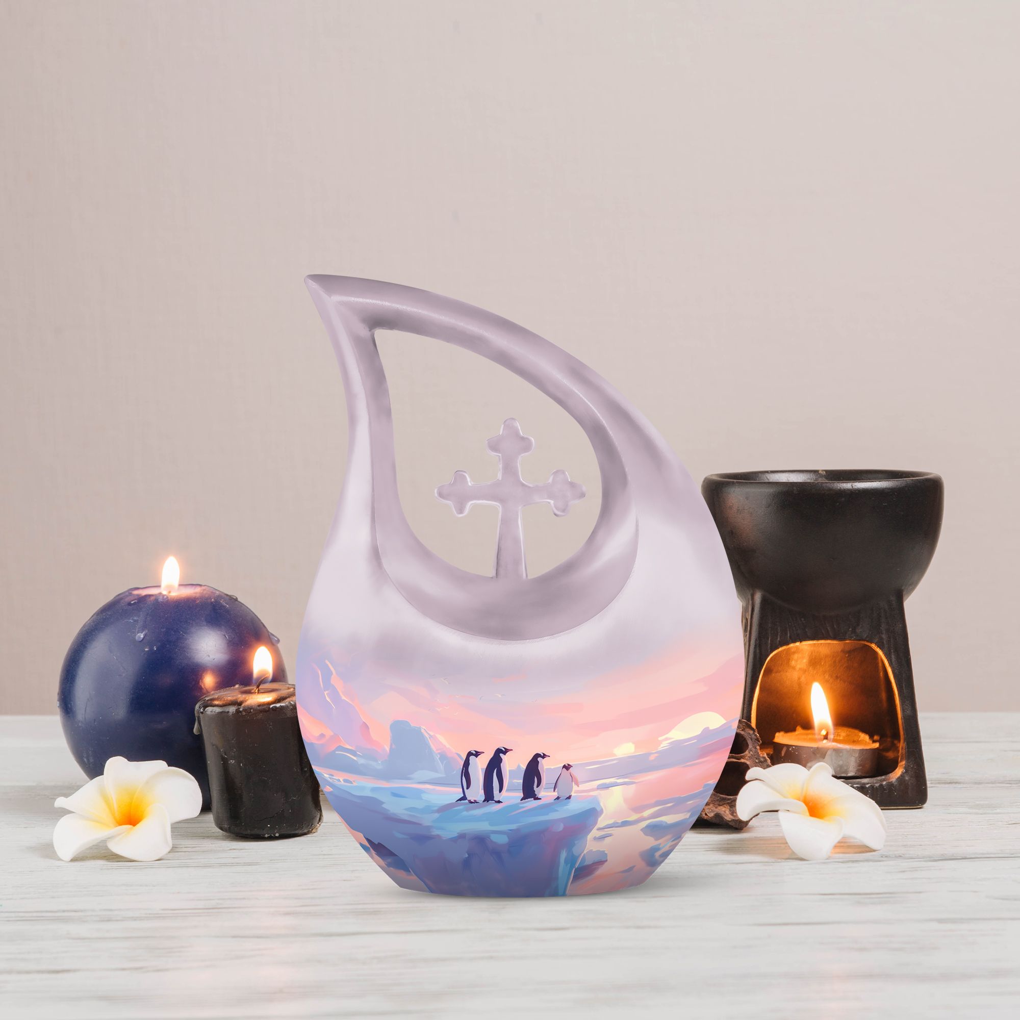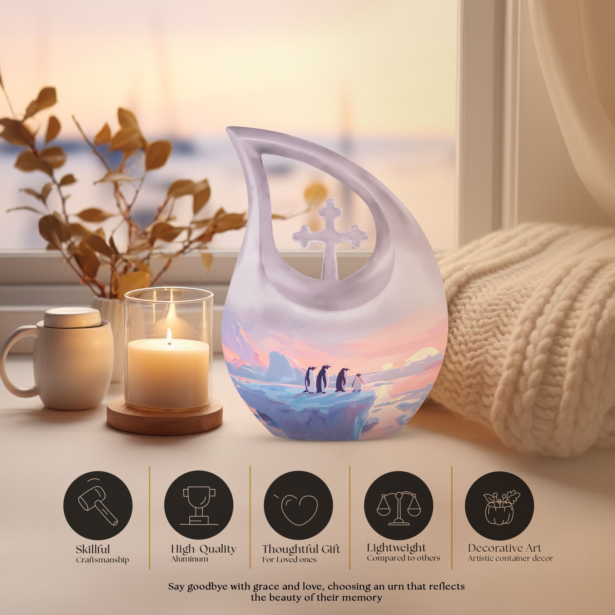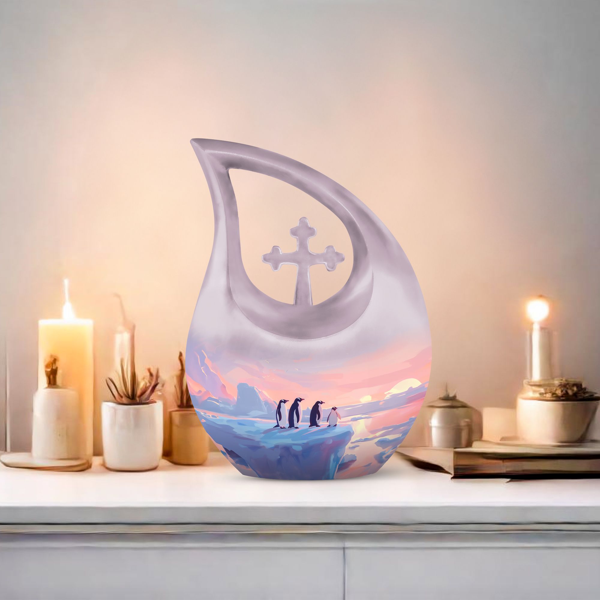 Crafted from sturdy aluminum, this exclusive Penguin Urn stands 10 inches tall, with a substantial weight of 3.3 pounds. Its unique Cross Drop theme reveals a fresh take on Large Urns for memorial purposes. Central to its charm, this memorial urn integrates a delightful Penguin theme, ensuring a heartwarming tribute that will stand the test of time. Also provided is a 200 cubic inches capacity, sufficient to securely house ashes of loved ones. What sets this urn apart is the opportunity it presents for customization. You can personalize this urn with engraved names, making it an unparalleled choice amongst Full Size Urns For Human Ashes, Small Keepsake Urns, and Burial Urns categories. For ultimate safekeeping, each urn comes with a premium velvet pouch fit for the containment of ashes. Renounce commonality with this Unusual Urn for ashes, an ultimate tribute to your beloved mom customized to reflect your sentiments. Ideal for those seeking a memorable urn for a memorial ceremony.
