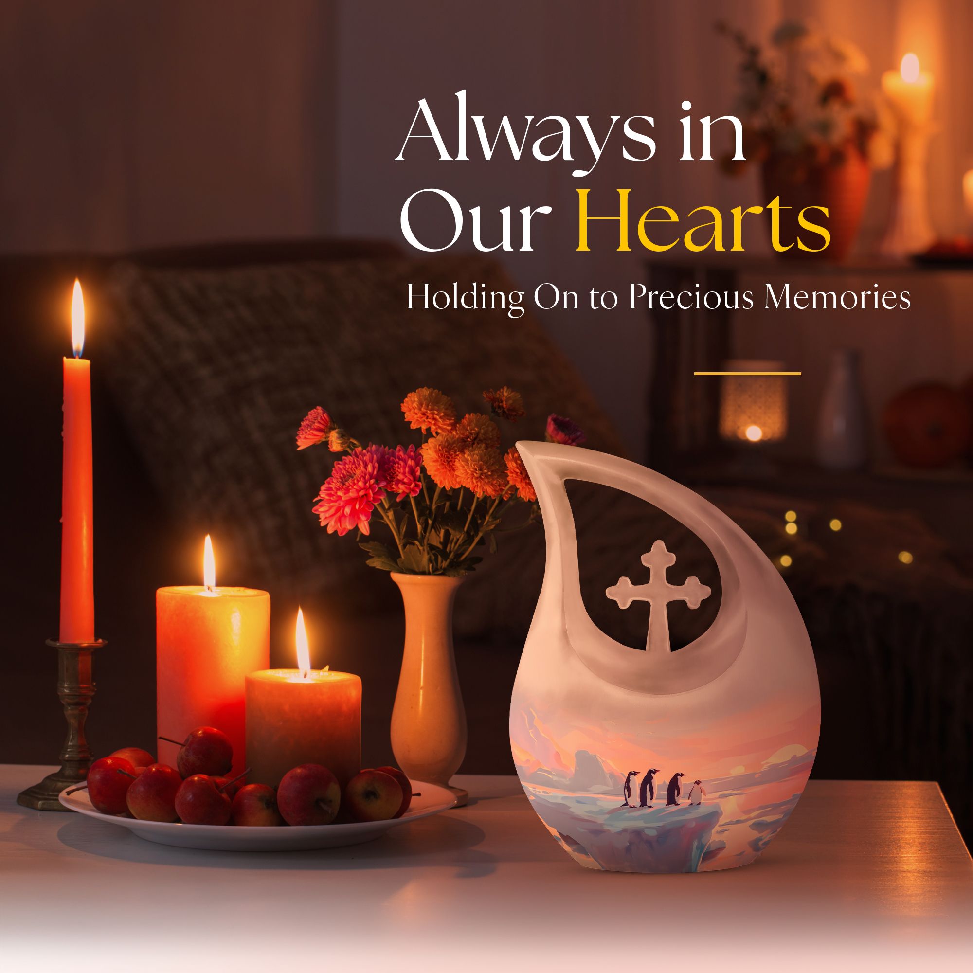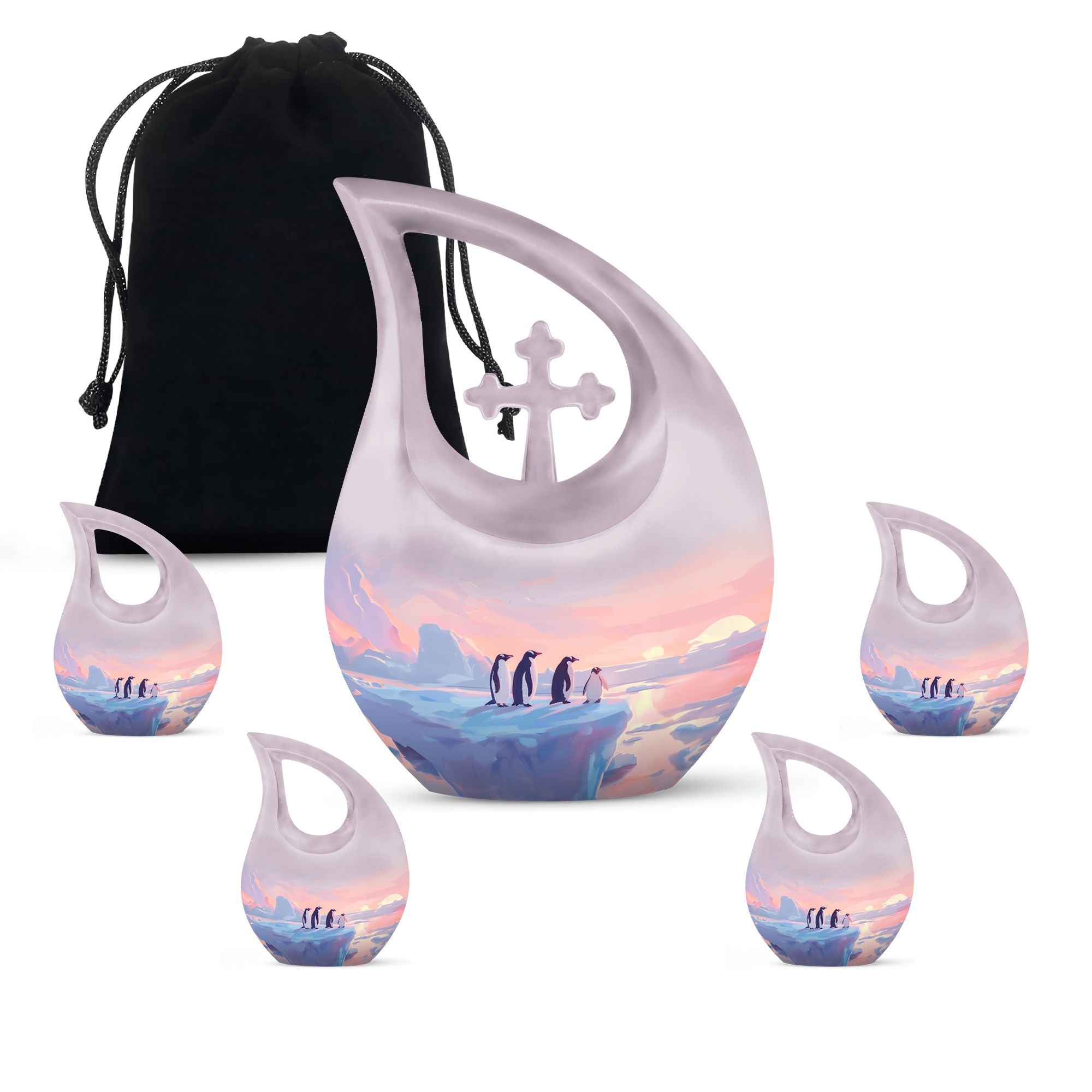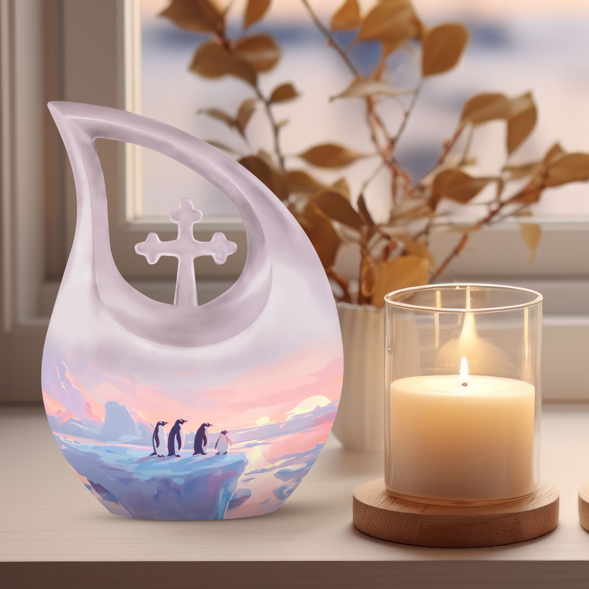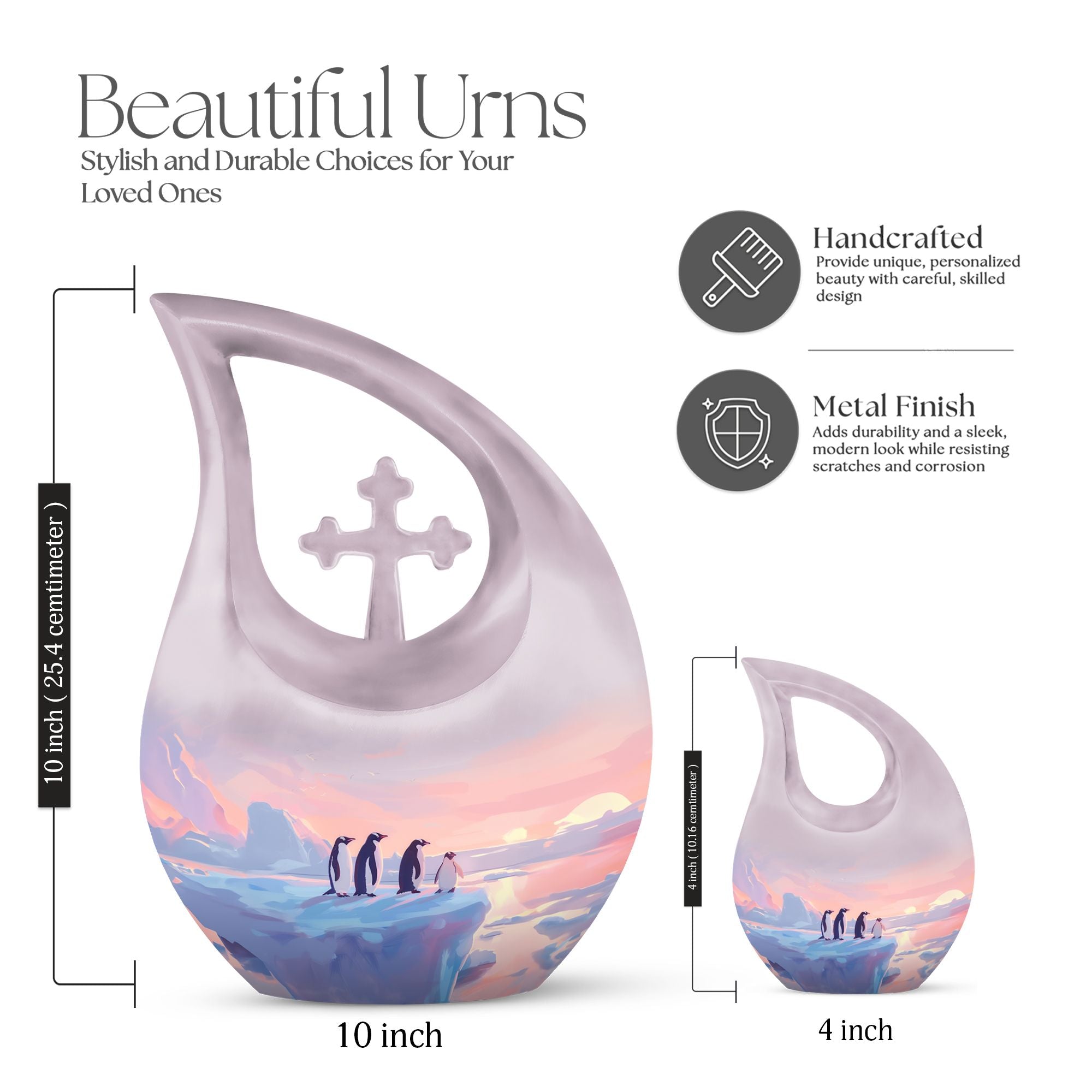 Crafted from sturdy aluminum, this exclusive Penguin Urn stands 10 inches tall, with a substantial weight of 3.3 pounds. Its unique Cross Drop theme reveals a fresh take on Large Urns for memorial purposes. Central to its charm, this memorial urn integrates a delightful Penguin theme, ensuring a heartwarming tribute that will stand the test of time. Also provided is a 200 cubic inches capacity, sufficient to securely house ashes of loved ones. What sets this urn apart is the opportunity it presents for customization. You can personalize this urn with engraved names, making it an unparalleled choice amongst Full Size Urns For Human Ashes, Small Keepsake Urns, and Burial Urns categories. For ultimate safekeeping, each urn comes with a premium velvet pouch fit for the containment of ashes. Renounce commonality with this Unusual Urn for ashes, an ultimate tribute to your beloved mom customized to reflect your sentiments. Ideal for those seeking a memorable urn for a memorial ceremony.
