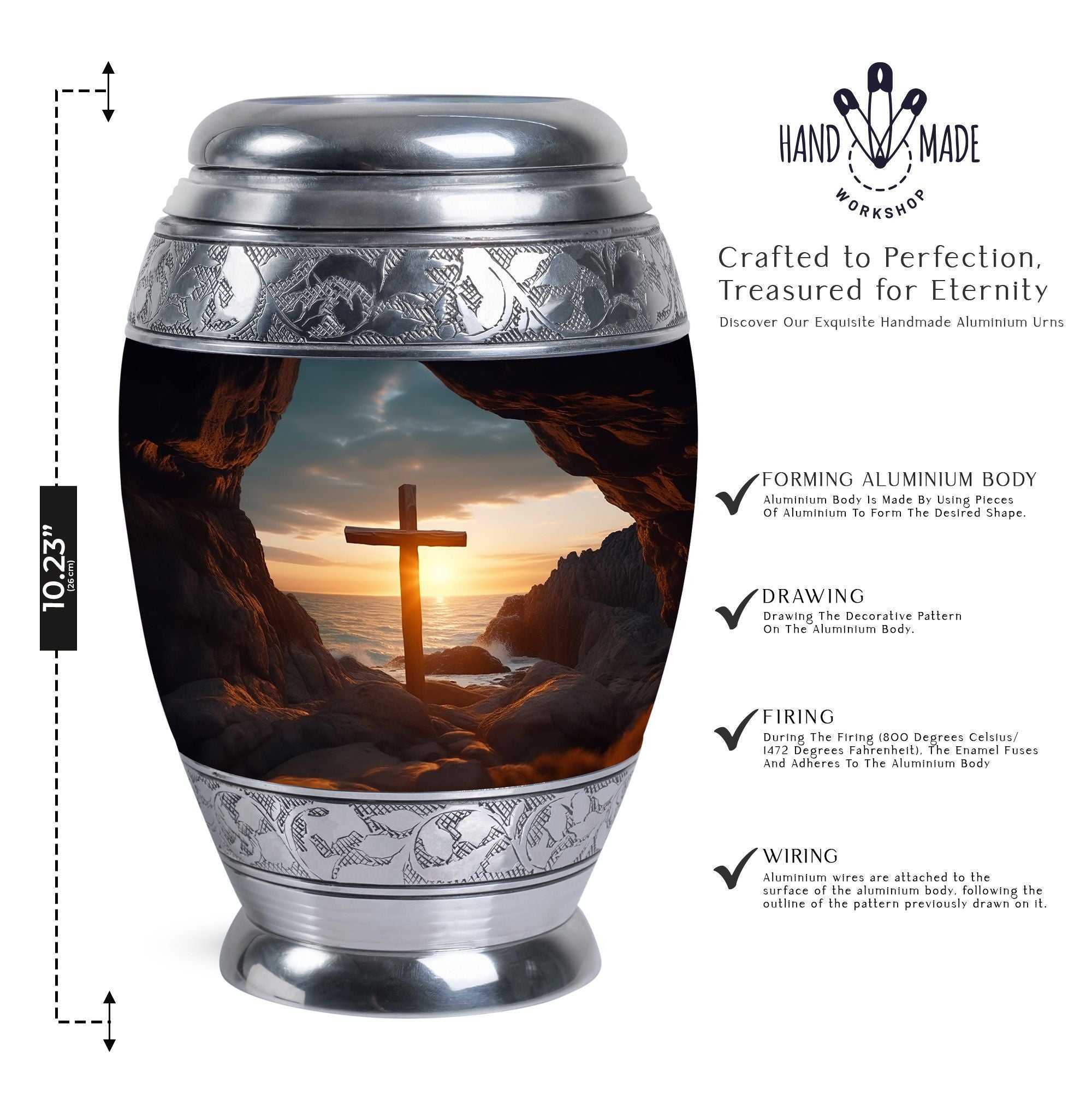 Experience an exquisite blend of durability, size, and beauty with our Ocean Jesus Cross Urns, specifically designed for adult and senior believers. Made from high-quality aluminium material, this Large Urn serves as an ideal last resting place for loved ones. It weighs 3.3 pounds, stands 10 inches tall, and is spacious enough with a capacity of 200 cubic inches, making it one of the perfect cremation urns you can find online. Personalization is possible with engraved names, turning it into a truly unique urns for ashes. The urn comes with a velvet pouch for containment of ashes, a thoughtful addition ensuring respectful treatment of your cherished one's remains. This classic urn design intricately presents the 'Ocean Jesus Cross', seamlessly merging spirituality with memorial. Get this ashes holder today, and celebrate the life of your loved one in an elevated, sanctified way, making each remembrance as deep as the ocean.