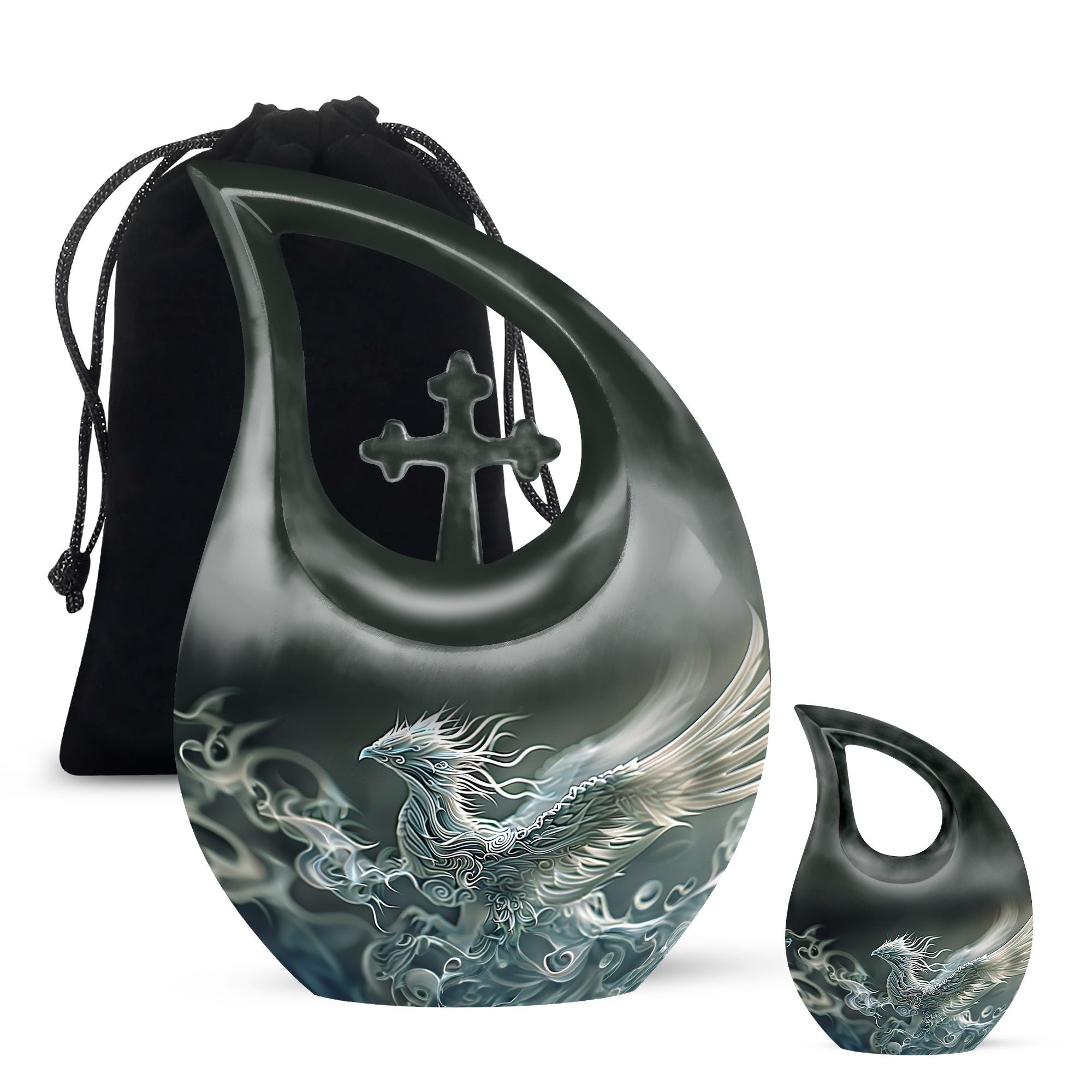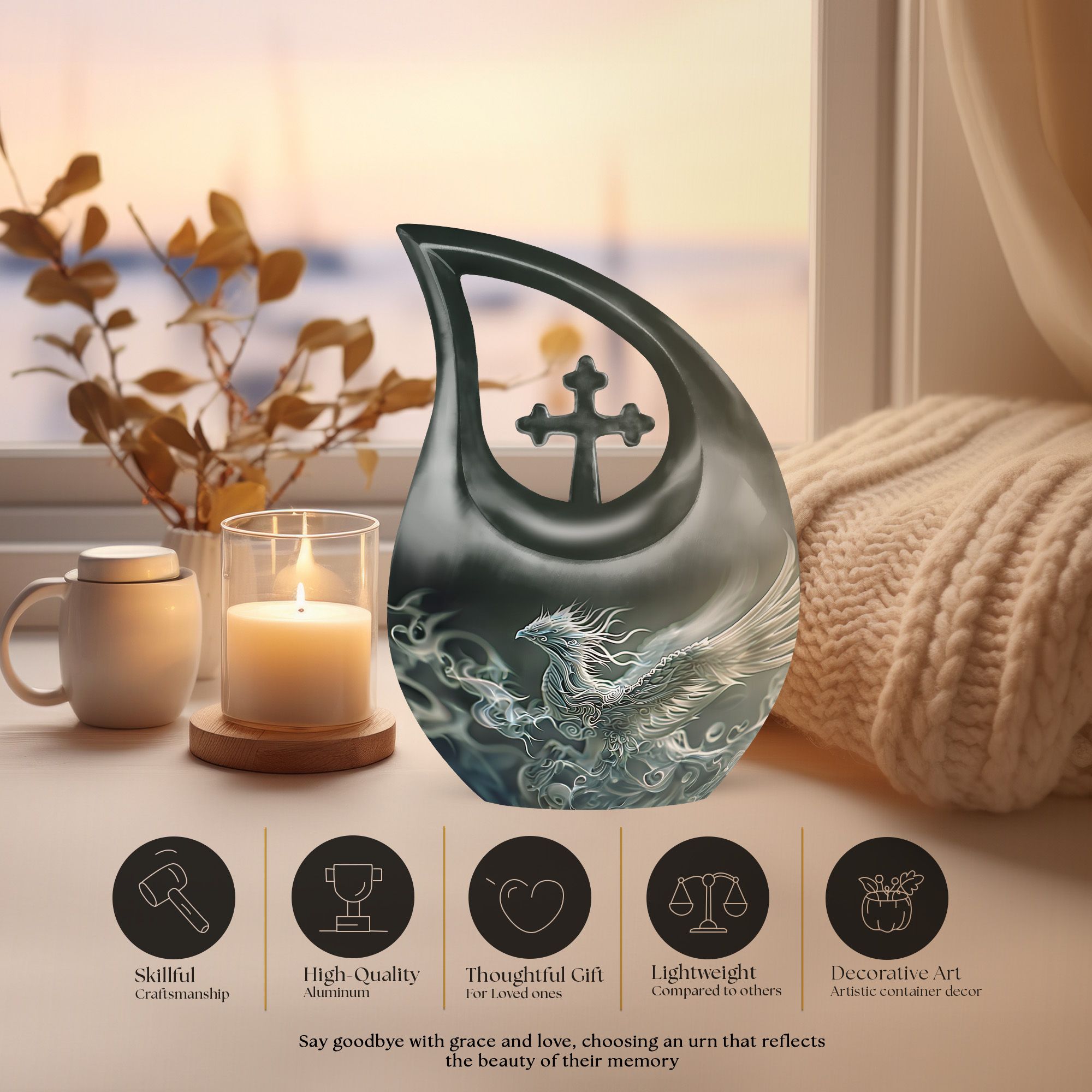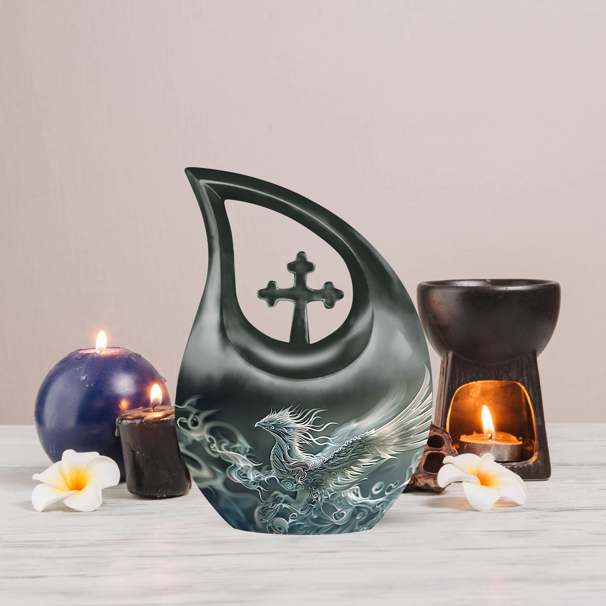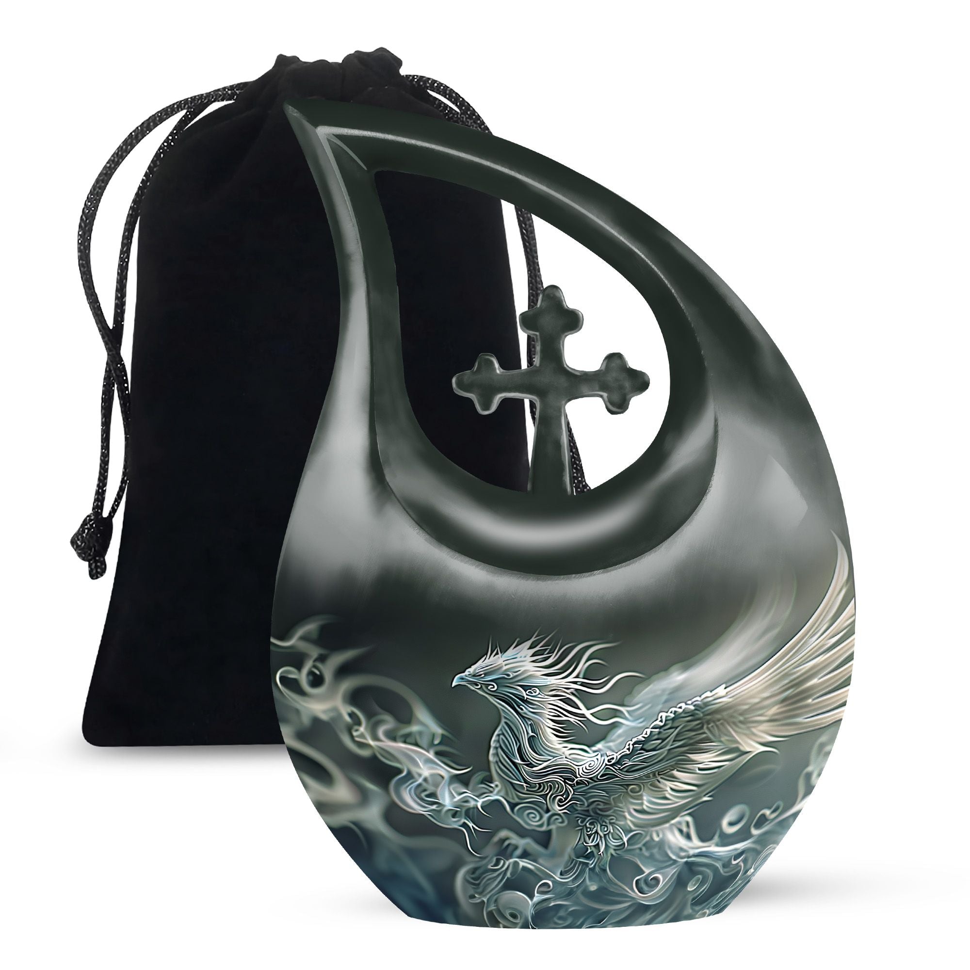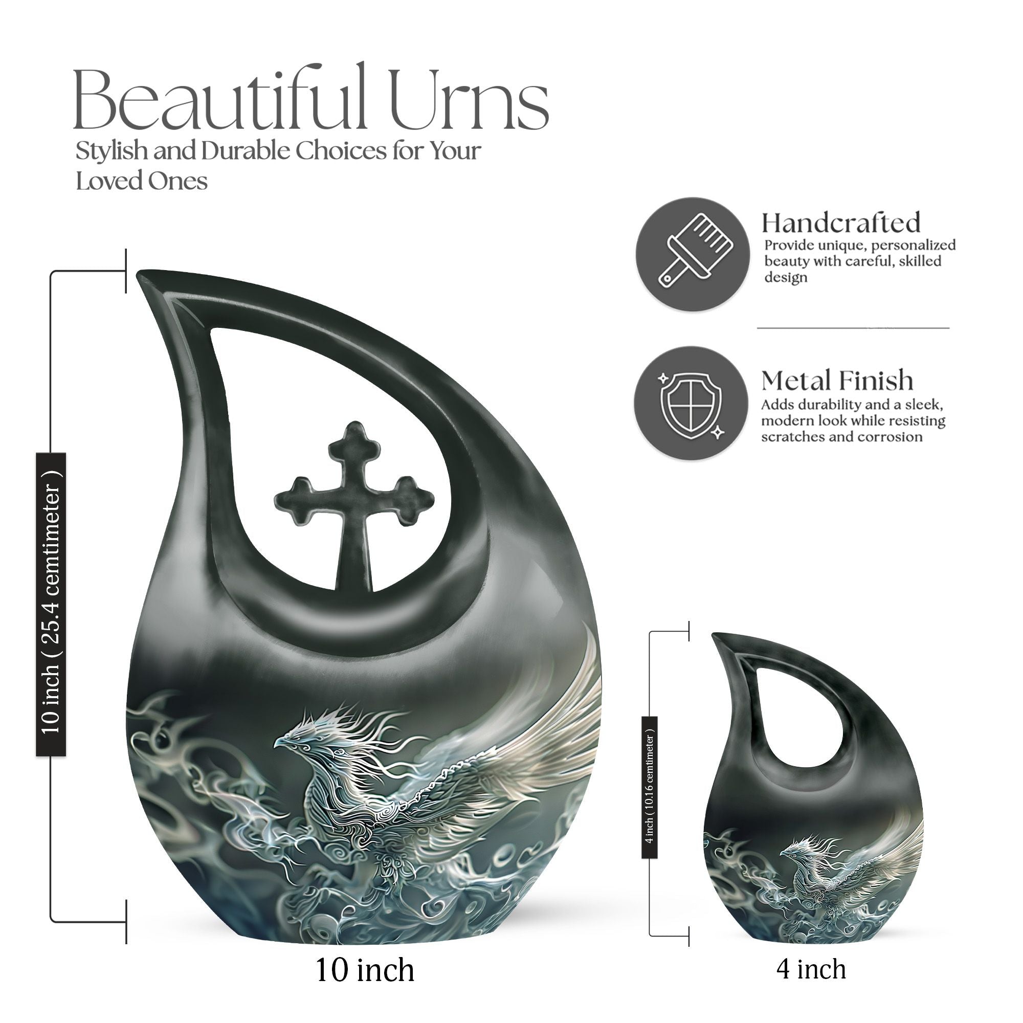 Embrace the enduring touch of the Phoenix Urn, a tasteful remembrance artistry designed specifically for adults and seniors. Measuring 10 inches in height with a weight of 3.3 pounds, this Medium Size Urn gracefully embodies a unique Phoenix Theme invoking energy and rebirth. Built with aluminium, it ensures timeless solidity and durability. The strategic capacity of 200 cubic inches accommodates as a style-conscious repository for your loved one’s ashes. This Large Urn extends an exclusive feature of personal customization - engrave your cherished names and enhance its emotional value. The package includes a high-quality velvet pouch for superior containment of ashes, indicating thoughtful design and absolute consideration. Integrating a 'Cross Drop' URN DESIGN, it creates a poignant narrative of spiritual serenity. From a subtle keepsake for ashes for a man to personalized urns for adults, explore a novel realm of memorial urns steeped in affection and reverence.