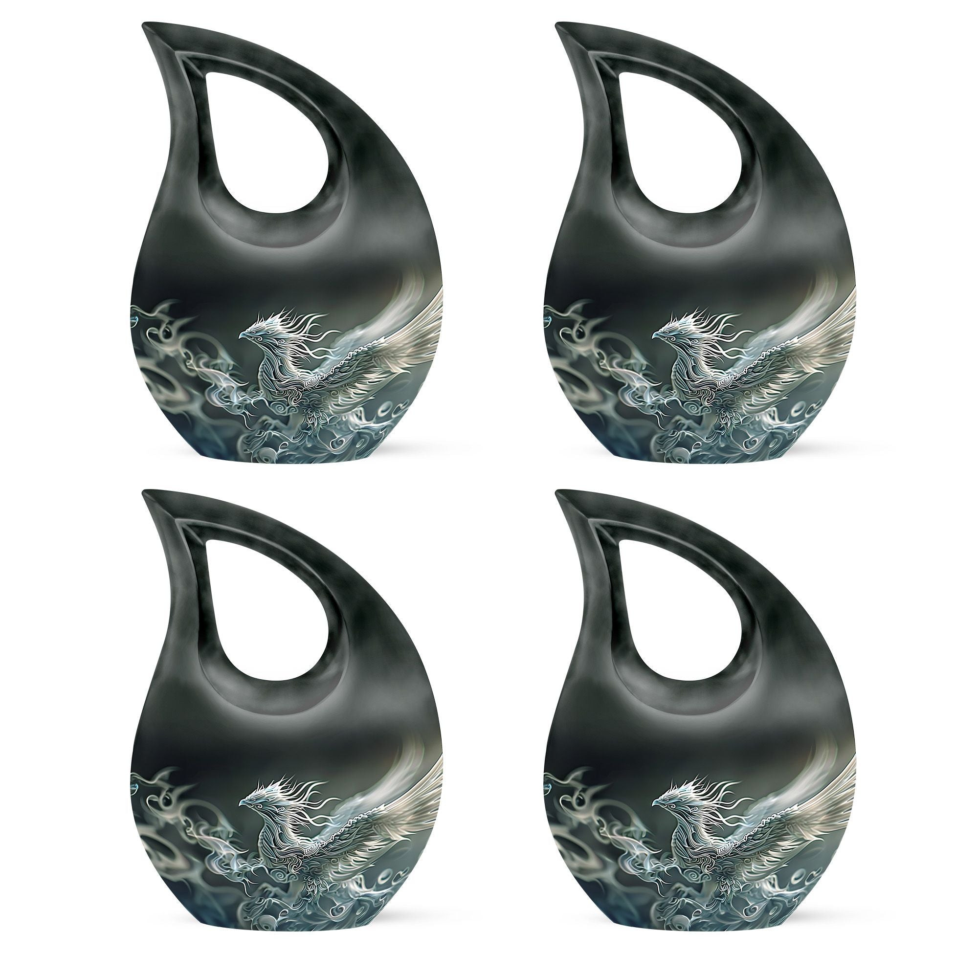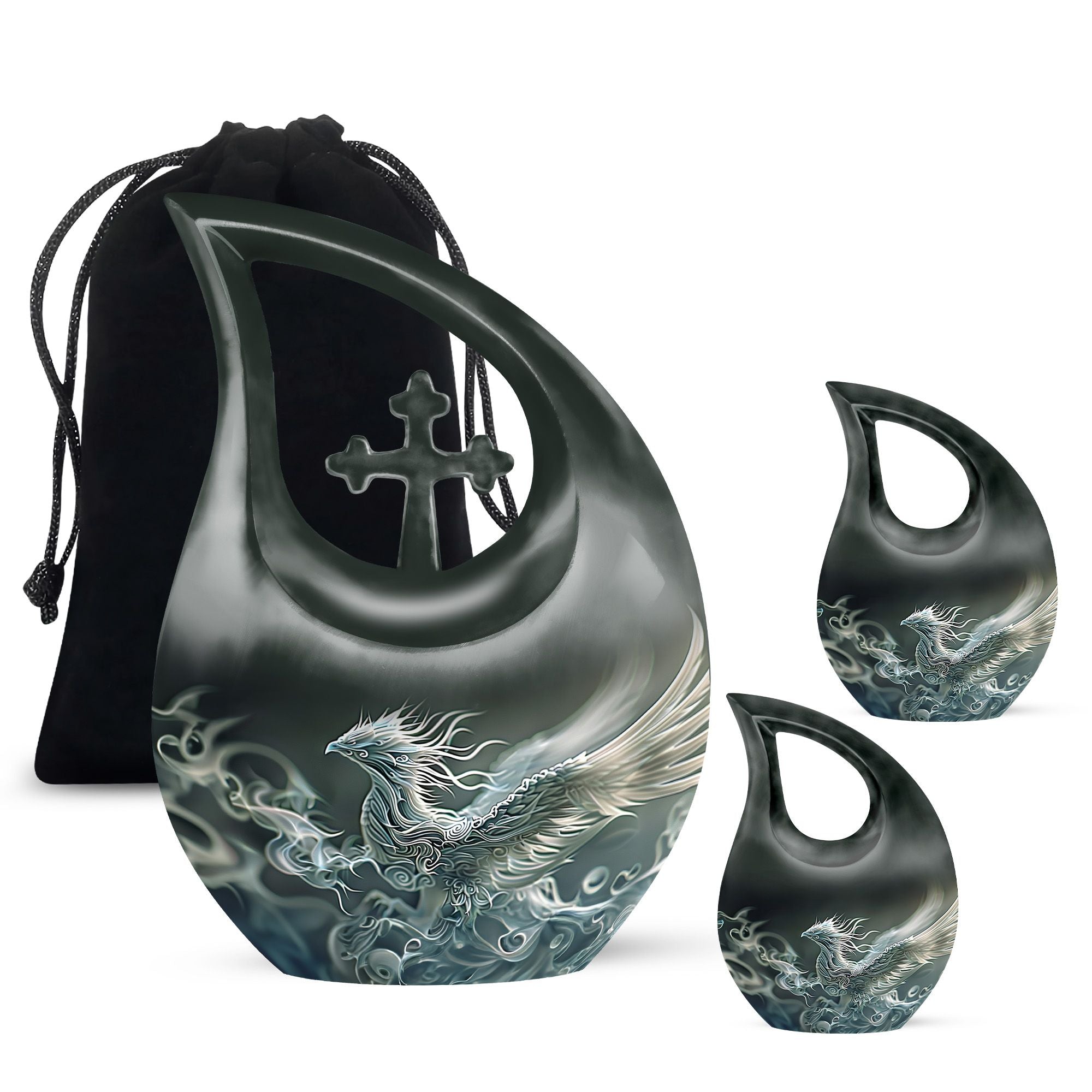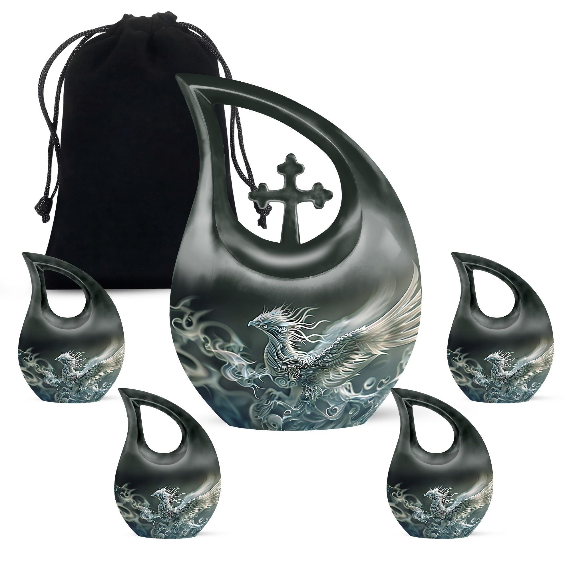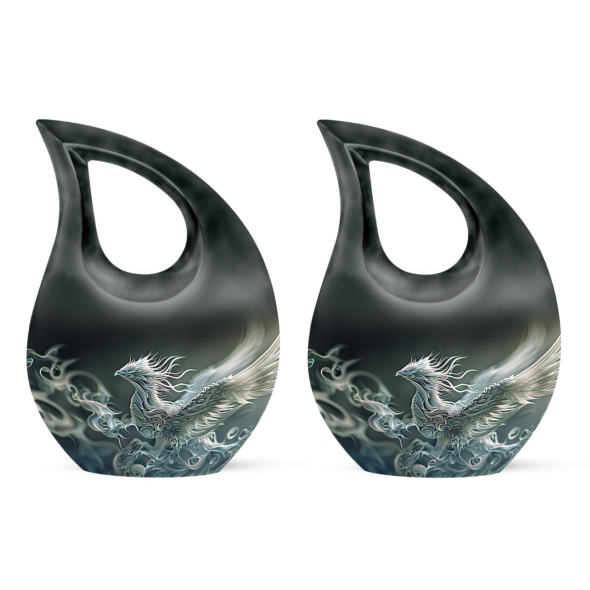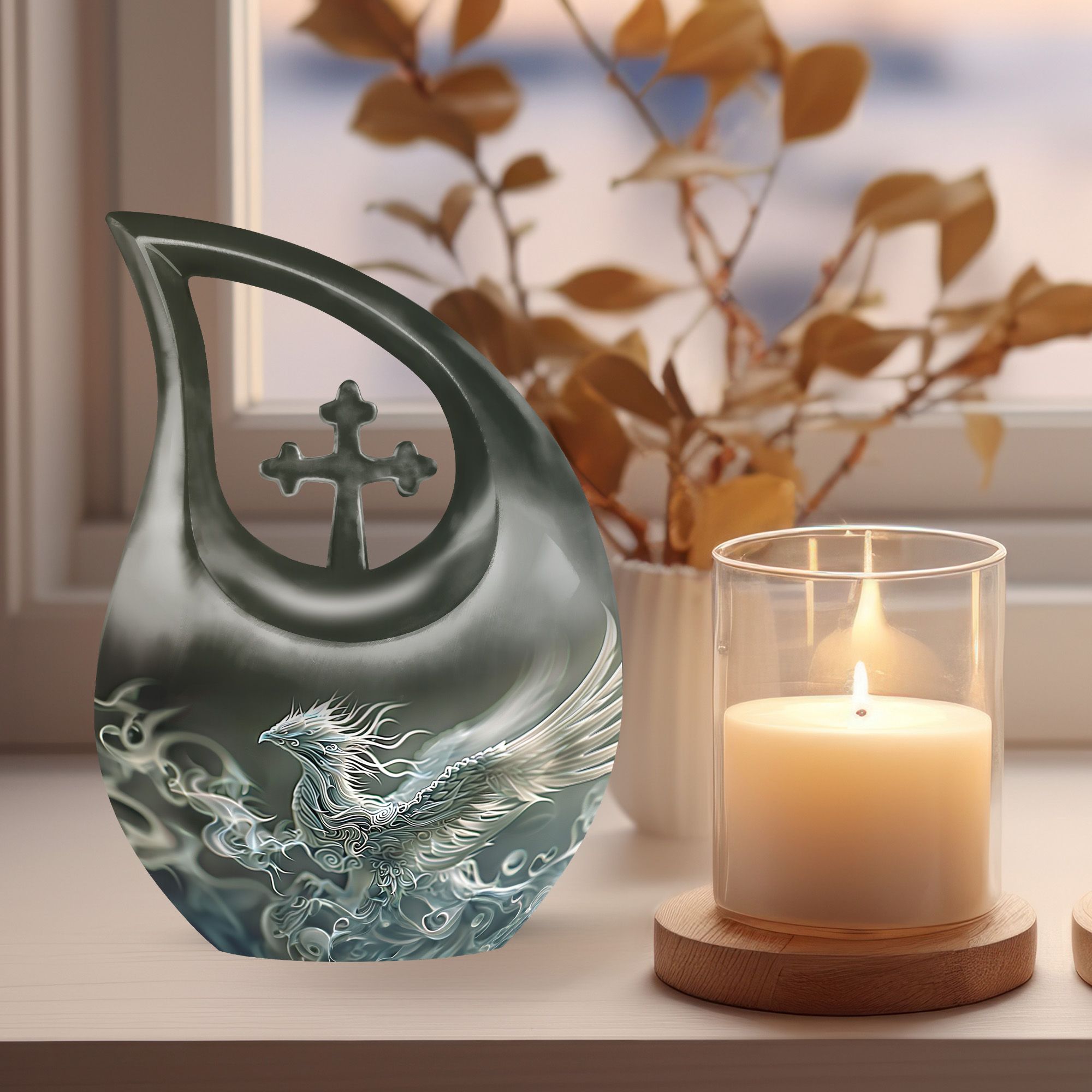 Embrace the enduring touch of the Phoenix Urn, a tasteful remembrance artistry designed specifically for adults and seniors. Measuring 10 inches in height with a weight of 3.3 pounds, this Medium Size Urn gracefully embodies a unique Phoenix Theme invoking energy and rebirth. Built with aluminium, it ensures timeless solidity and durability. The strategic capacity of 200 cubic inches accommodates as a style-conscious repository for your loved one’s ashes. This Large Urn extends an exclusive feature of personal customization - engrave your cherished names and enhance its emotional value. The package includes a high-quality velvet pouch for superior containment of ashes, indicating thoughtful design and absolute consideration. Integrating a 'Cross Drop' URN DESIGN, it creates a poignant narrative of spiritual serenity. From a subtle keepsake for ashes for a man to personalized urns for adults, explore a novel realm of memorial urns steeped in affection and reverence.