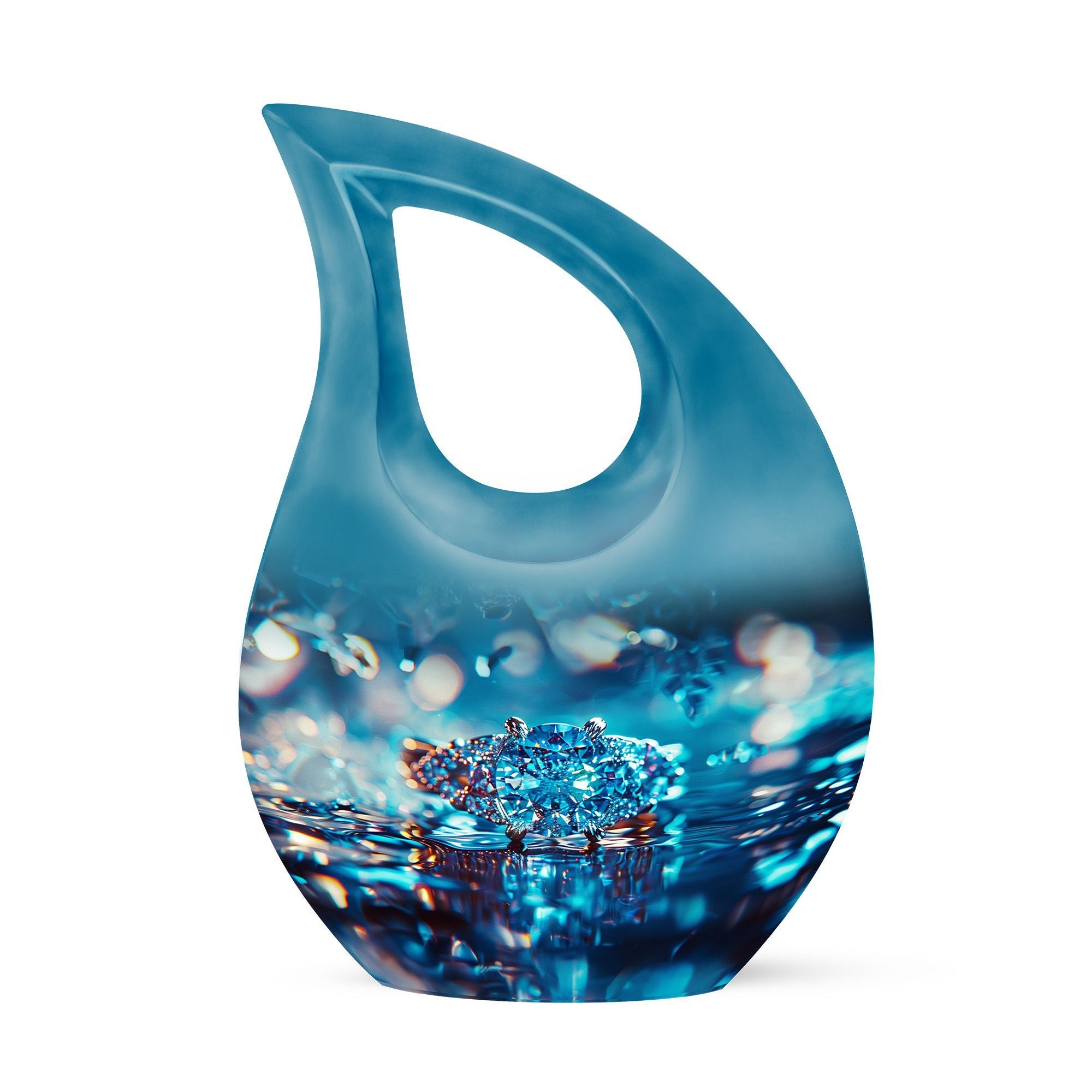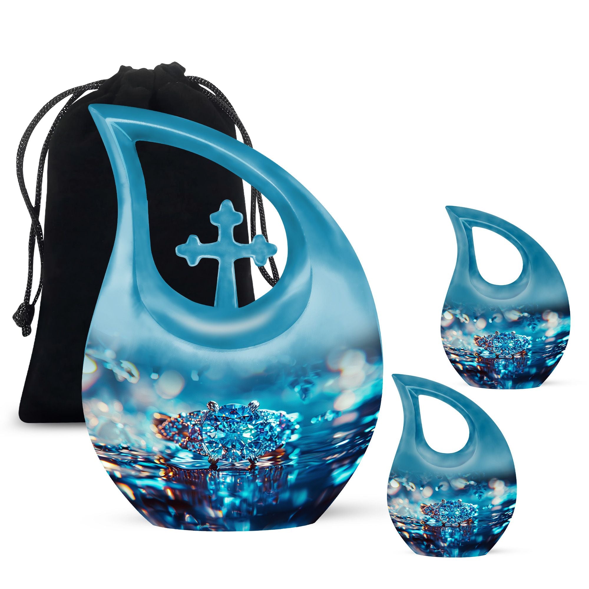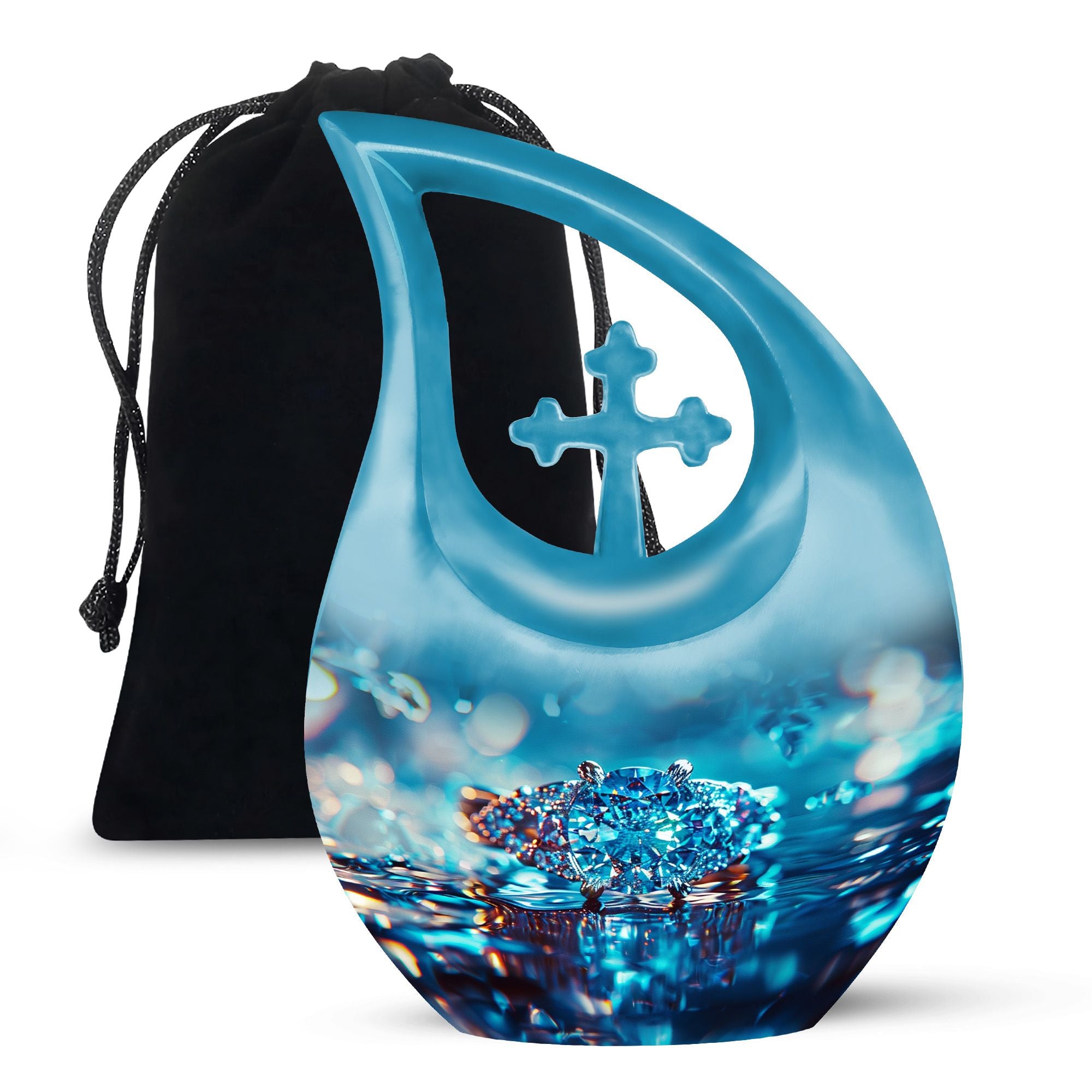 Cherish the memory of your dear ones with this exquisite Ring Urn. Crafted from robust and long-lasting aluminium, our Unusual Urns for Ashes stand 10 inches tall with a capacity generous enough to hold 200 cubic inches. Ideal for both adults and seniors, the Large Urn weighs 3.3 pounds, embodying a sober yet touching 'Cross Drop' symbol. The Memorial Urn’s central theme is the 'Ring' and it arrives neatly packaged in a velvet pouch for respectful containment of ashes. To make this Beautiful Urn truly unique, avail yourself of our customization service and have it inscribed with your loved one's names. Whether you are seeking a decorative urn to honor the memory of a mother (Custom Mom Urn) or looking for a dignified Ashes Keepsake for a man, our product promises to meet your emotional and aesthetic requirements. Equally worthy of consideration as a solemn tribute or a tasteful piece of decor, our distinct Ring Urn offers a meaningful choice amid Memorial Ceremony Supplies.