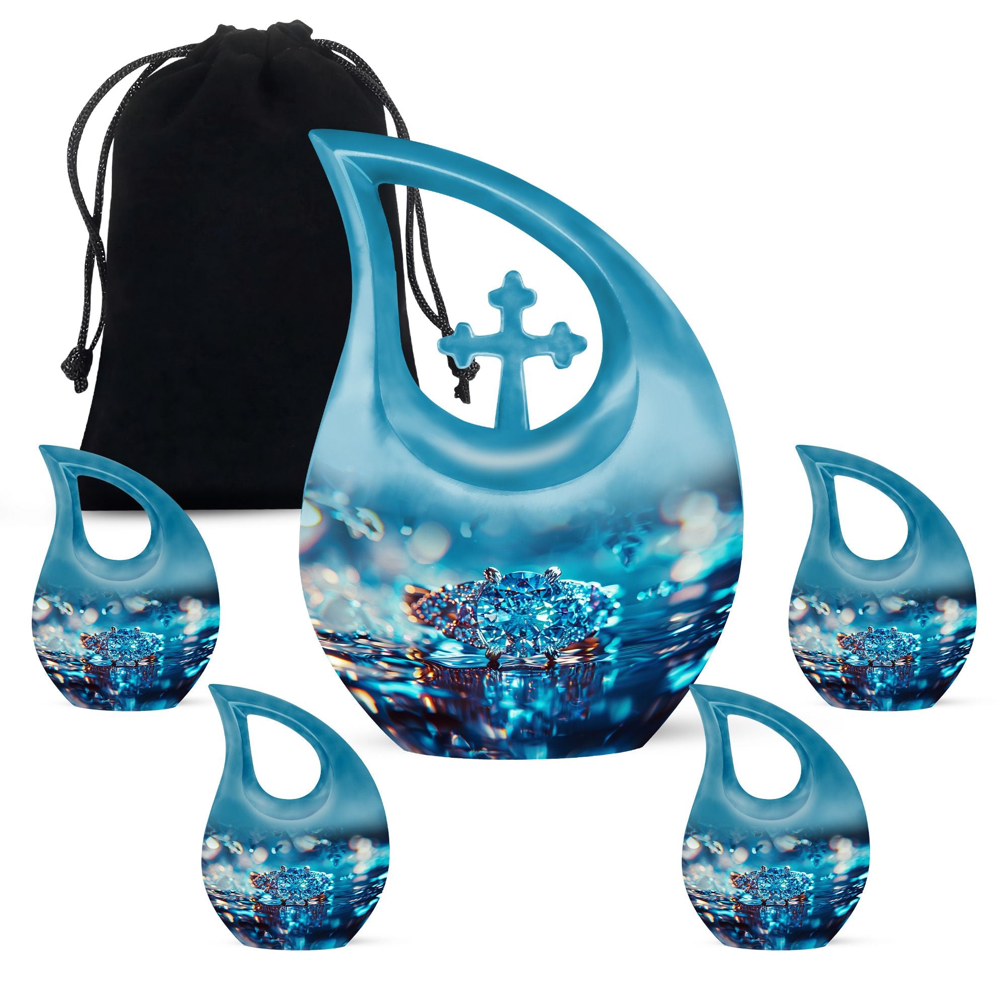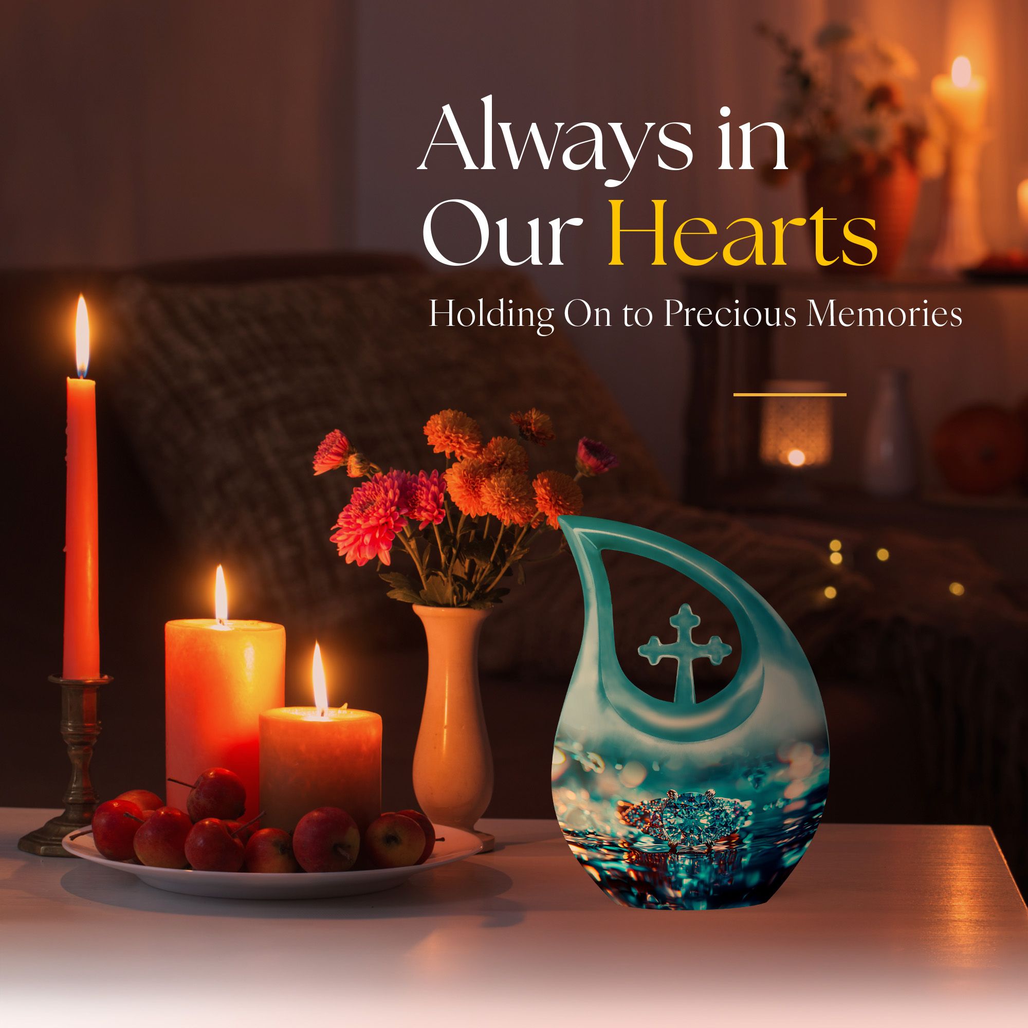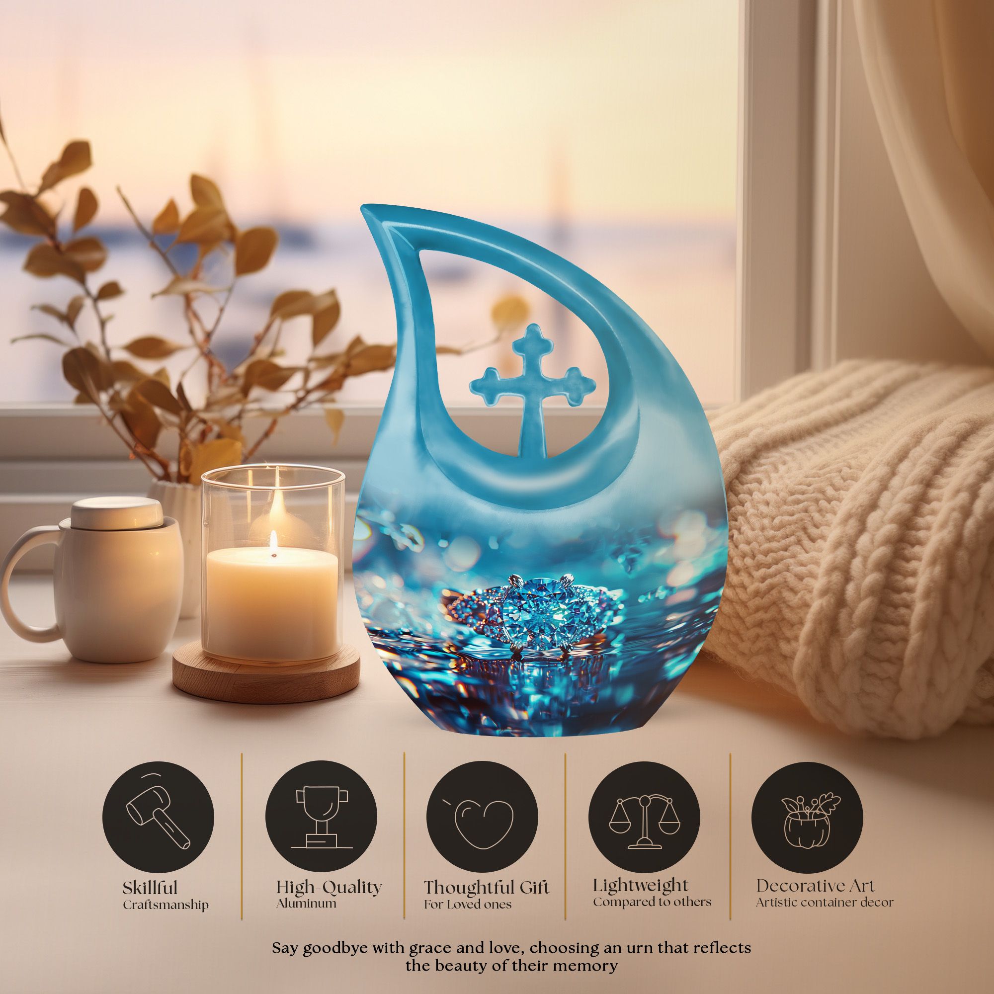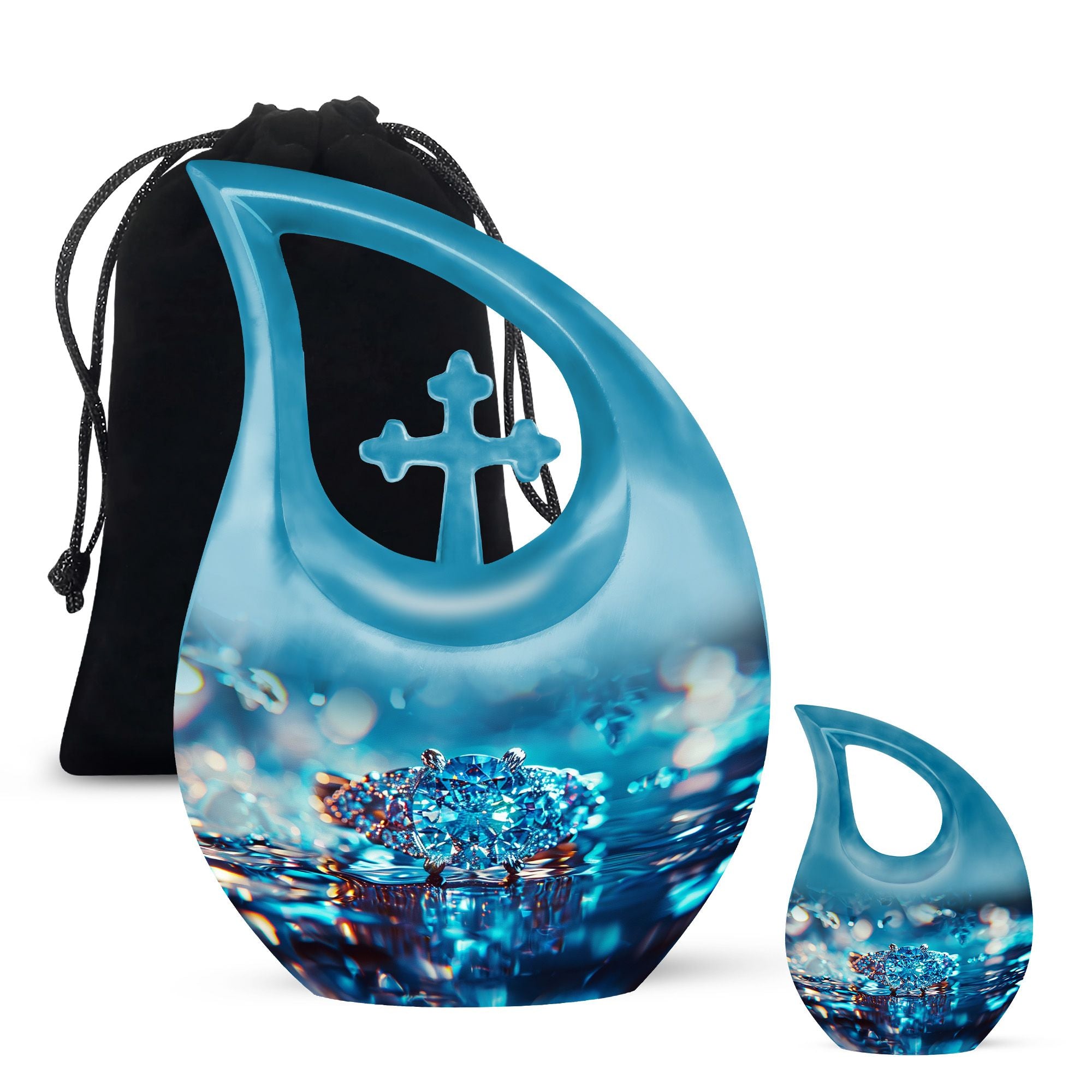 Cherish the memory of your dear ones with this exquisite Ring Urn. Crafted from robust and long-lasting aluminium, our Unusual Urns for Ashes stand 10 inches tall with a capacity generous enough to hold 200 cubic inches. Ideal for both adults and seniors, the Large Urn weighs 3.3 pounds, embodying a sober yet touching 'Cross Drop' symbol. The Memorial Urn’s central theme is the 'Ring' and it arrives neatly packaged in a velvet pouch for respectful containment of ashes. To make this Beautiful Urn truly unique, avail yourself of our customization service and have it inscribed with your loved one's names. Whether you are seeking a decorative urn to honor the memory of a mother (Custom Mom Urn) or looking for a dignified Ashes Keepsake for a man, our product promises to meet your emotional and aesthetic requirements. Equally worthy of consideration as a solemn tribute or a tasteful piece of decor, our distinct Ring Urn offers a meaningful choice amid Memorial Ceremony Supplies.