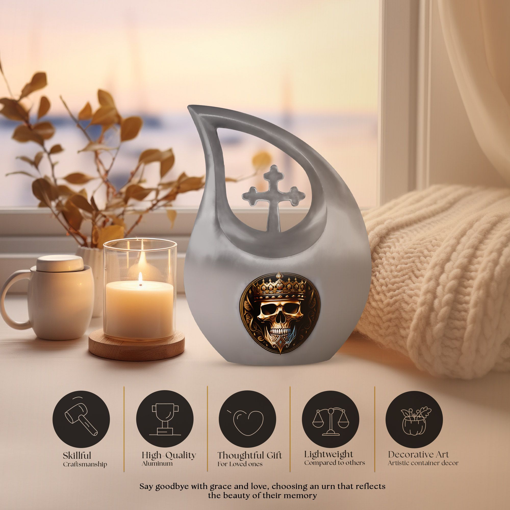 Expertly made from high-quality aluminum, this large funeral urn features intricate skull and cross motifs that blend artistry with reverence. Designed as a cremation urn large adult, it boasts a durable structure with a secure screw-top lid, ensuring ashes remain safely protected. Its premium craftsmanship and elegant finish make it a stunning large decorative urn that complements any memorial space, from home displays to columbarium niches.