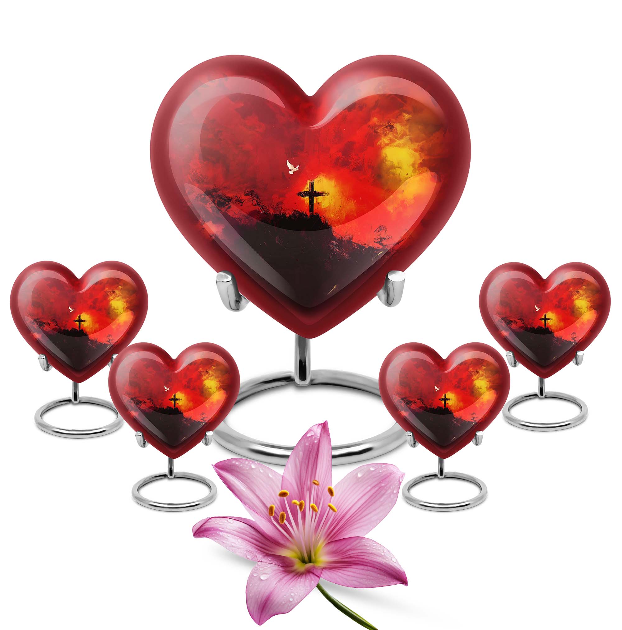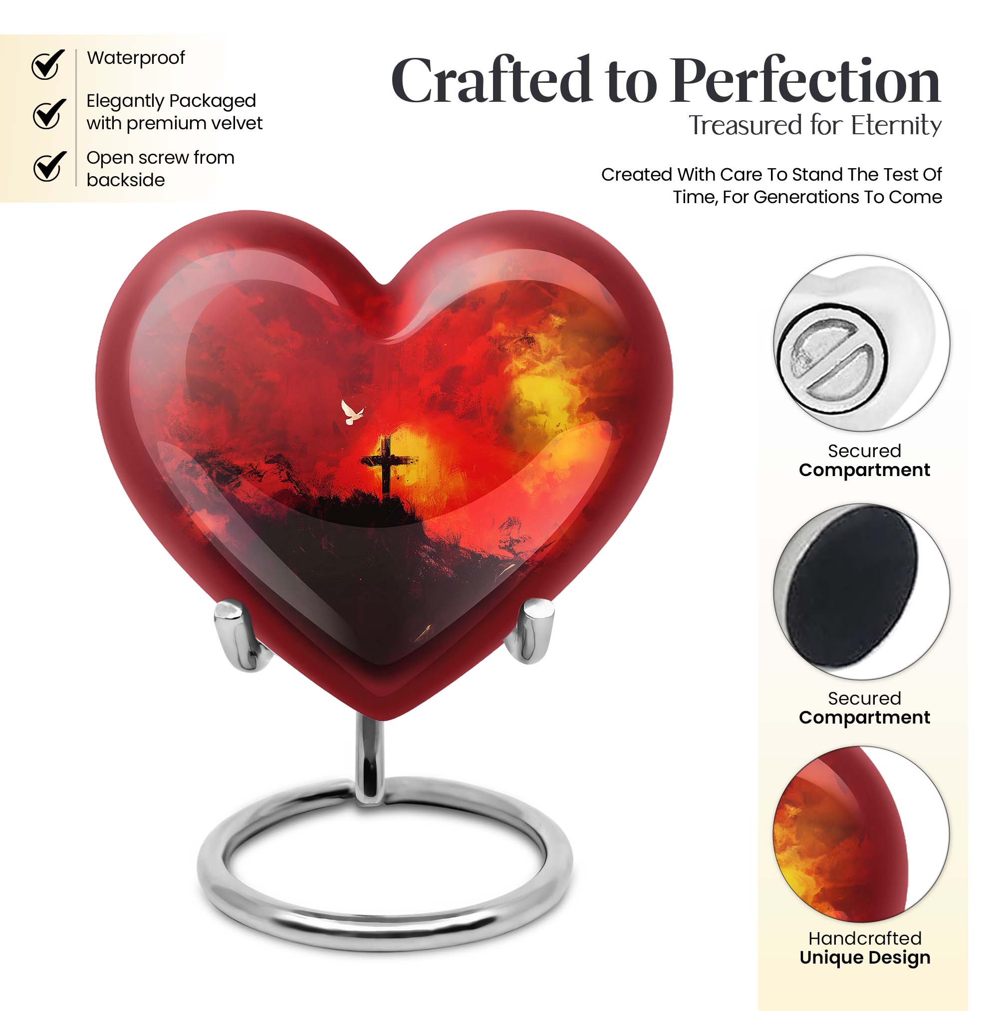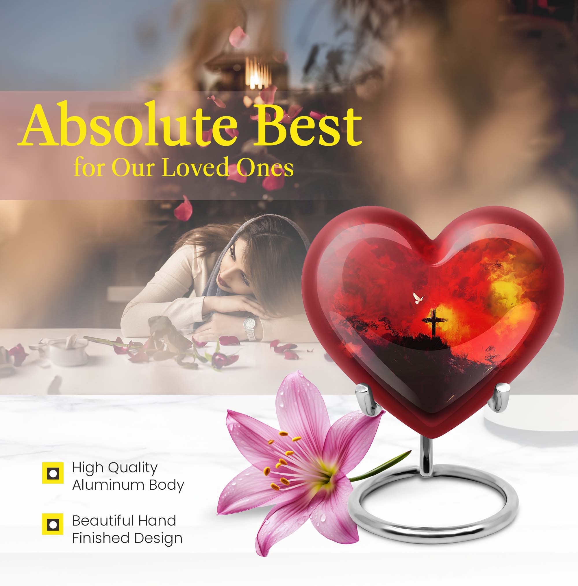 Convey your love and thoughts towards your departed loved ones with this elegant 10-inch 'Heart Urn'. Specially created for a memorable and heartfelt tribute, this cremation urn is crafted with exceptional quality aluminium, providing longevity and durability. With a weight of 3.3 pounds and dimensions of 10 inches in height, it can contain up to 200 cubic inches of ash. This large urn for human ashes beautifully captures the radiant essence of the Aurora Borealis theme, adding an ethereal touch to your memorial ceremony. The product comes with a velvet pouch for tasteful containment of the ashes. You can also personalize this cross urn by engraving names for a more tender and personal remembrance. This urn for mom, aptly termed as a 'forever urn,' sparks a beacon of solace and offers a comforting representation of life's journey that goes beyond the realm of the mortal world. Rest assured, this funeral adult urn serves as an intimate portrayal of respect and love, making it an essential item of memorial ceremony supplies.
