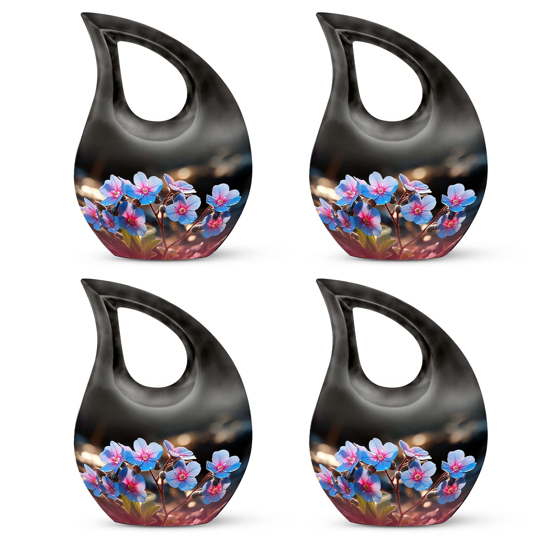 Expertly handcrafted from high-quality aluminum, each urn in the set showcases delicate blue blossom artistry and a polished finish that shines with quiet elegance. The secure screw-top lids and durable design make these cremation keepsakes for men and funeral urns for women both meaningful and enduring. This set includes one large urn for the main resting place and matching keepsakes to share among loved ones.
