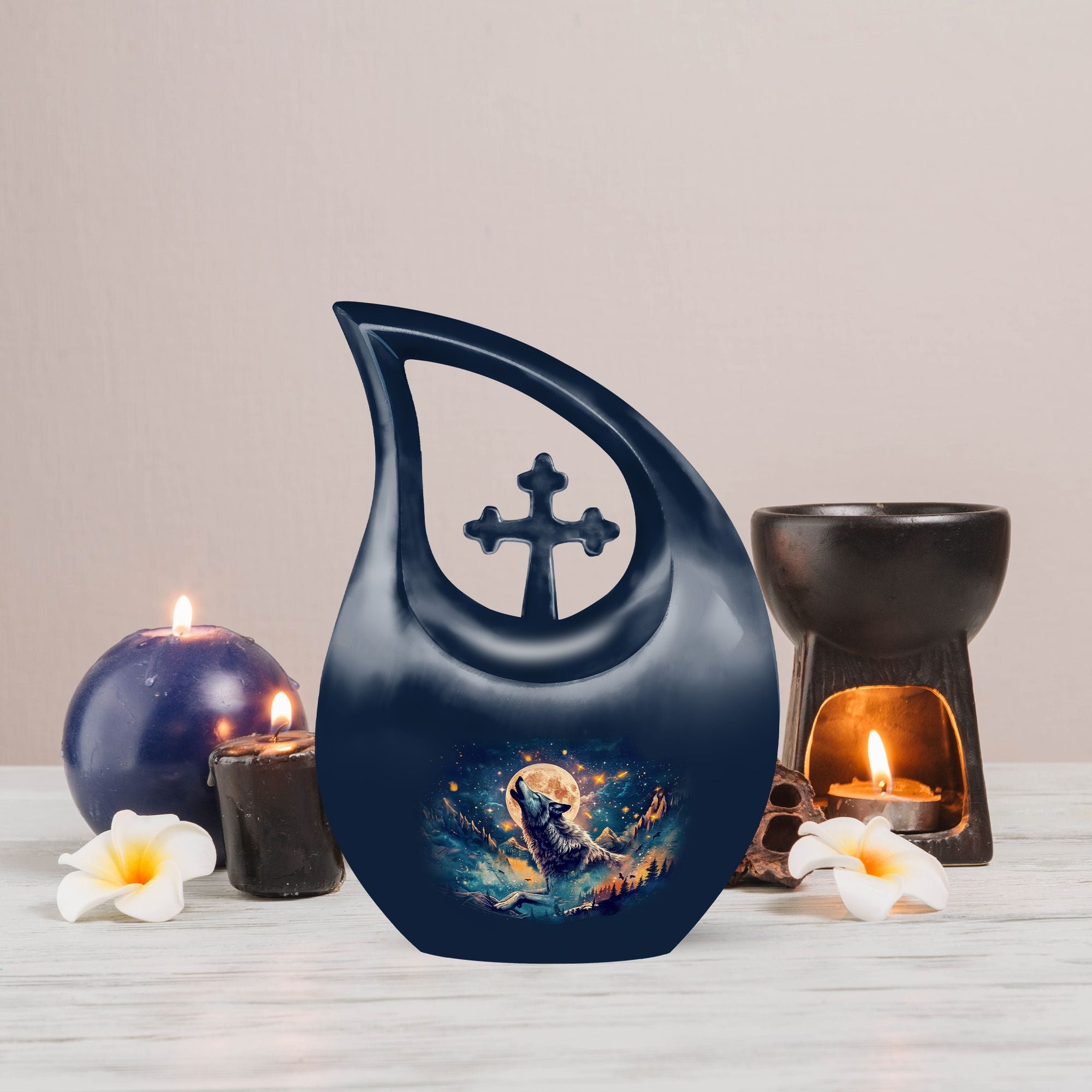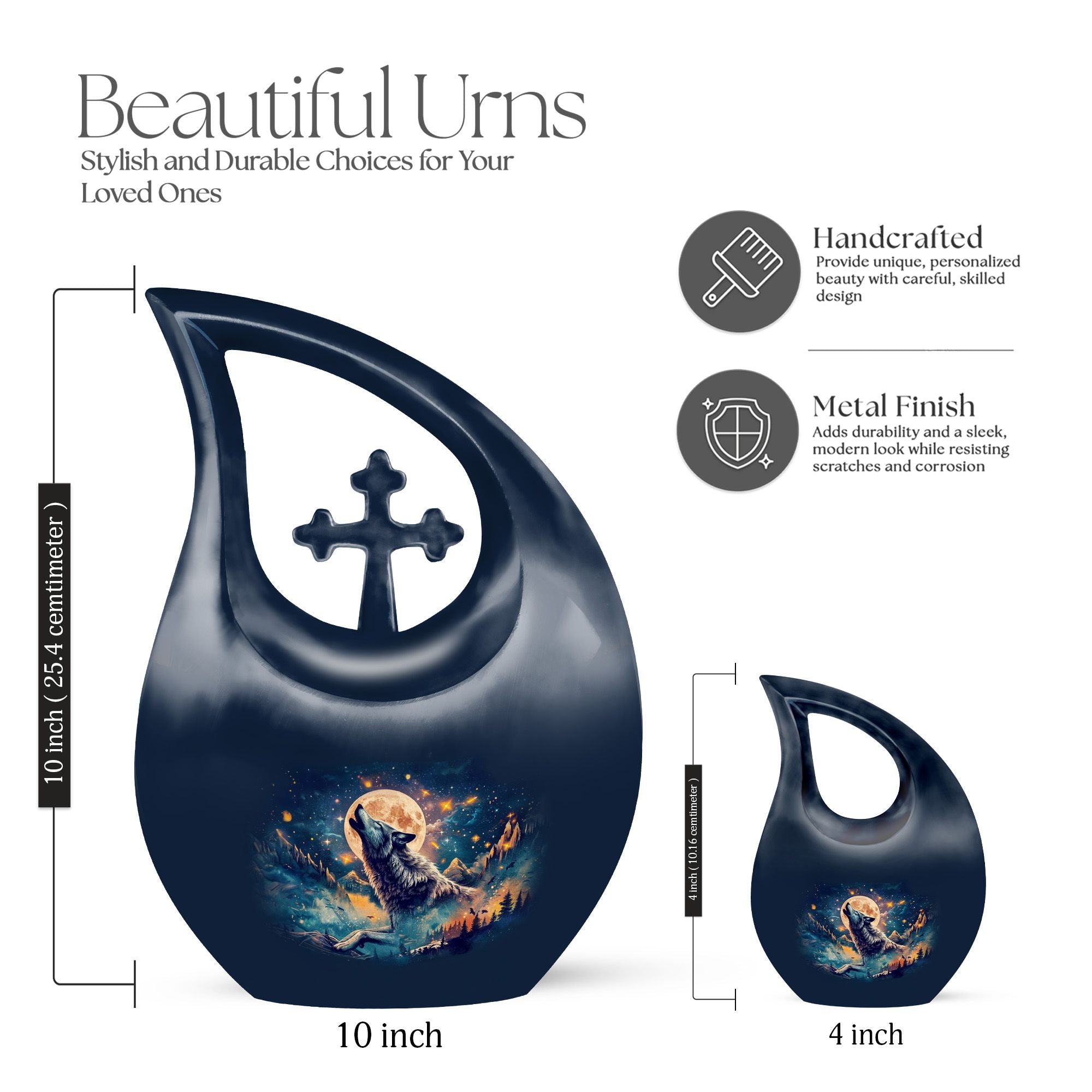 Safeguard your cherished memories with our Wolf Urn - a sentimental salute to those gone, but who still inhabit our hearts. This sturdy, 10-inch high, large cremation urn crafted in aluminium weighs a solid 3.3 pounds, thereby promising a safe haven for those precious ashes. Its capacity is an ample 200 cubic inches. The urn features a unique 'Cross Drop' design that channels a solemnly serene aura. This Wolf themed urn balances the unfamiliar with the familiar, setting it apart from conventional memorial urns. The package includes a velvet pouch to ensure the secure containment of the ashes. Looking for a more personalized touch? We offer the possibility for the urn to be engraved with names thereby giving a more intimate, yet eternal remembrance. Whether you're seeking large cremation urns, affordable urns, or cremation boxes, our collection meets diverse needs. Rest in the tranquility that our dedication to quality and attention to detail offers.