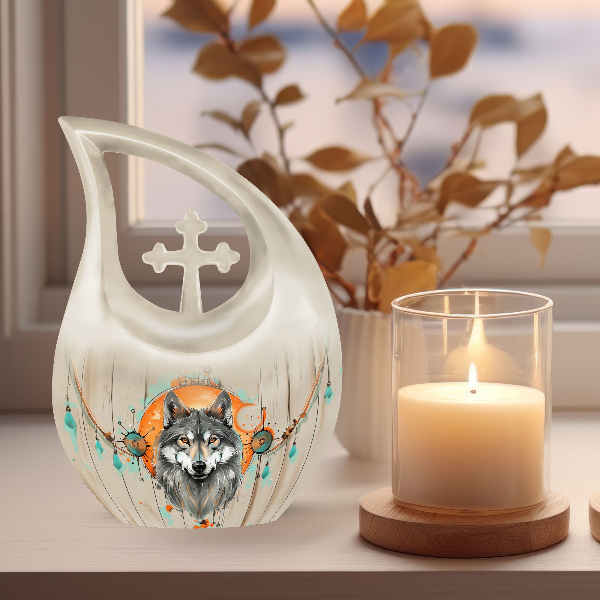 Presenting our 10-inch 'Wolf' urn, a solemn and tastefully presented memorial urn from our Large Urns collection. This thoughtful cremation container's uniqueness comes from its 'Cross Drop' theme, showcasing a delicate balance between simplicity and profound emotion. It's meticulously crafted from robust aluminium, ensuring longevity. Weighing 3.3 pounds and standing a proud 10 inches tall, this urn comfortably holds up to 200 cubic inches of ashes. We provide a plush velvet pouch with every purchase, making containment and transport of remains dignified and hassle-free. Add a personal touch with our customization option that allows you to engrave names on the urn. A remarkable choice within our cremation boxes, this Wolf Urn eloquently respects and celebrates a life well-lived. Our product caters to your needs by offering an exceptional solution to commemorate your loved ones. Whether you are looking for the best urns for ashes or personalized urns for ashes, we provide astute attention to detail to meet your anticipations.
