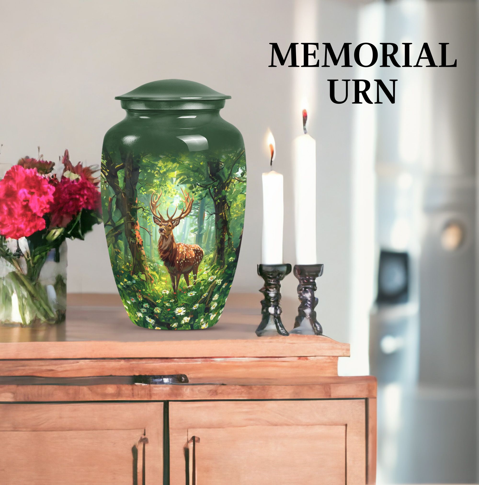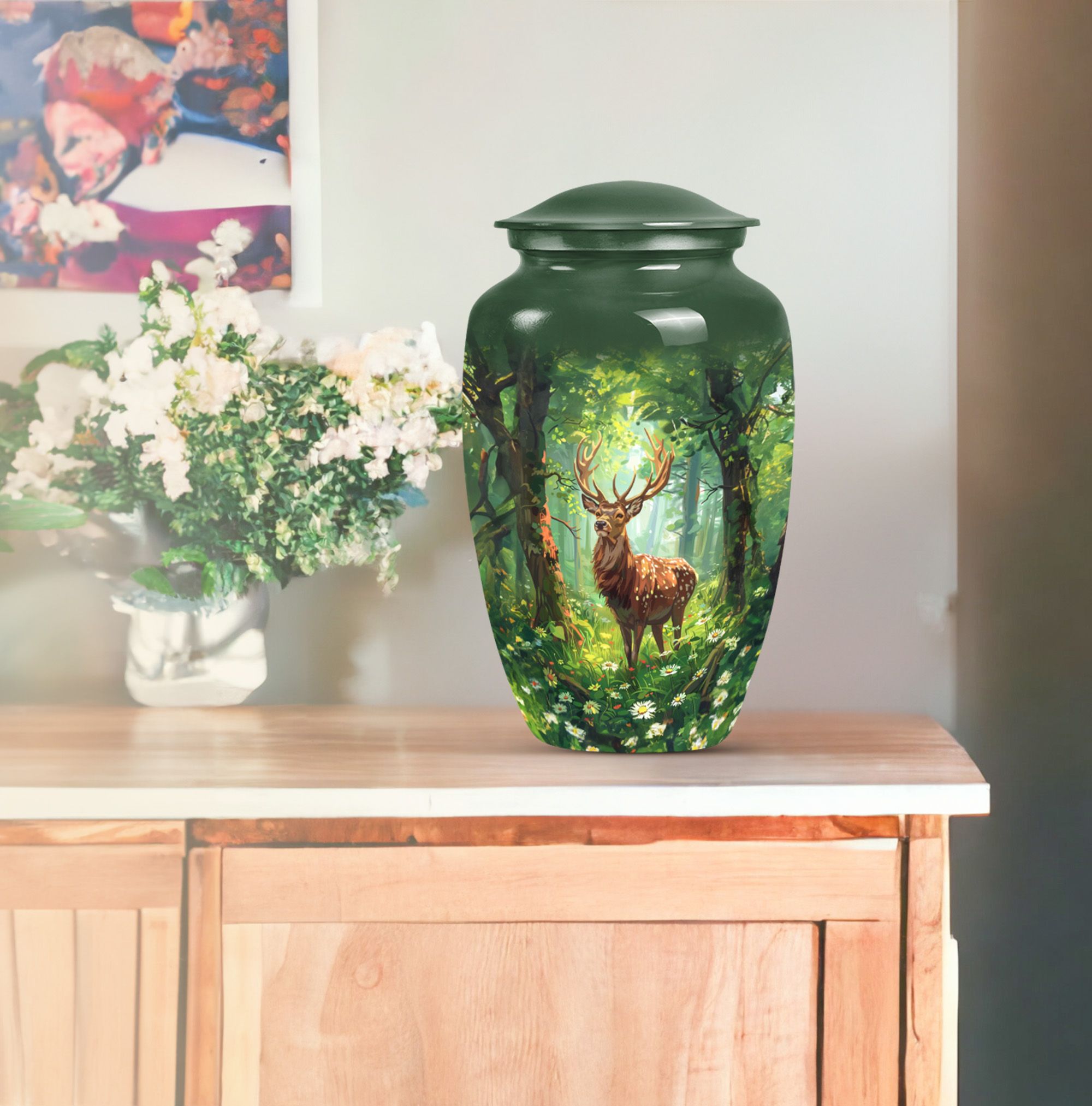Preserve memory with this deer urn, a time-honoured tribute included in our funeral urns collection for adult human ashes. Crafted from high-grade aluminium, this 10-inch, 3.3-pound cremation urn has a stunning gramophone theme that reflects a solemn, yet serene remembrance. The urn features an impressive 200 cubic inch capacity, handling the full volume of an adult's cremation ashes with dignity and respect. Beyond its significant size and weighted stability, this Large urn sets itself apart with the ability to personalize through engraved names making this urn truly one-of-a-kind. Noteworthy is the inclusion of a velvet pouch, designed for the secure containment and respectful presentation of the loved one's ashes. This urn is not merely a vessel, but a significant memorial piece that captures unwavering love and respect for the departed. It powerfully stands as an 'Innovative Modern Urn for Human Ashes', designed to evoke reverence and tranquillity.