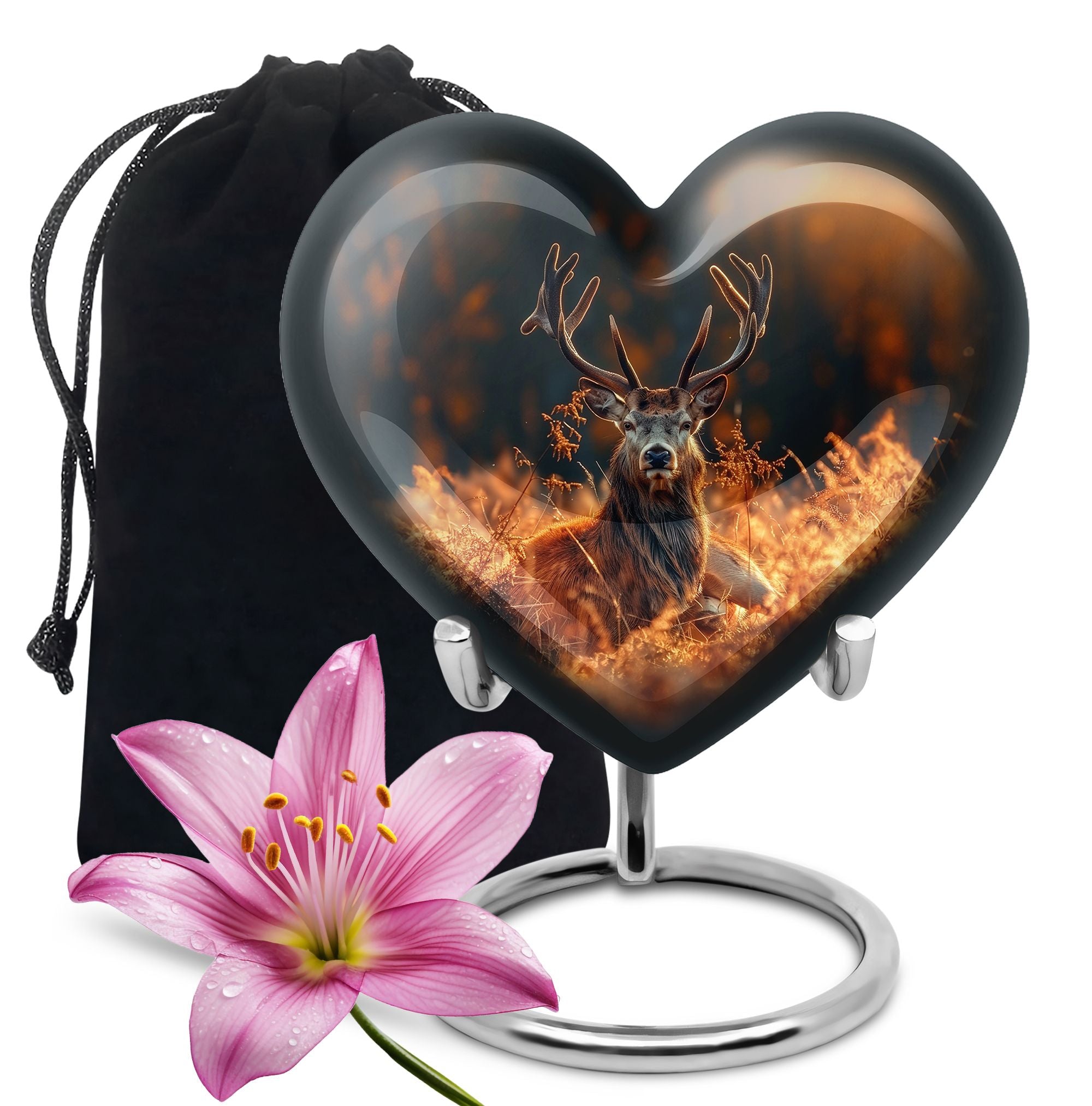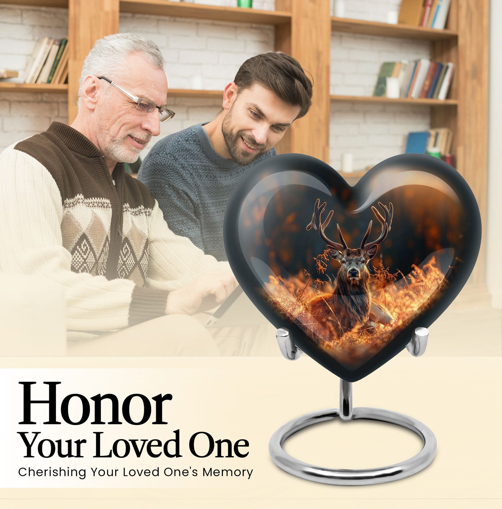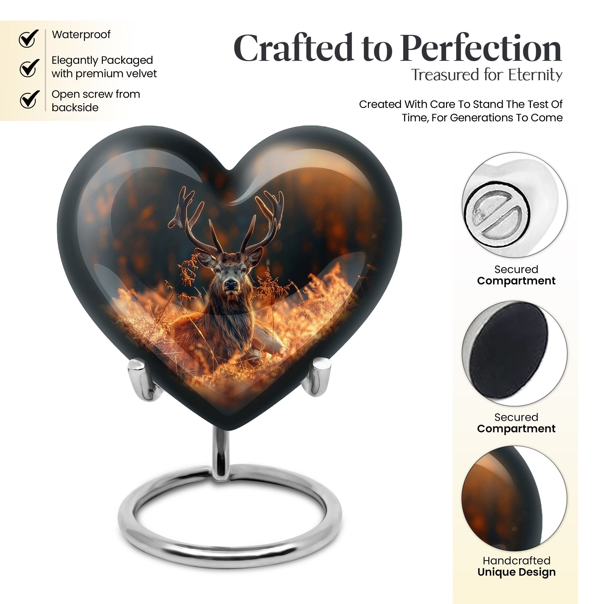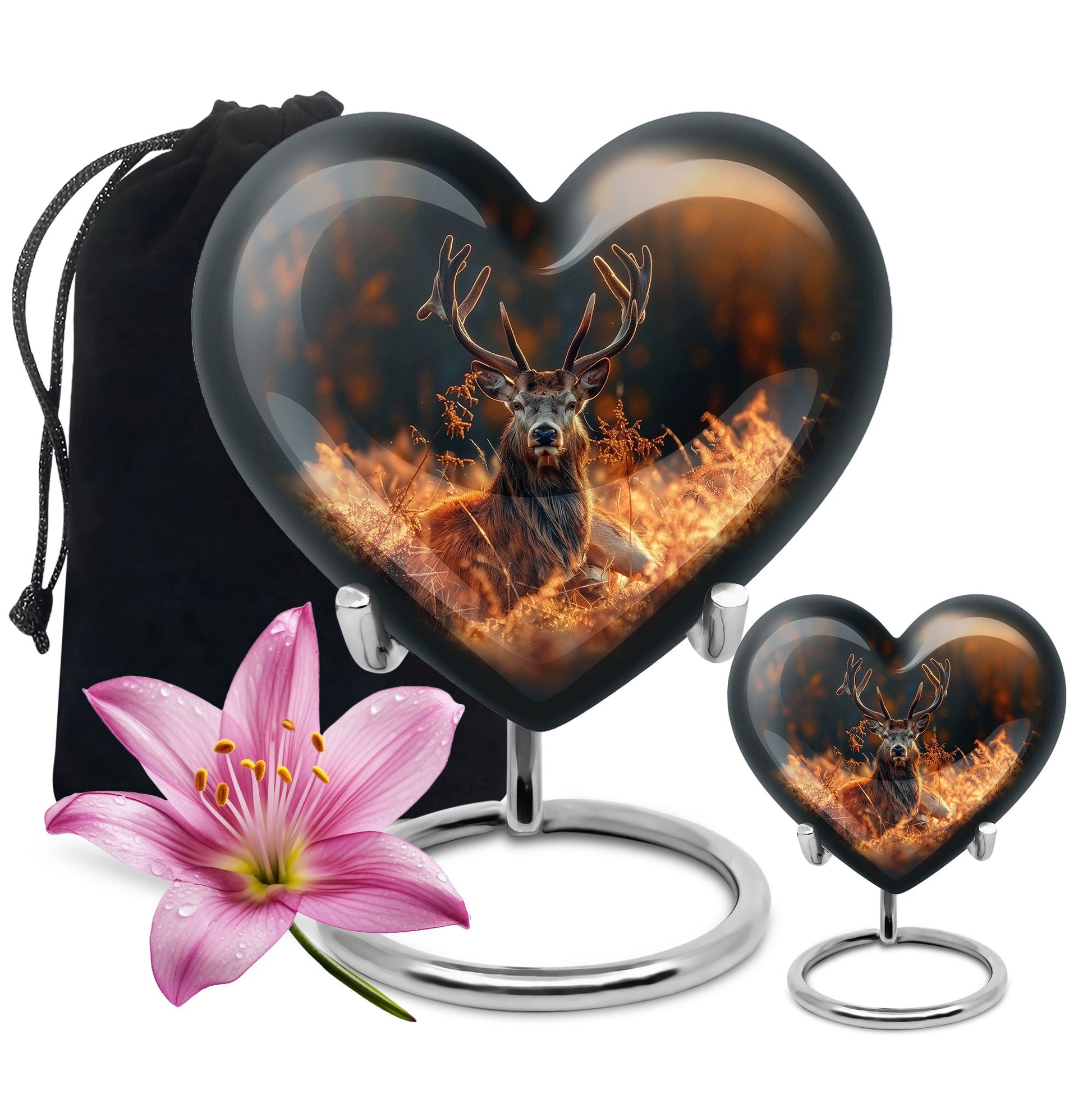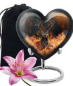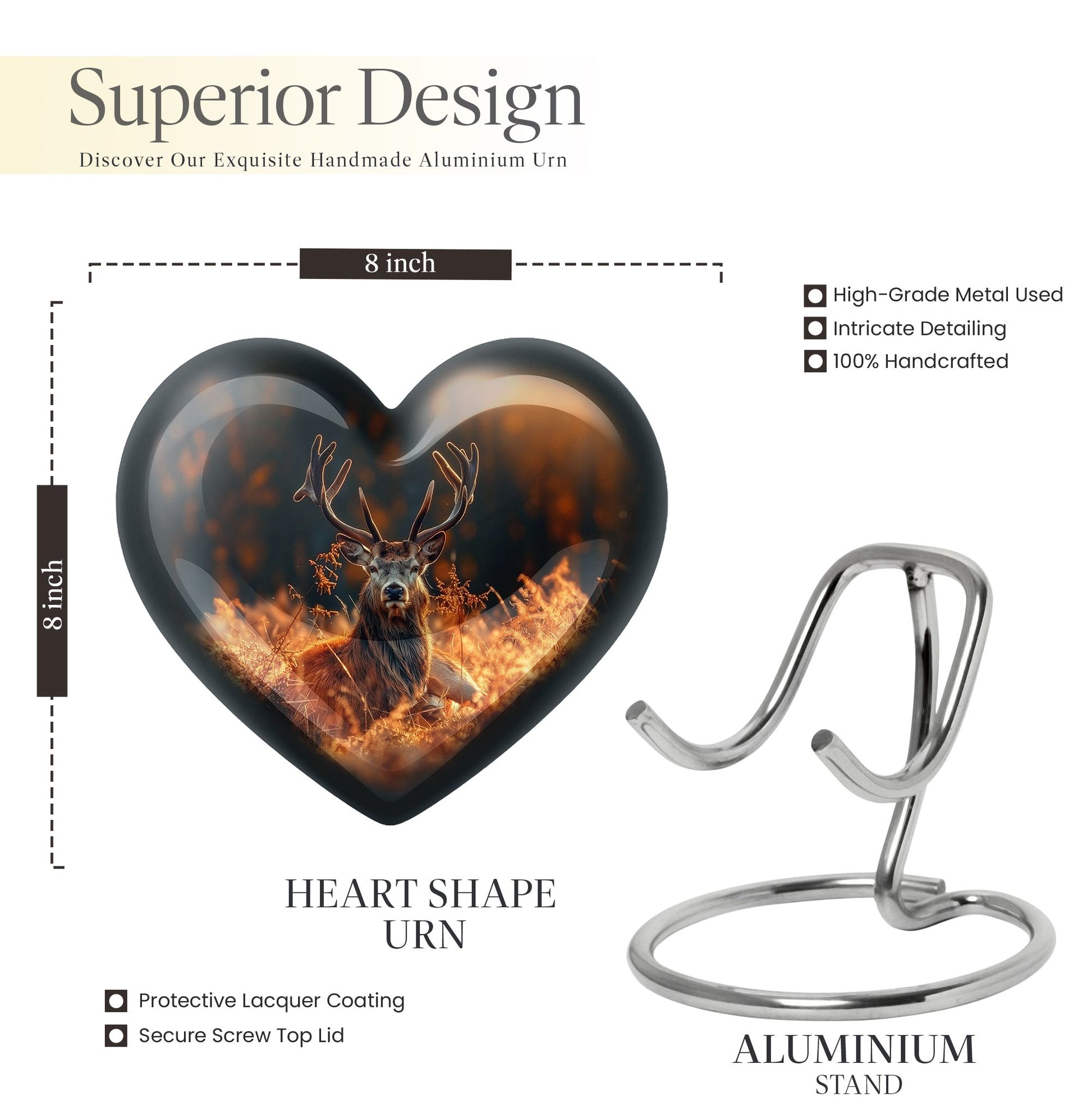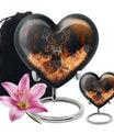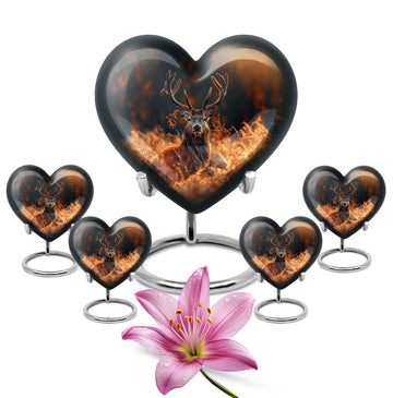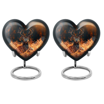 Honor your departed loved ones and preserve their cherished memory with this thoughtfully designed 'deer urn'. This large aluminum 'Heart Urn', standing tall at 10 inches, embodies the affectionate love with its exquisite Gramophone theme, delicately sculpted to encapsulate both beauty and dignity. Its deep capacity of 200 cubic inches ensures a spacious sanctuary for ash containment. Within the package, a complimentary velvet pouch is provided for optimal safeguarding, adding a touch of finesse. Further enhancing its uniqueness is the option to personalize, providing the scope to engrave cherished names; thus making this cremation urn a special memorial piece. With a firm weight of 3.3 pounds, this urn not only symbolizes eternal care but also is the testament of durability. Explore our collection of memorial urns and find this stylish 'cremation urns for men' that doubles as a tasteful tribute to the departed souls. A classic choice for cremation ashes, this urn perfectly integrates sentimentality with aesthetics.