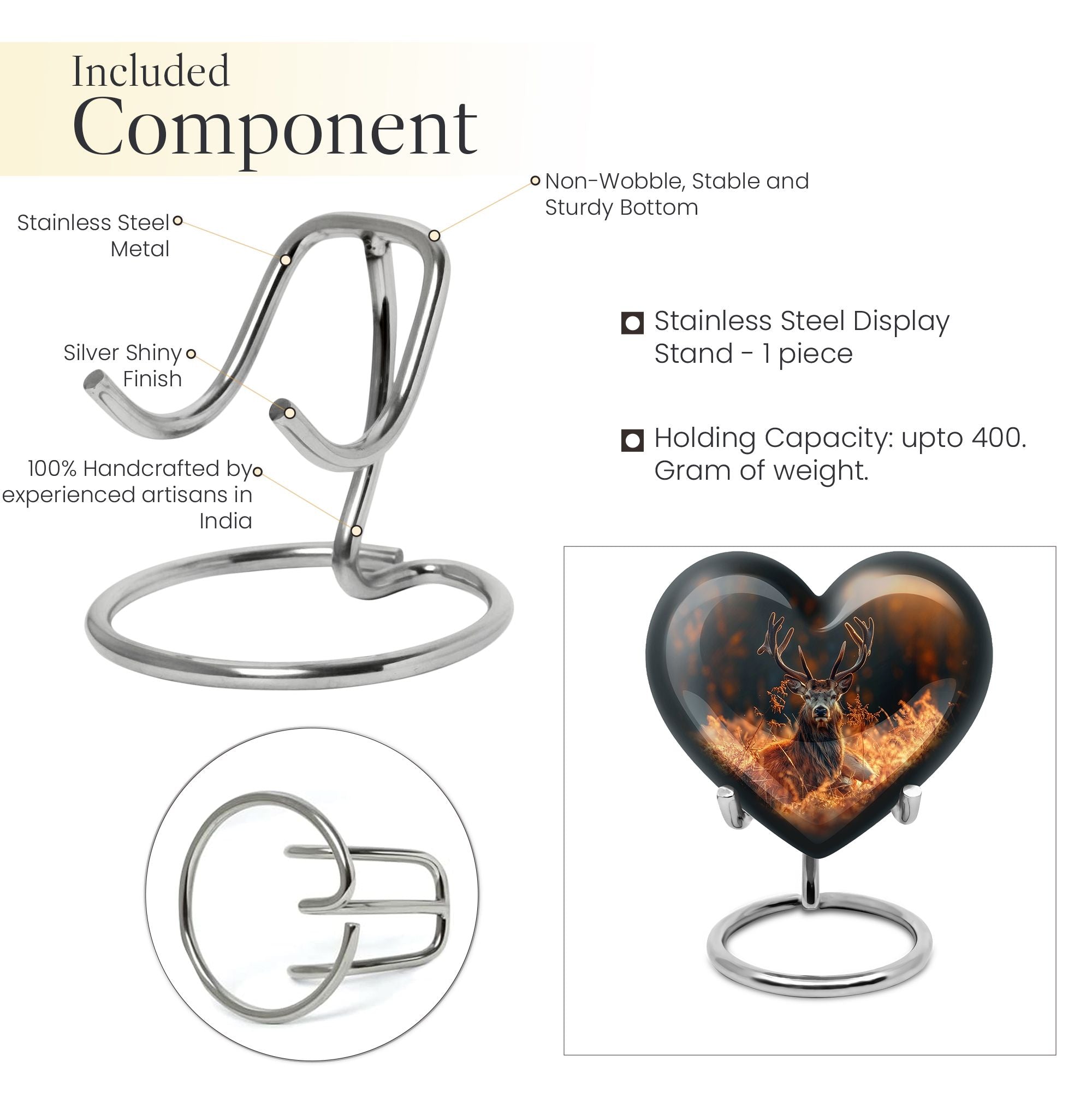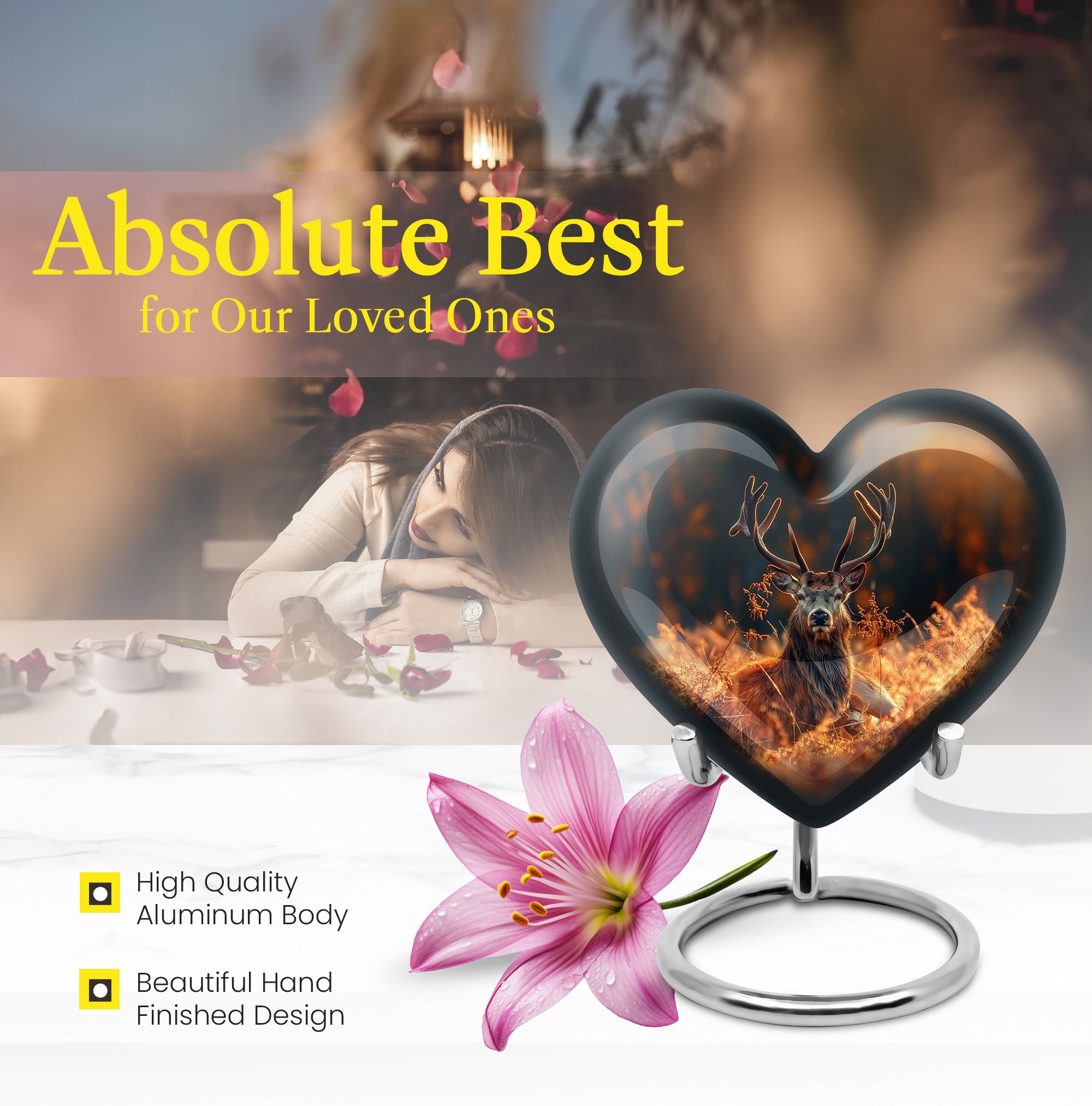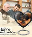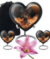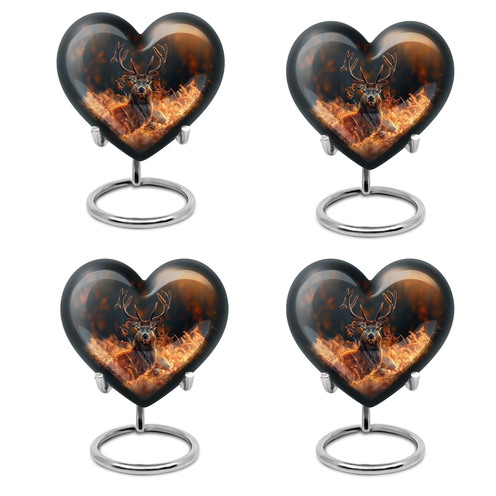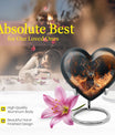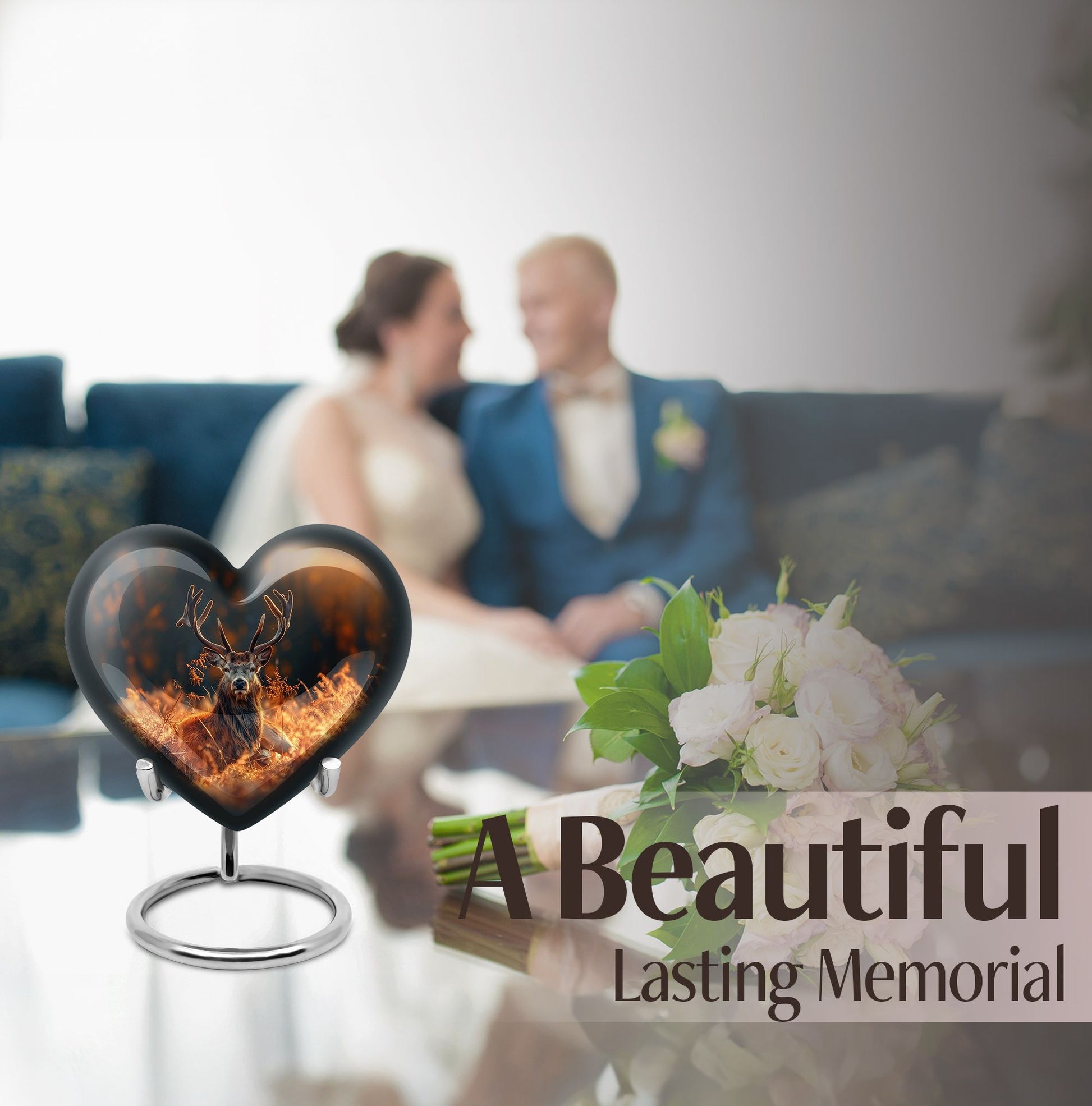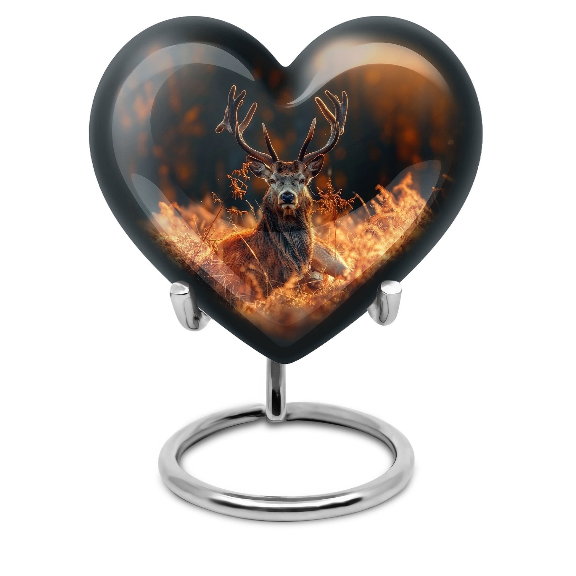 Honor your departed loved ones and preserve their cherished memory with this thoughtfully designed 'deer urn'. This large aluminum 'Heart Urn', standing tall at 10 inches, embodies the affectionate love with its exquisite Gramophone theme, delicately sculpted to encapsulate both beauty and dignity. Its deep capacity of 200 cubic inches ensures a spacious sanctuary for ash containment. Within the package, a complimentary velvet pouch is provided for optimal safeguarding, adding a touch of finesse. Further enhancing its uniqueness is the option to personalize, providing the scope to engrave cherished names; thus making this cremation urn a special memorial piece. With a firm weight of 3.3 pounds, this urn not only symbolizes eternal care but also is the testament of durability. Explore our collection of memorial urns and find this stylish 'cremation urns for men' that doubles as a tasteful tribute to the departed souls. A classic choice for cremation ashes, this urn perfectly integrates sentimentality with aesthetics.