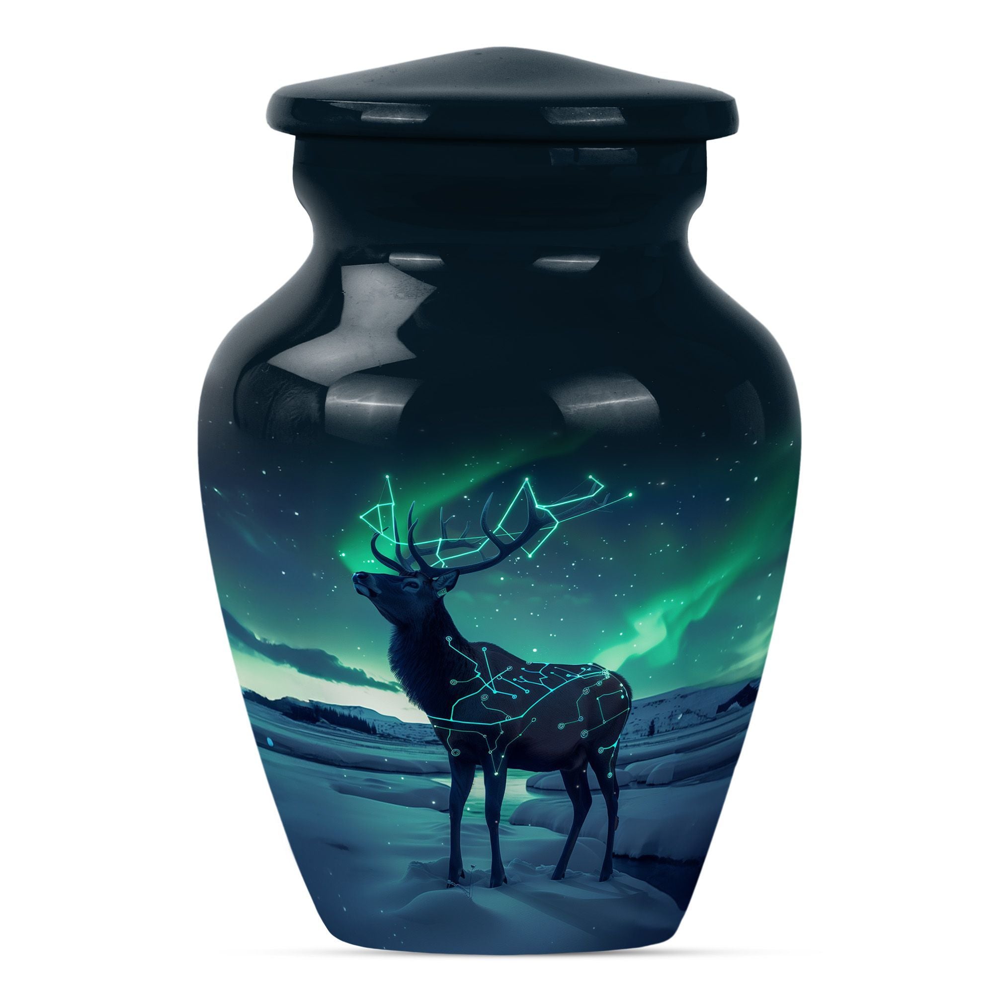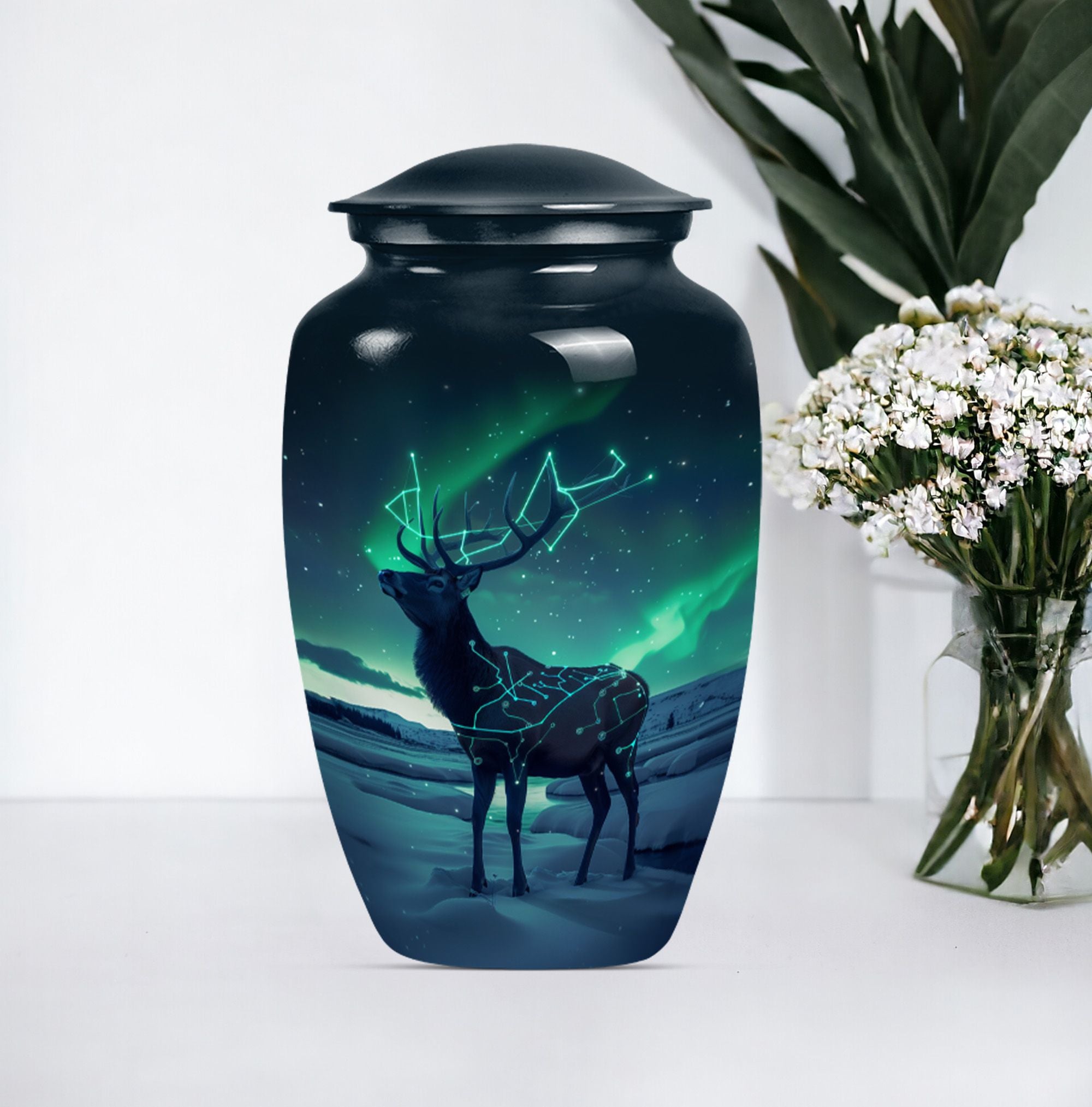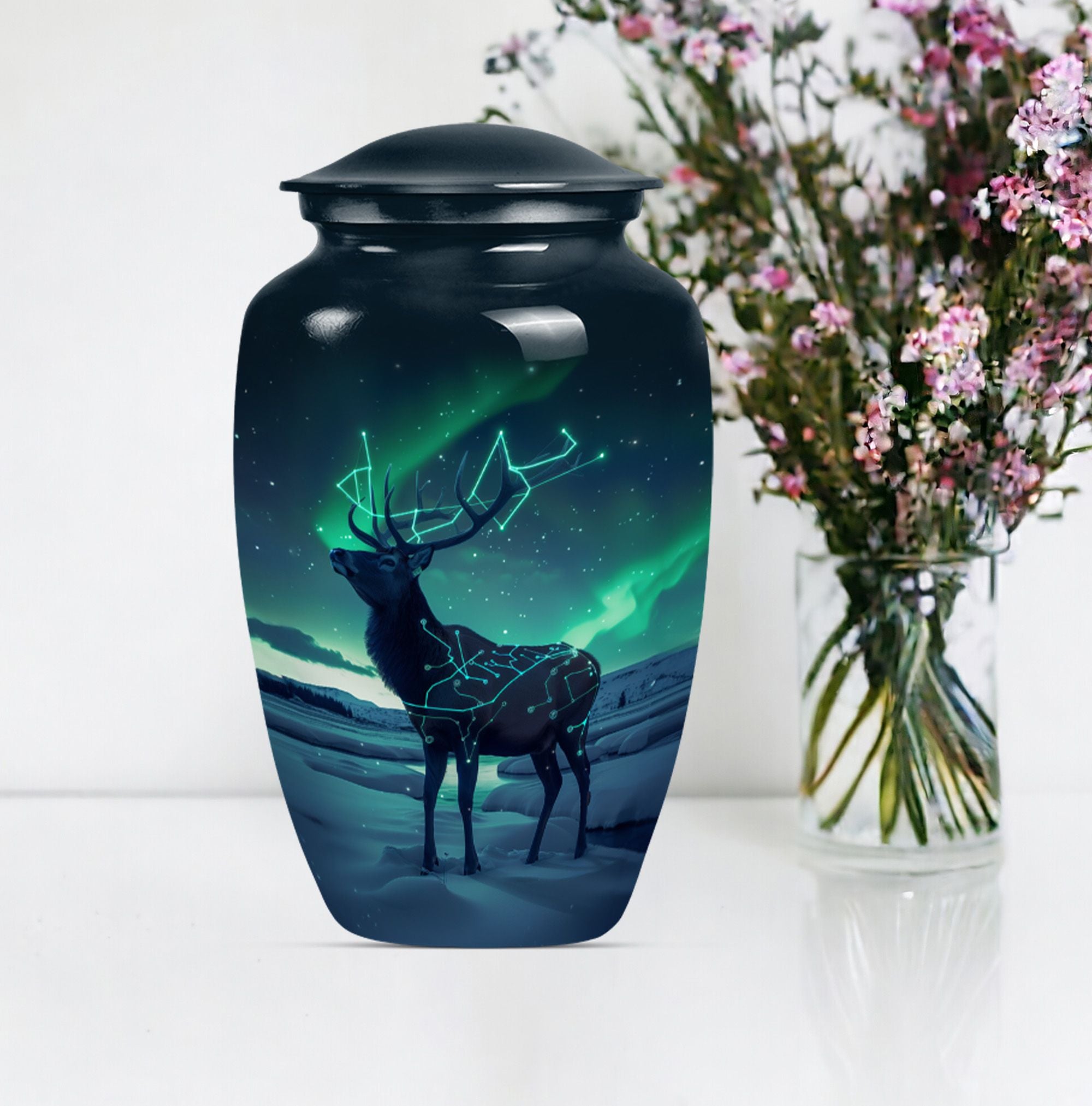Redefine your beloved's final resting place with our large 10 Inch wolf howling-themed cremation urn exclusively designed for senior adults. Handmade and meticulously crafted from superior-quality aluminium, this funeral urn promises durability and elegance. It is adept to hold 200 cubic inches of remains, making it ideal urns for both dad and mom. Weighing merely 3.3 pounds, it presents a convenient option for preserving the ashes. The urn features personalization options where you can engrave names to commemorate your dear ones. Your purchase includes a velvet pouch, ensuring secure containment of the cherished ashes. Words like 'deer Urn,' 'cremation urns for mom,' 'funeral urns for adult male dad,' 'urns for cremation ashes,' add significance to its purpose, and can be effectively used when searching for such an essential ceremonial supply. This uniquely themed cremation urn will offer a peaceful remembrance of your loved ones.
