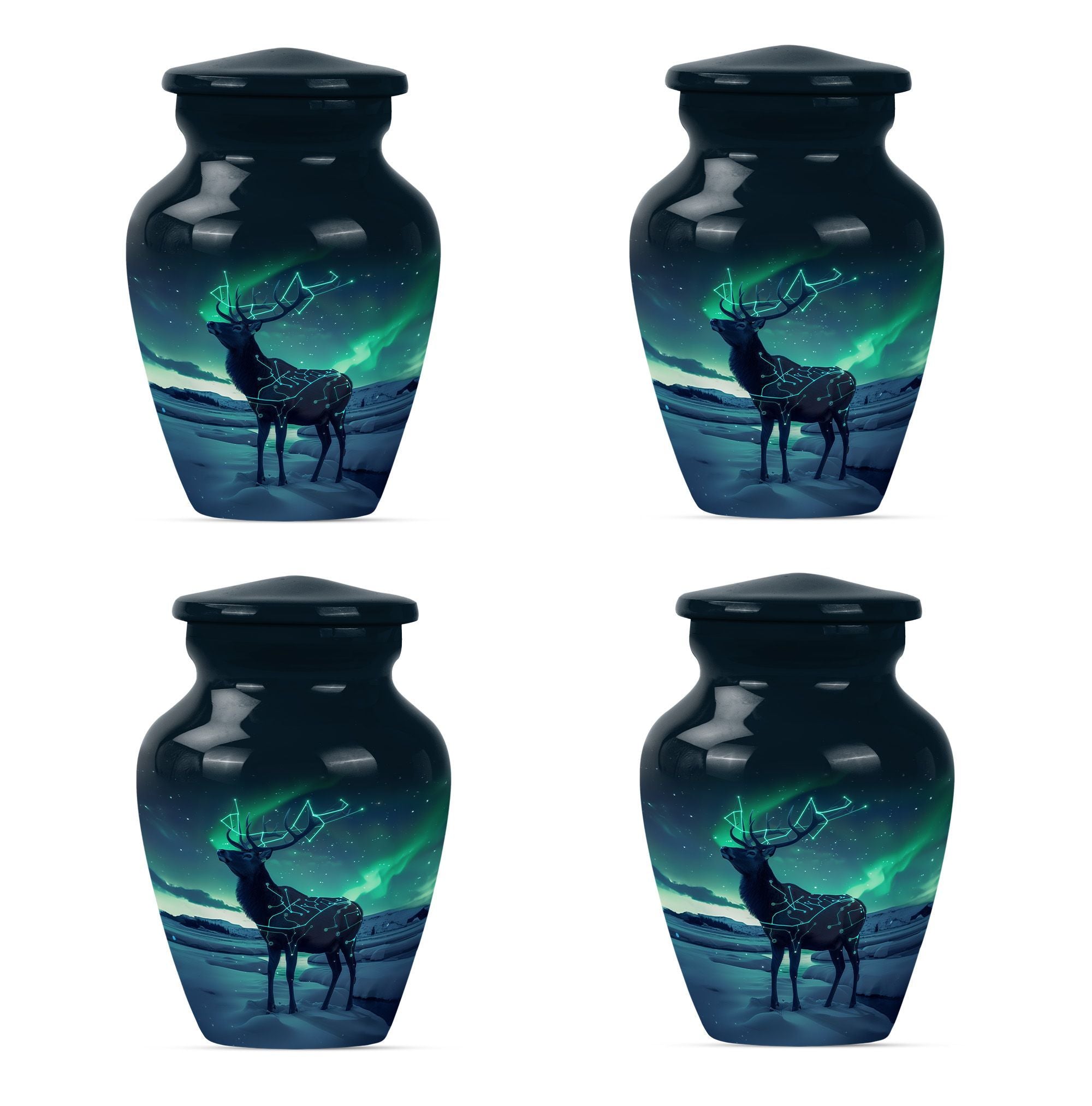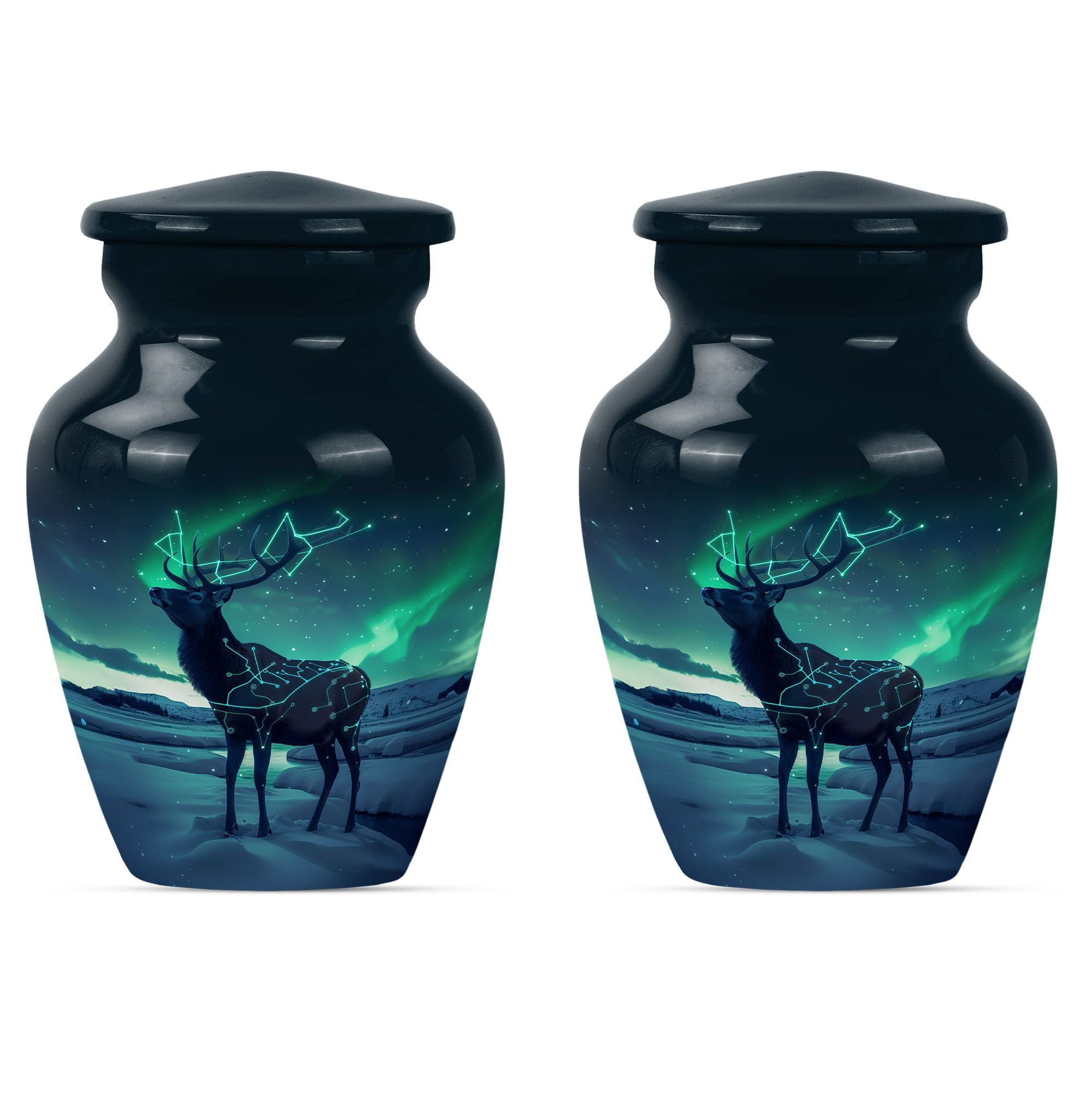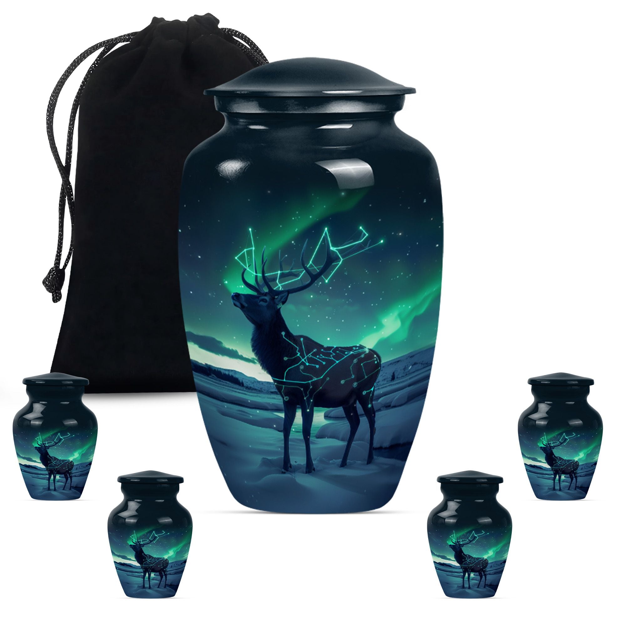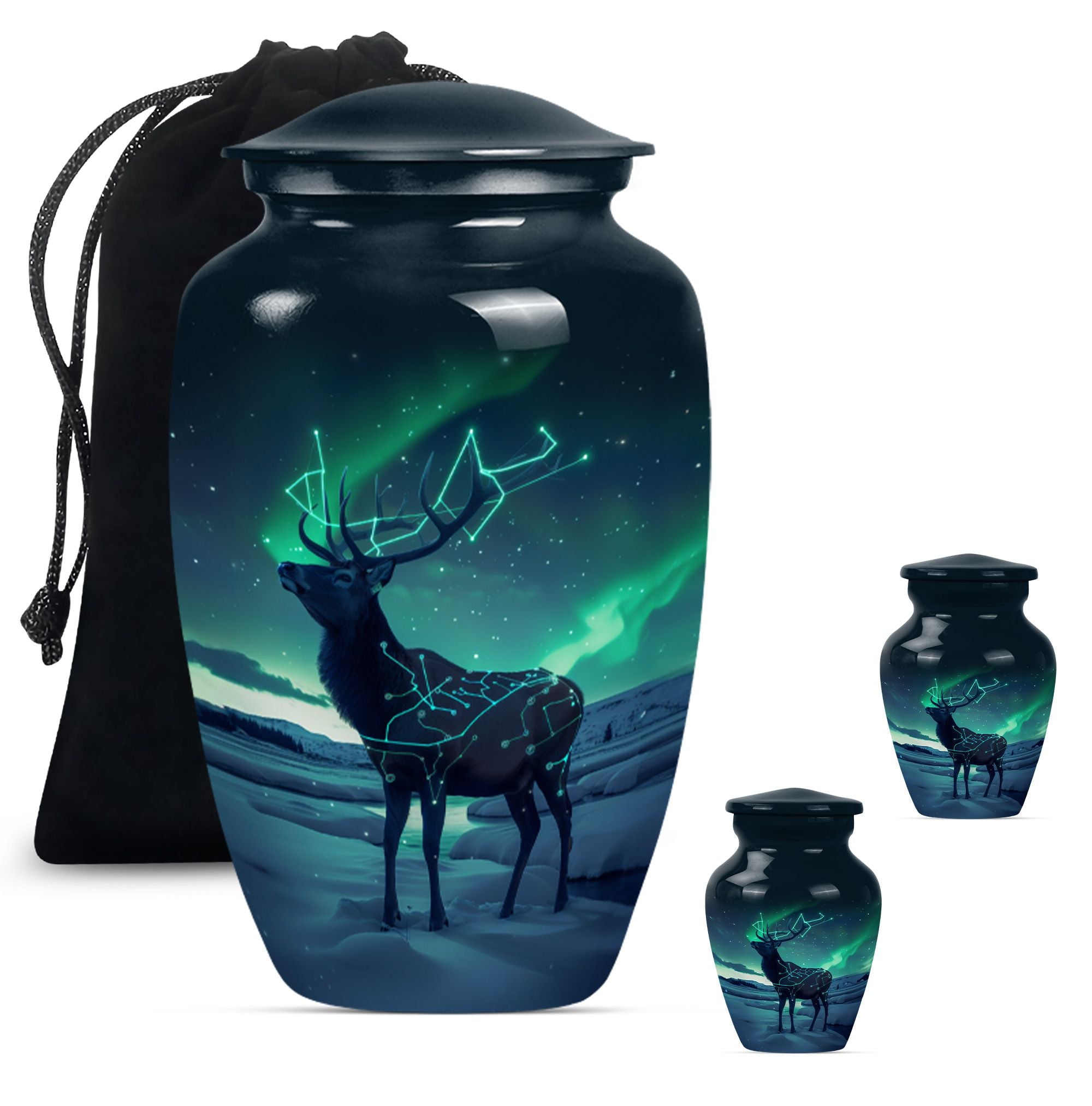 Redefine your beloved's final resting place with our large 10 Inch wolf howling-themed cremation urn exclusively designed for senior adults. Handmade and meticulously crafted from superior-quality aluminium, this funeral urn promises durability and elegance. It is adept to hold 200 cubic inches of remains, making it ideal urns for both dad and mom. Weighing merely 3.3 pounds, it presents a convenient option for preserving the ashes. The urn features personalization options where you can engrave names to commemorate your dear ones. Your purchase includes a velvet pouch, ensuring secure containment of the cherished ashes. Words like 'deer Urn,' 'cremation urns for mom,' 'funeral urns for adult male dad,' 'urns for cremation ashes,' add significance to its purpose, and can be effectively used when searching for such an essential ceremonial supply. This uniquely themed cremation urn will offer a peaceful remembrance of your loved ones.