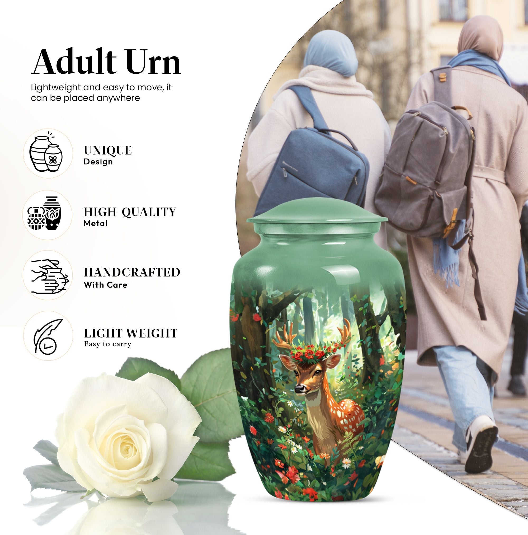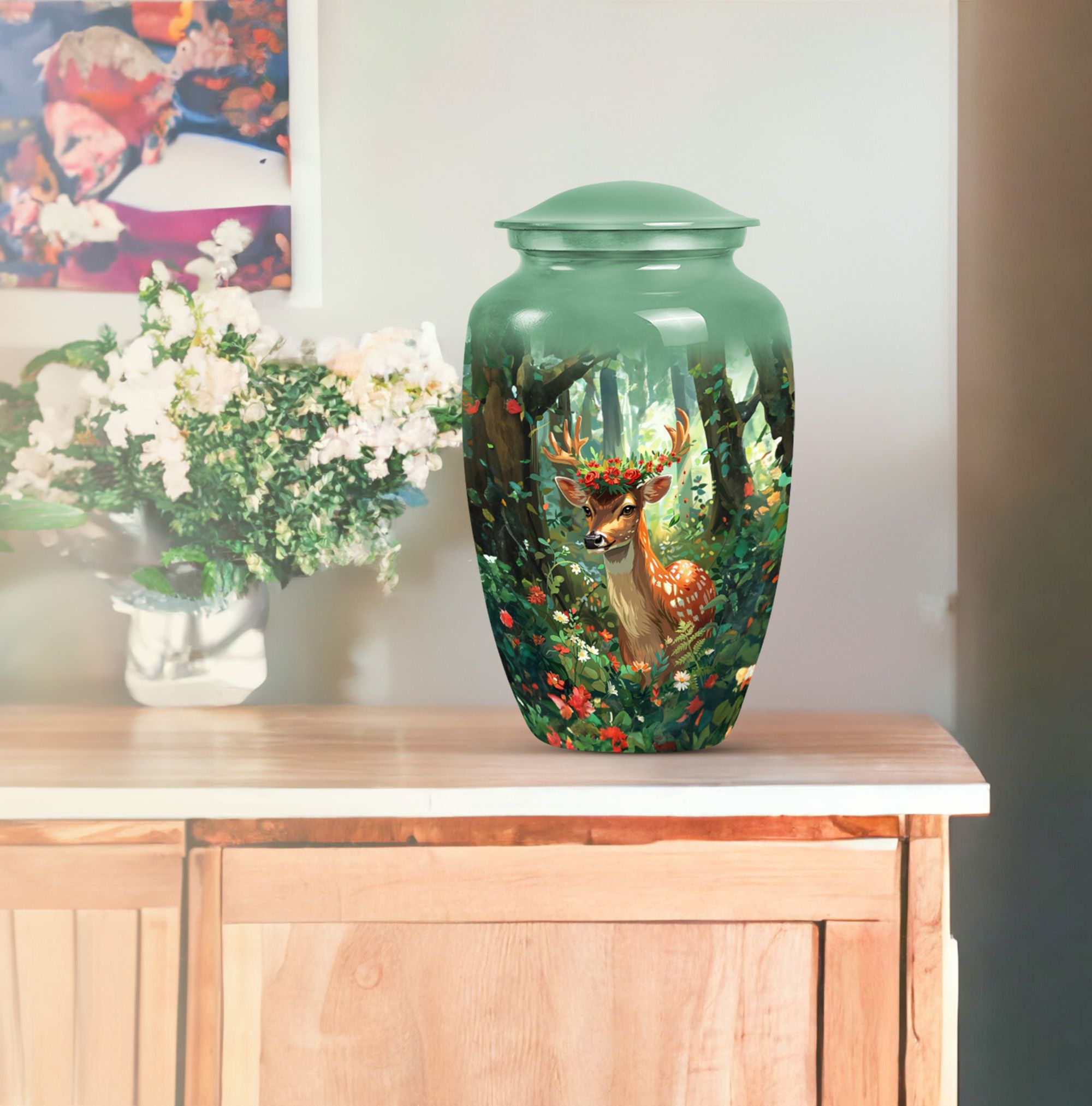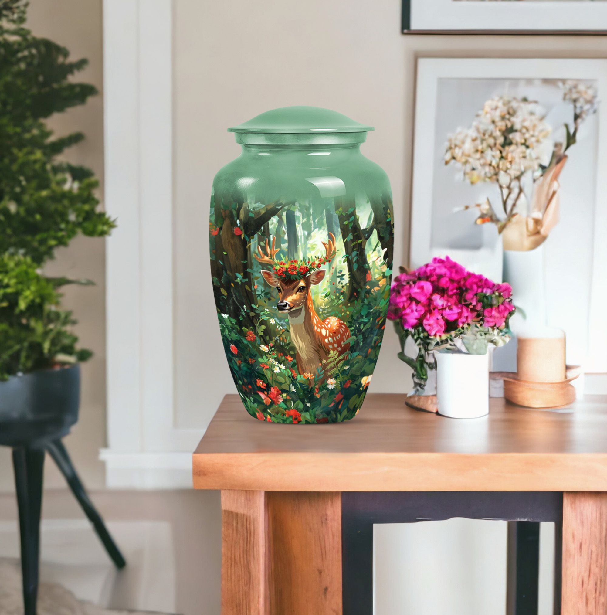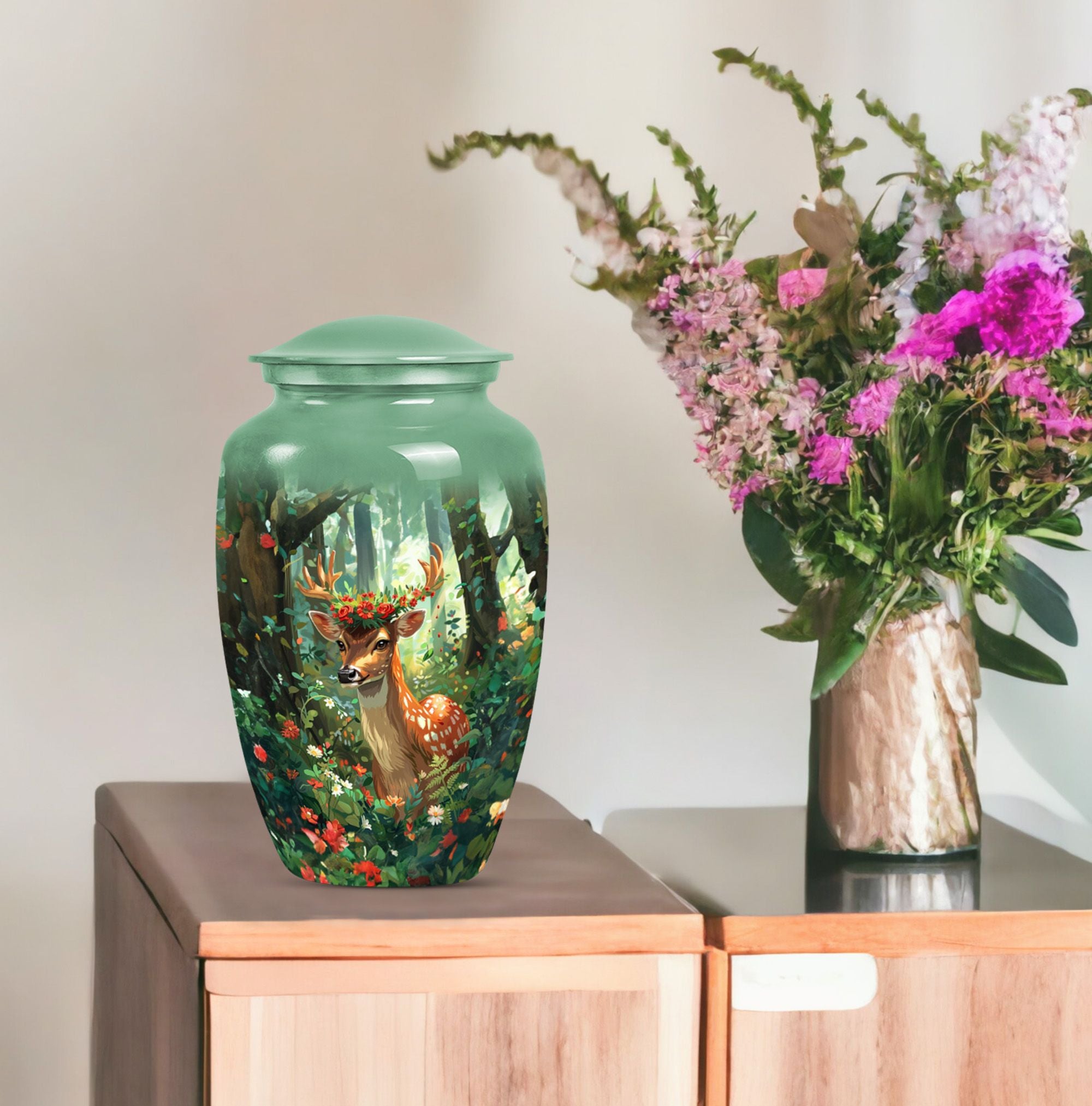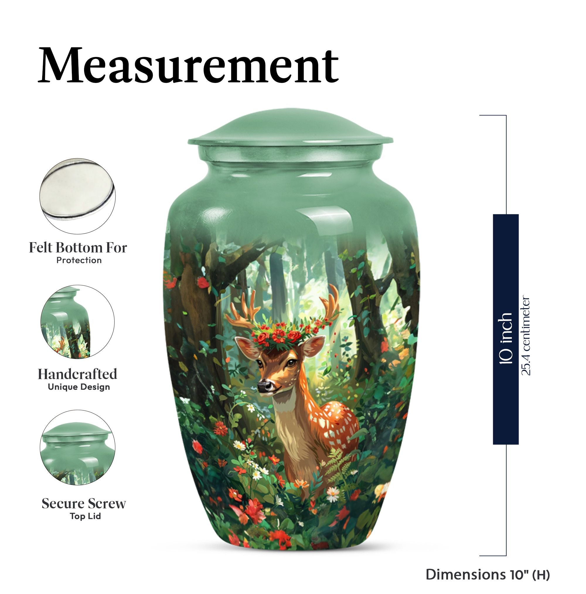 Unveiling our elegantly designed Deer Urn, a special memorabilia to cherish the memory of your dear ones. This large cremation urn, reminiscent of a classic urn silhouette, stands 10 inches tall and weighs a sturdy 3.3 pounds. Crafted diligently from enduring aluminium, the urn features a unique 'Gramophone' theme, adding a distinct touch to the memorial ceremony supplies. It has a generous capacity of 200 cubic inches, ensuring enough space to safely store the ashes of your loved ones. Personalization options are available in the form of engraved names, adding an intimate touch to the urn. Each cremation urn comes with a velvet pouch, providing secure containment of ashes and easy transport. Ideal for both men and women, this cremation urn captivates with its iridescent metal beauty. Whether you're looking for a burial urn, a deer urn, or simply a large urn, our high-quality, lovingly crafted cremation urn stands as an enduring symbol of remembrance.