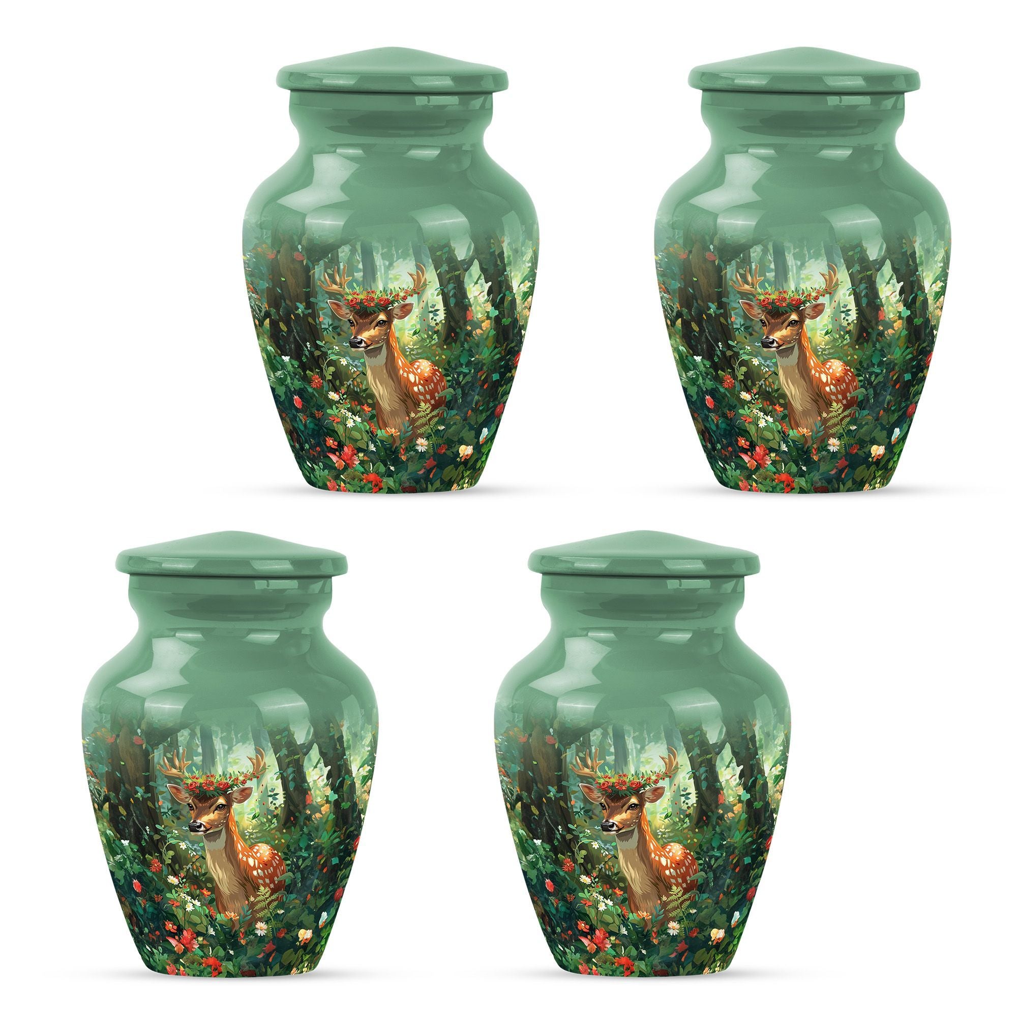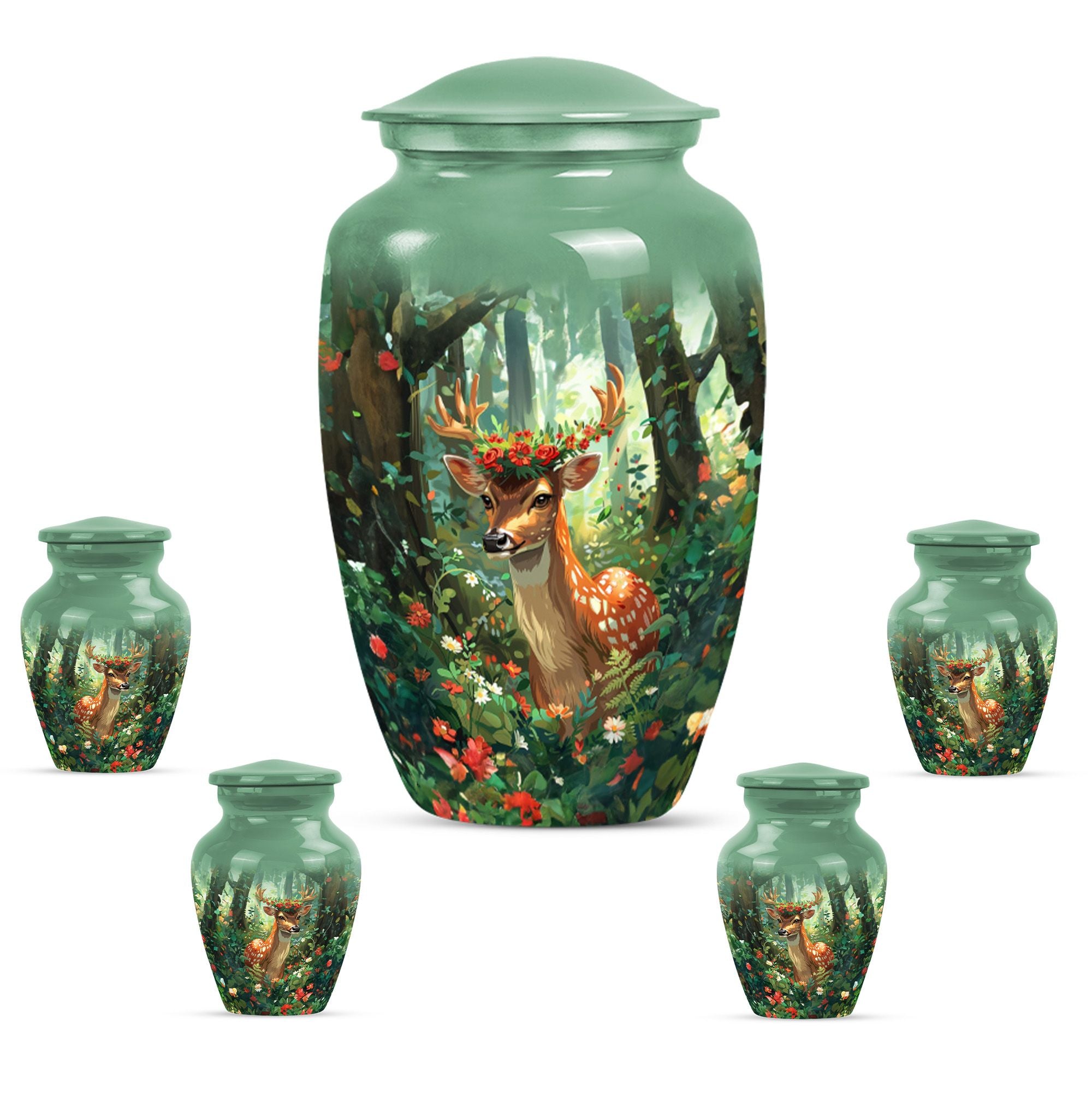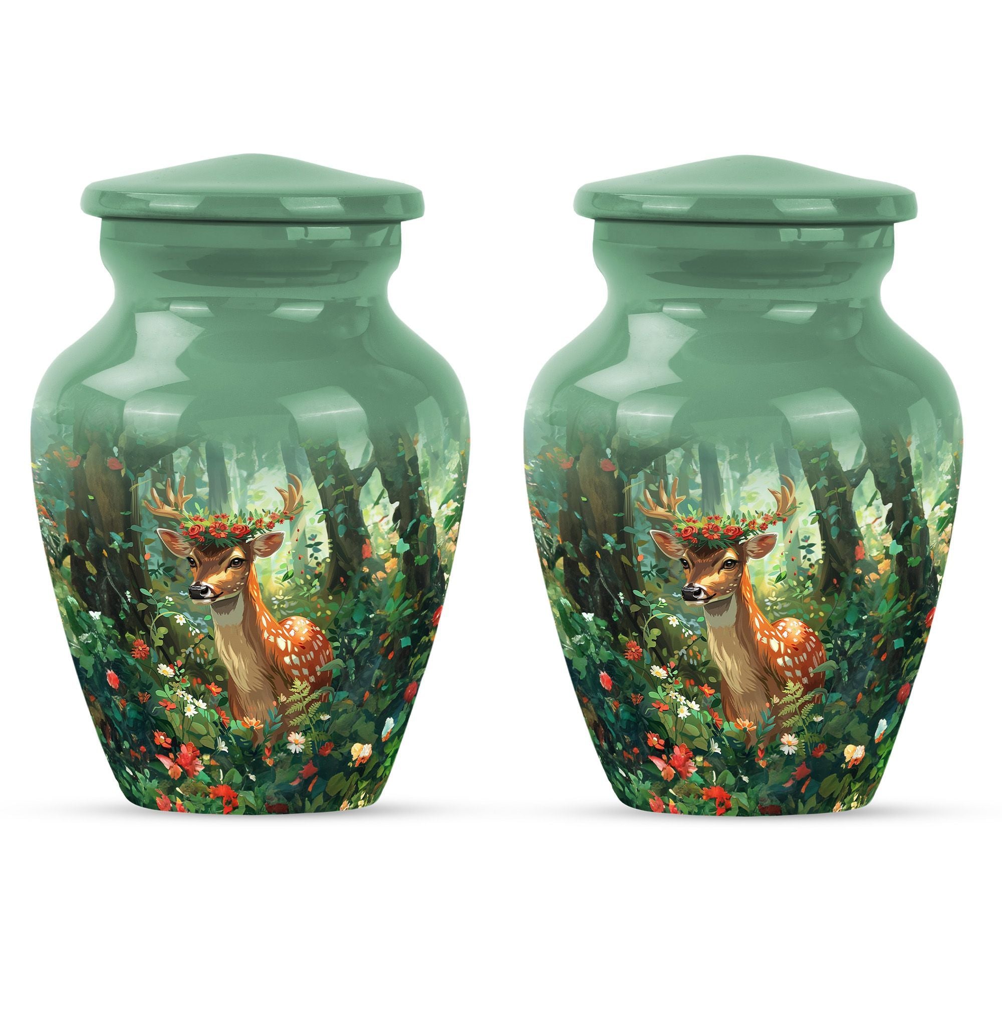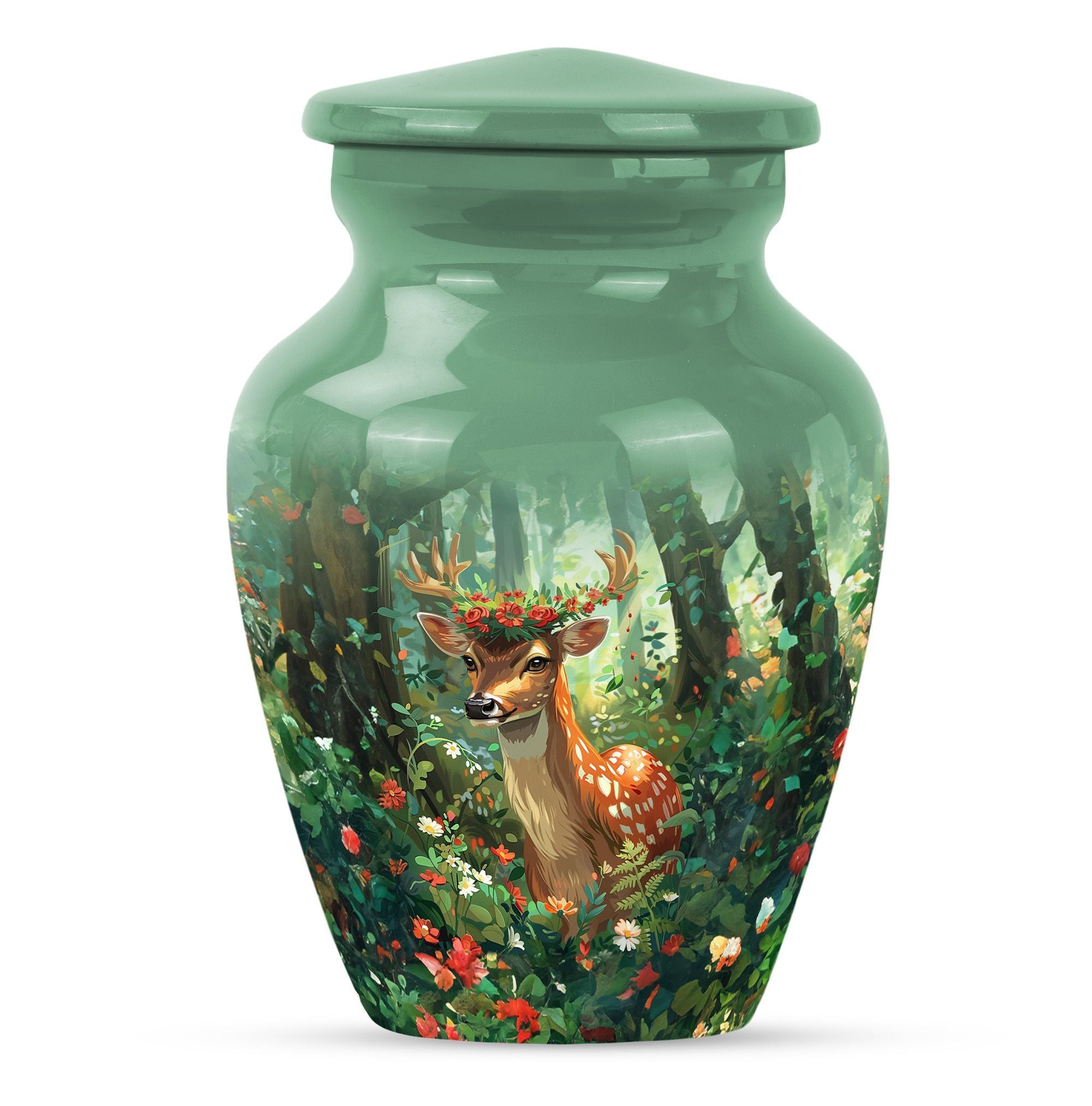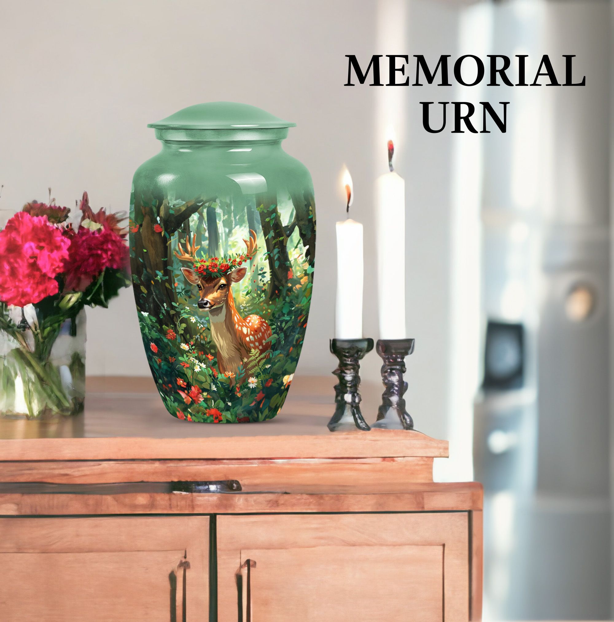 Unveiling our elegantly designed Deer Urn, a special memorabilia to cherish the memory of your dear ones. This large cremation urn, reminiscent of a classic urn silhouette, stands 10 inches tall and weighs a sturdy 3.3 pounds. Crafted diligently from enduring aluminium, the urn features a unique 'Gramophone' theme, adding a distinct touch to the memorial ceremony supplies. It has a generous capacity of 200 cubic inches, ensuring enough space to safely store the ashes of your loved ones. Personalization options are available in the form of engraved names, adding an intimate touch to the urn. Each cremation urn comes with a velvet pouch, providing secure containment of ashes and easy transport. Ideal for both men and women, this cremation urn captivates with its iridescent metal beauty. Whether you're looking for a burial urn, a deer urn, or simply a large urn, our high-quality, lovingly crafted cremation urn stands as an enduring symbol of remembrance.