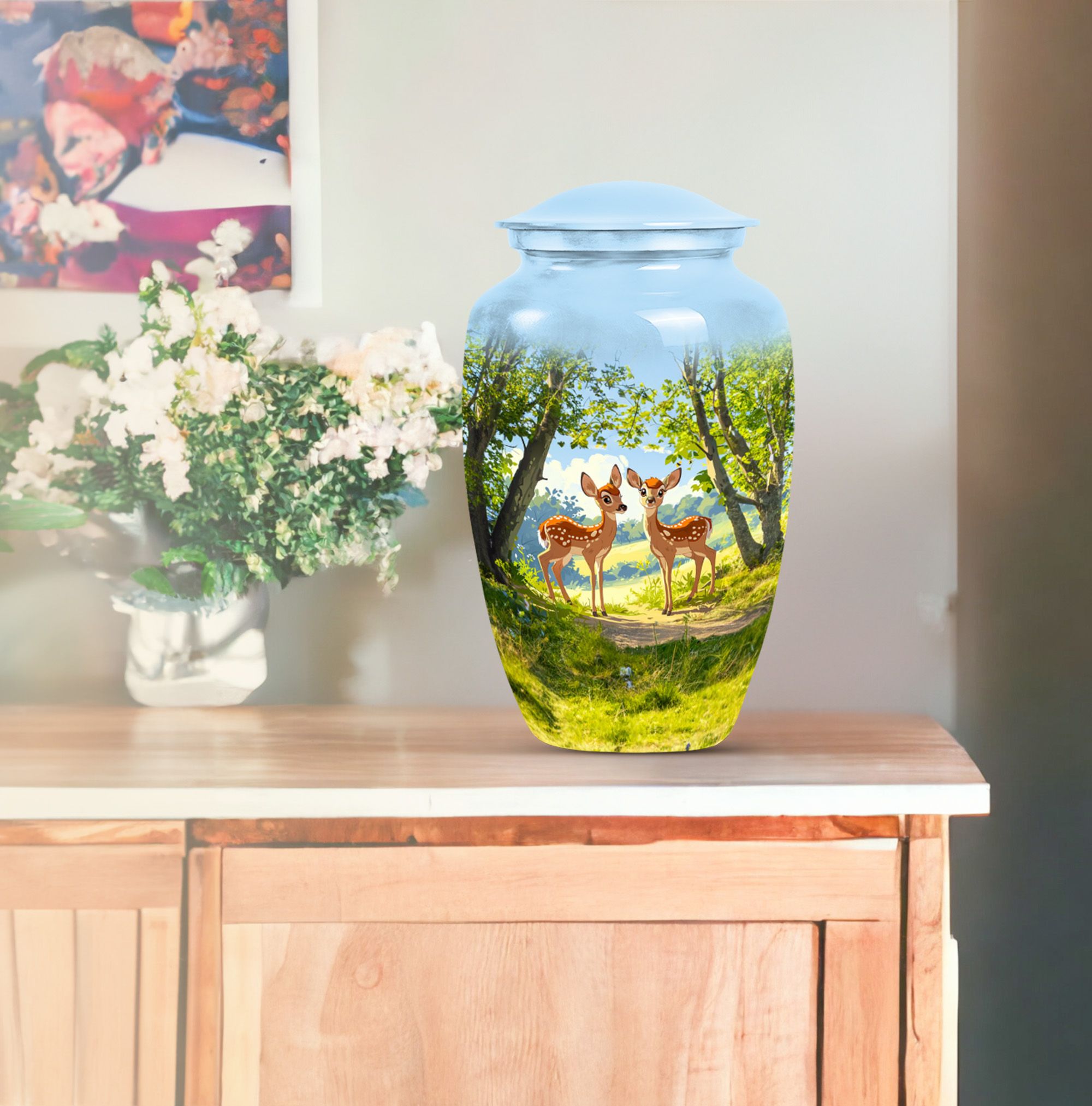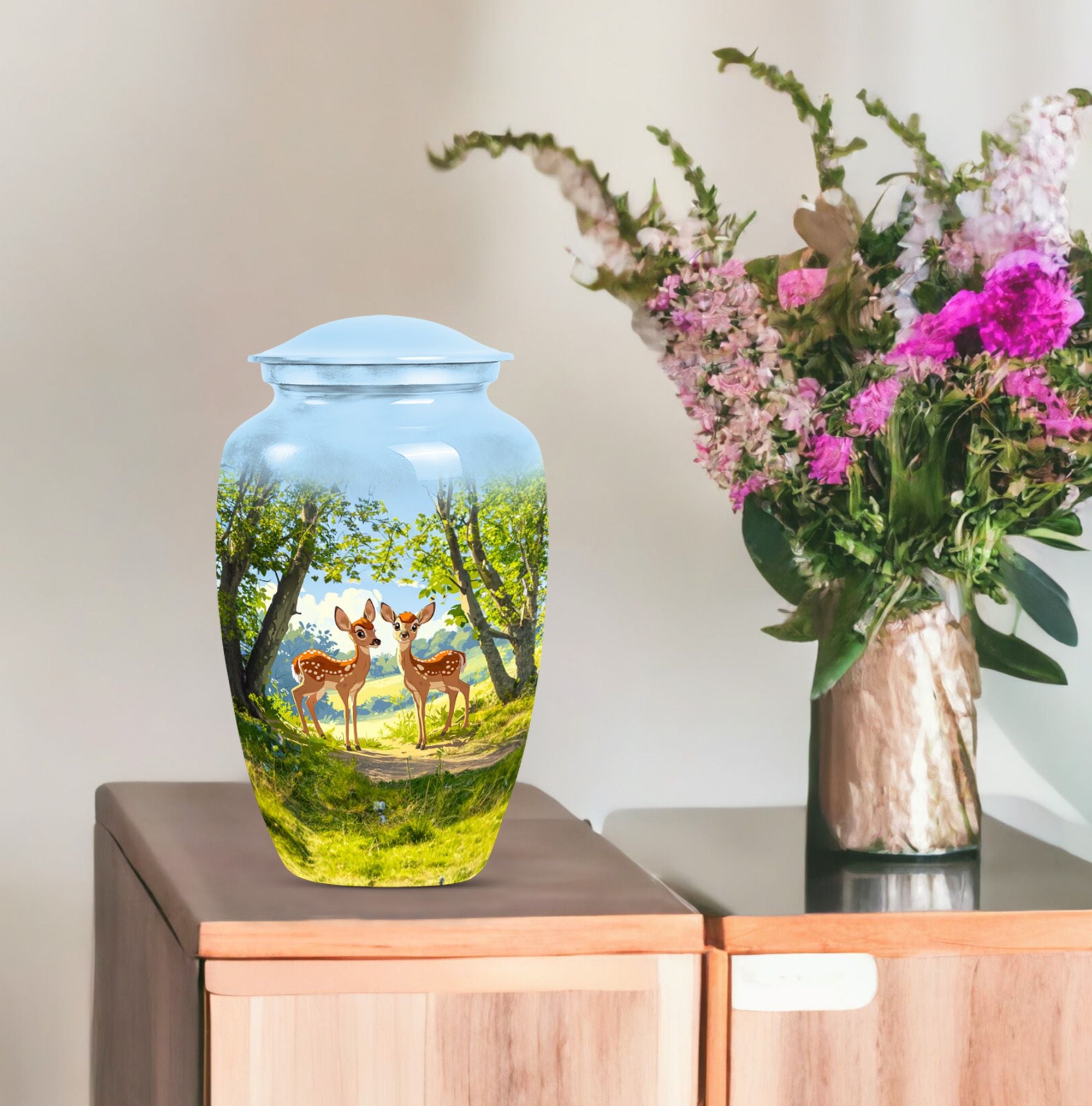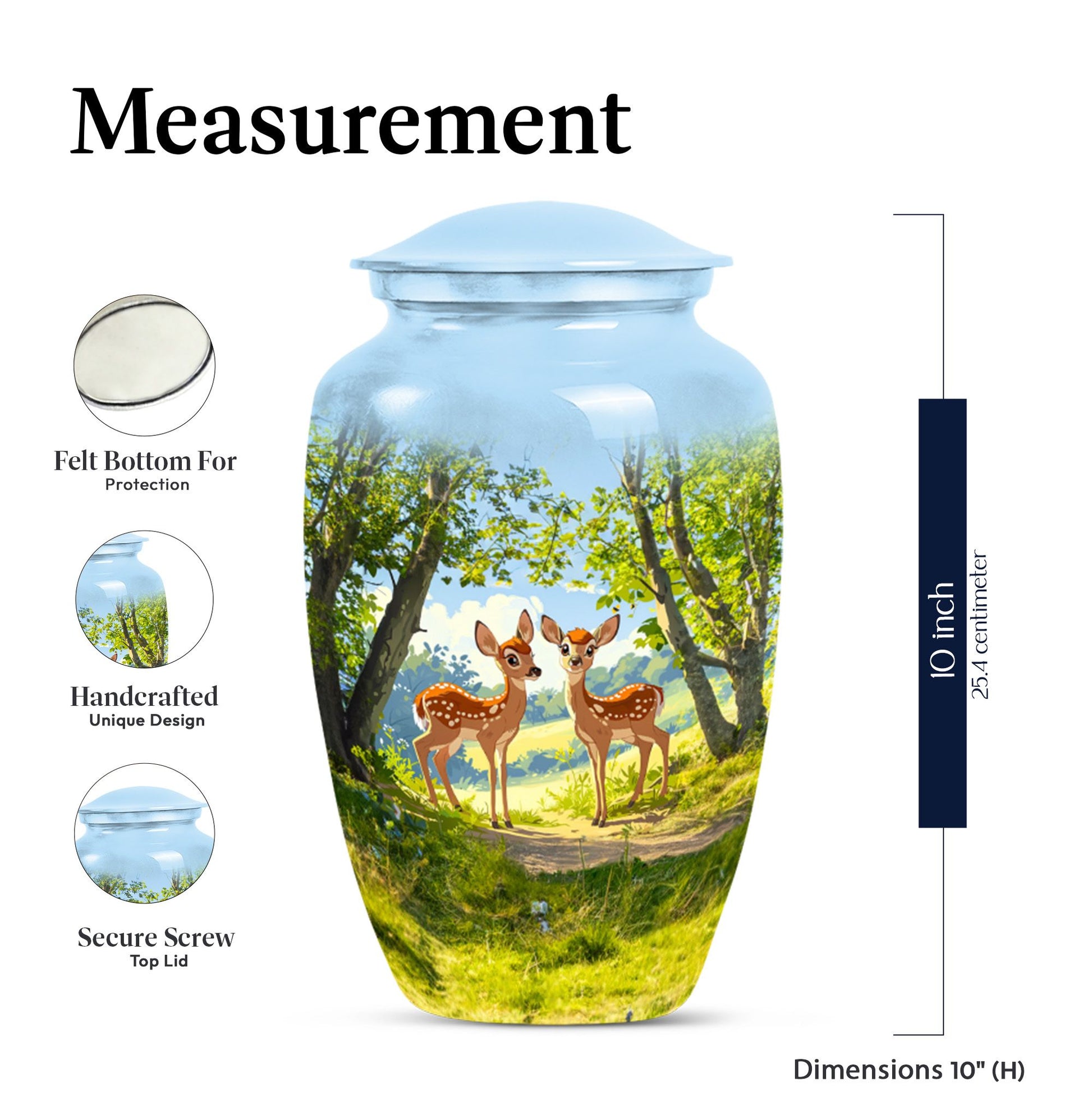 Reserve a dignified and respectful homage to your loved one with our exquisite Gramophone-themed Deer Urn. This cremation urn, specially designed for adult males, measuring a perfect 10 inches, effortlessly brings together elegance and sentiment. Crafted from robust Aluminium, this urn delicately balances weight and capacity, weighing 3.3 pounds and holding up to 200 cubic inches of remains. Impeccably created to serve as a large urn, this timeless piece is ideal for both men and women ashes. Supplementing its purpose, we offer a velvet pouch for containment of ashes, ensuring safekeeping of your precious commemoration. What sets our urn apart is the opportunity for personalization - engrave names to immortalize your loved one's memory! A tasteful choice as a funeral metal urn or for burial in-ground, this piece encapsulates the ultimate tribute through its classic urn design. Envelop your space with an ambience of reminiscent comfort with our deer urn.
