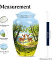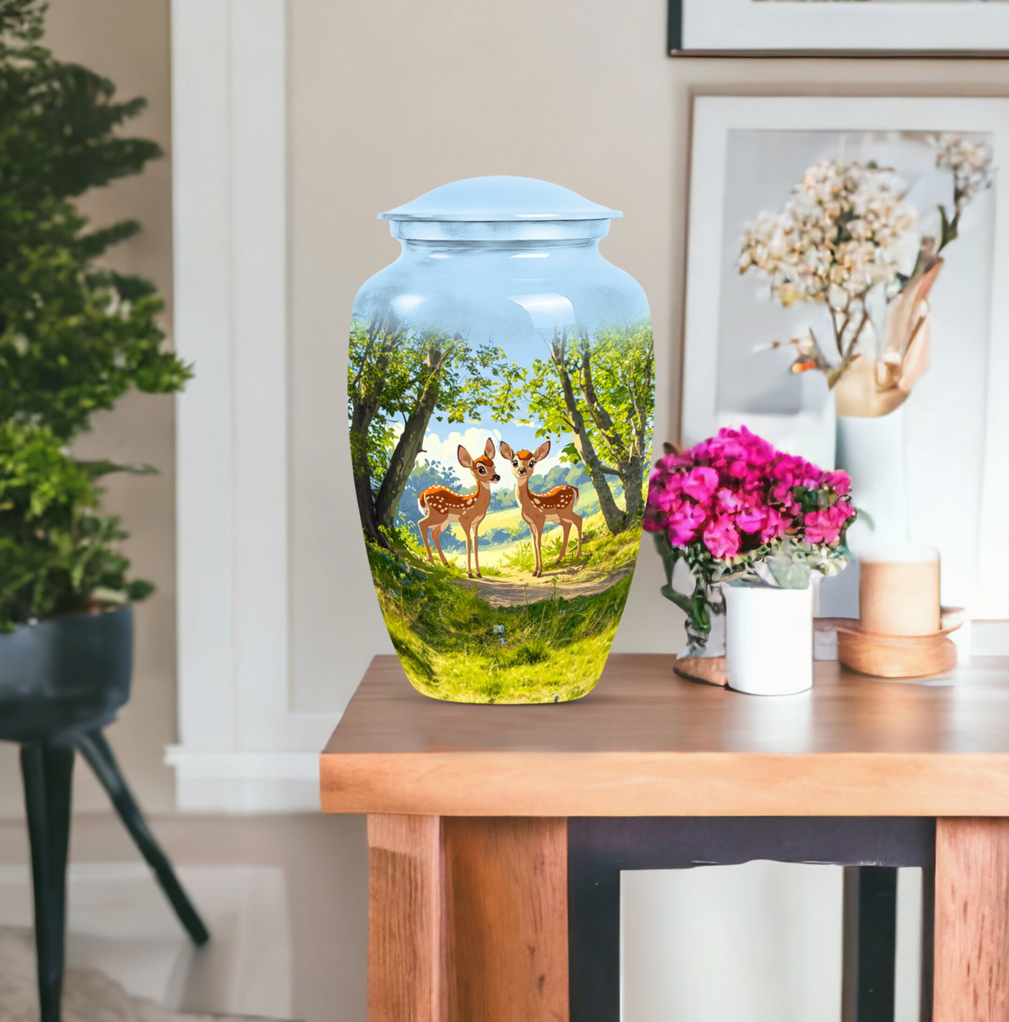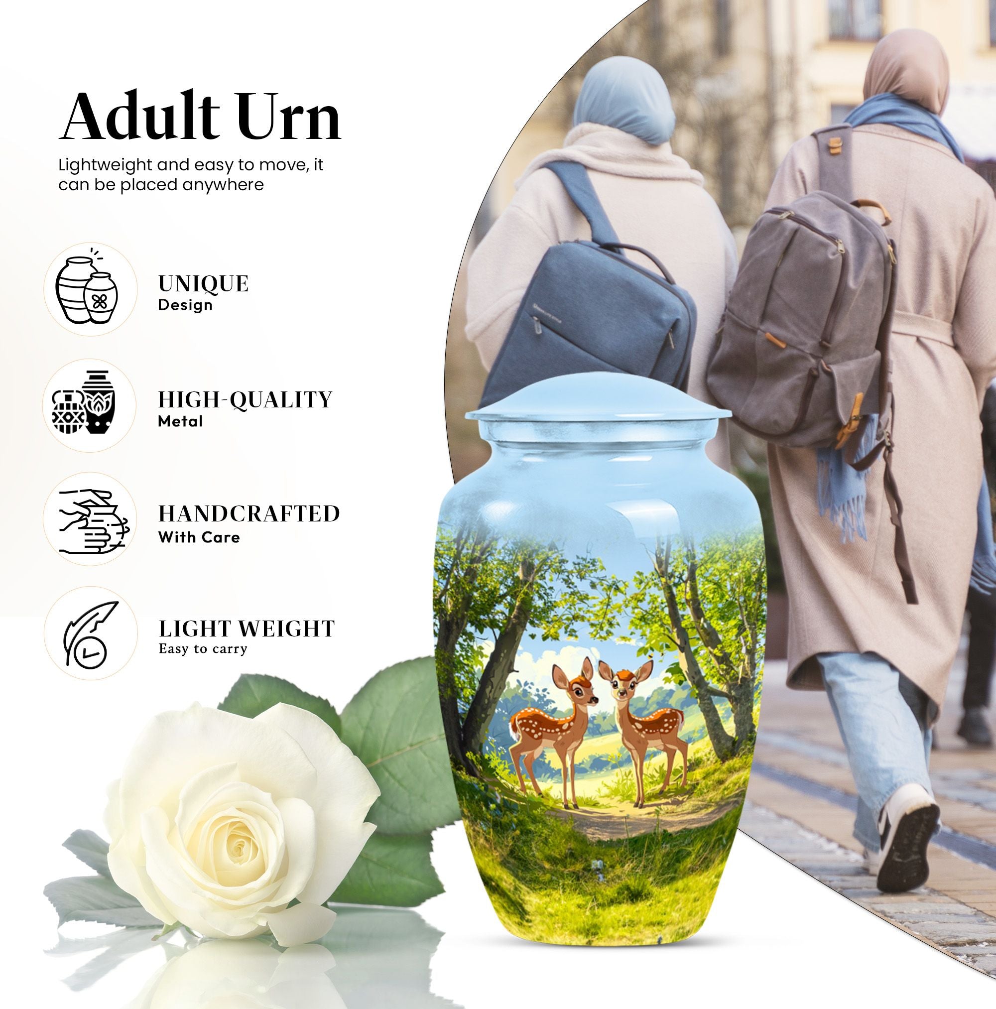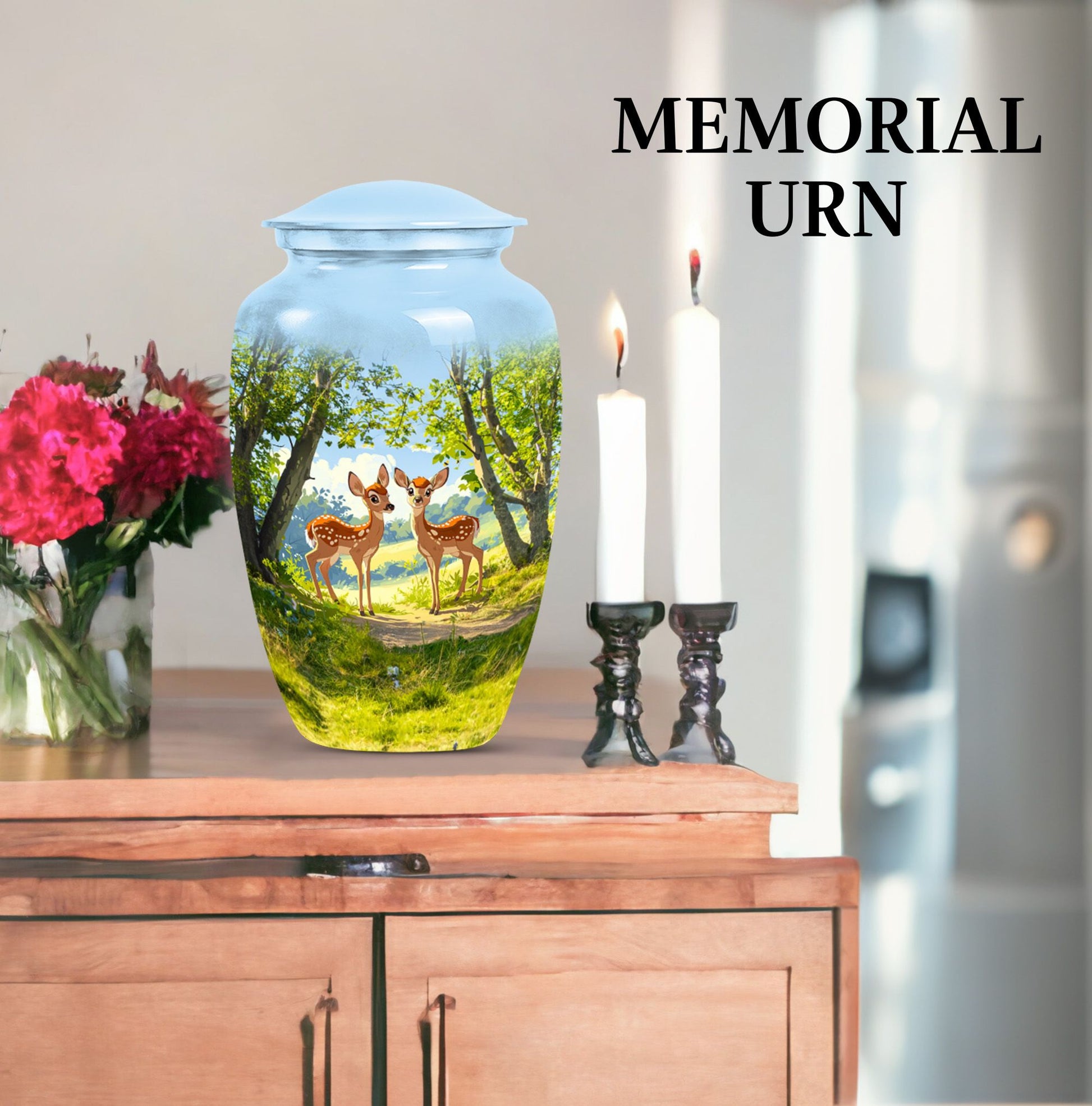 Reserve a dignified and respectful homage to your loved one with our exquisite Gramophone-themed Deer Urn. This cremation urn, specially designed for adult males, measuring a perfect 10 inches, effortlessly brings together elegance and sentiment. Crafted from robust Aluminium, this urn delicately balances weight and capacity, weighing 3.3 pounds and holding up to 200 cubic inches of remains. Impeccably created to serve as a large urn, this timeless piece is ideal for both men and women ashes. Supplementing its purpose, we offer a velvet pouch for containment of ashes, ensuring safekeeping of your precious commemoration. What sets our urn apart is the opportunity for personalization - engrave names to immortalize your loved one's memory! A tasteful choice as a funeral metal urn or for burial in-ground, this piece encapsulates the ultimate tribute through its classic urn design. Envelop your space with an ambience of reminiscent comfort with our deer urn.
