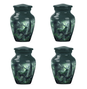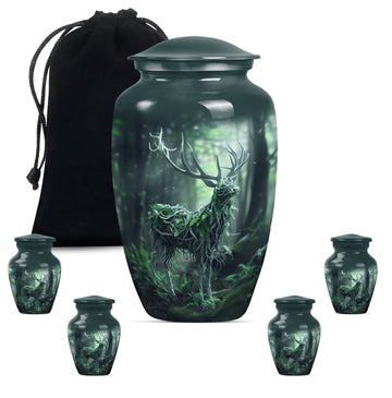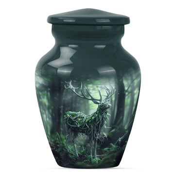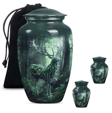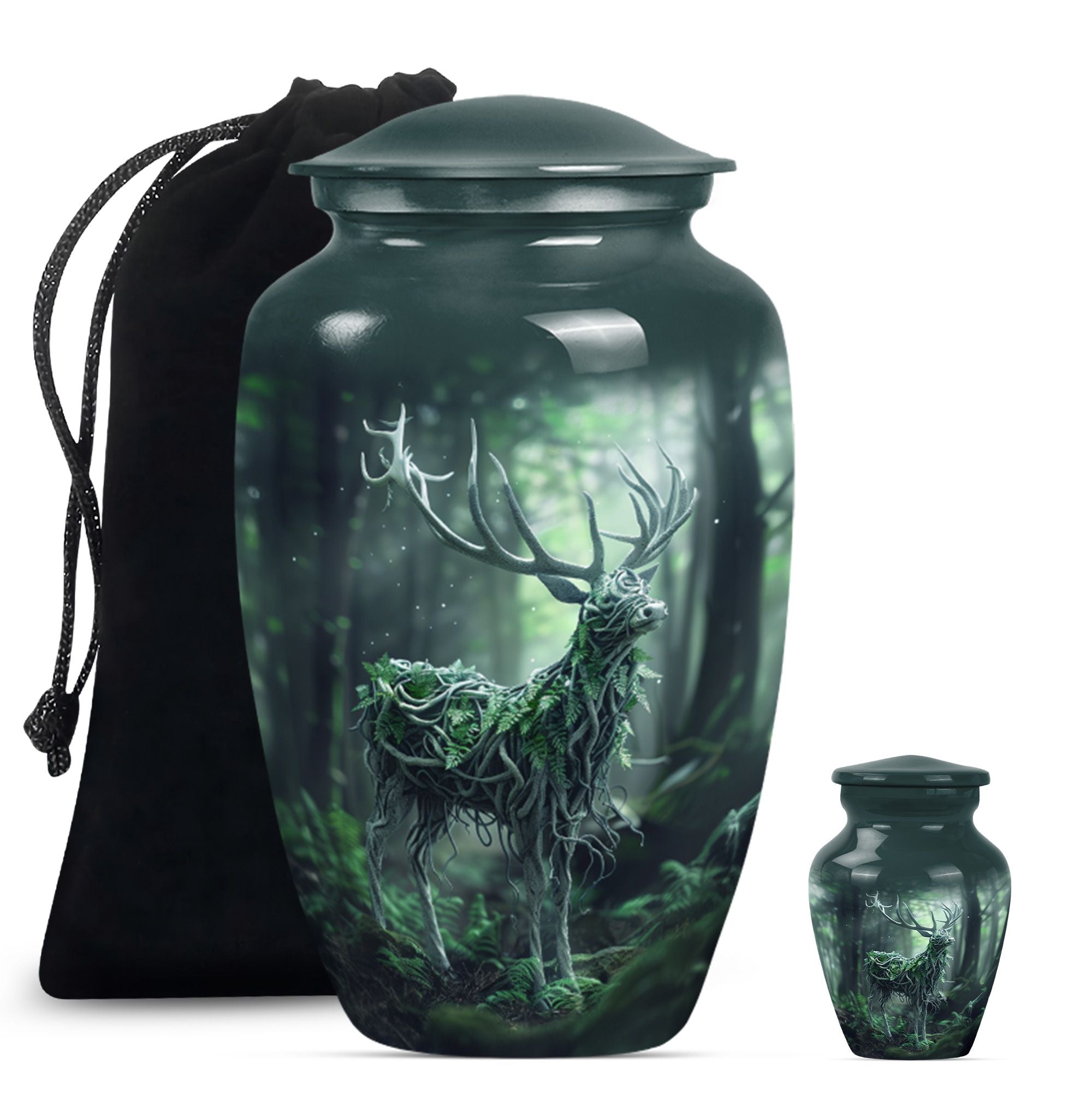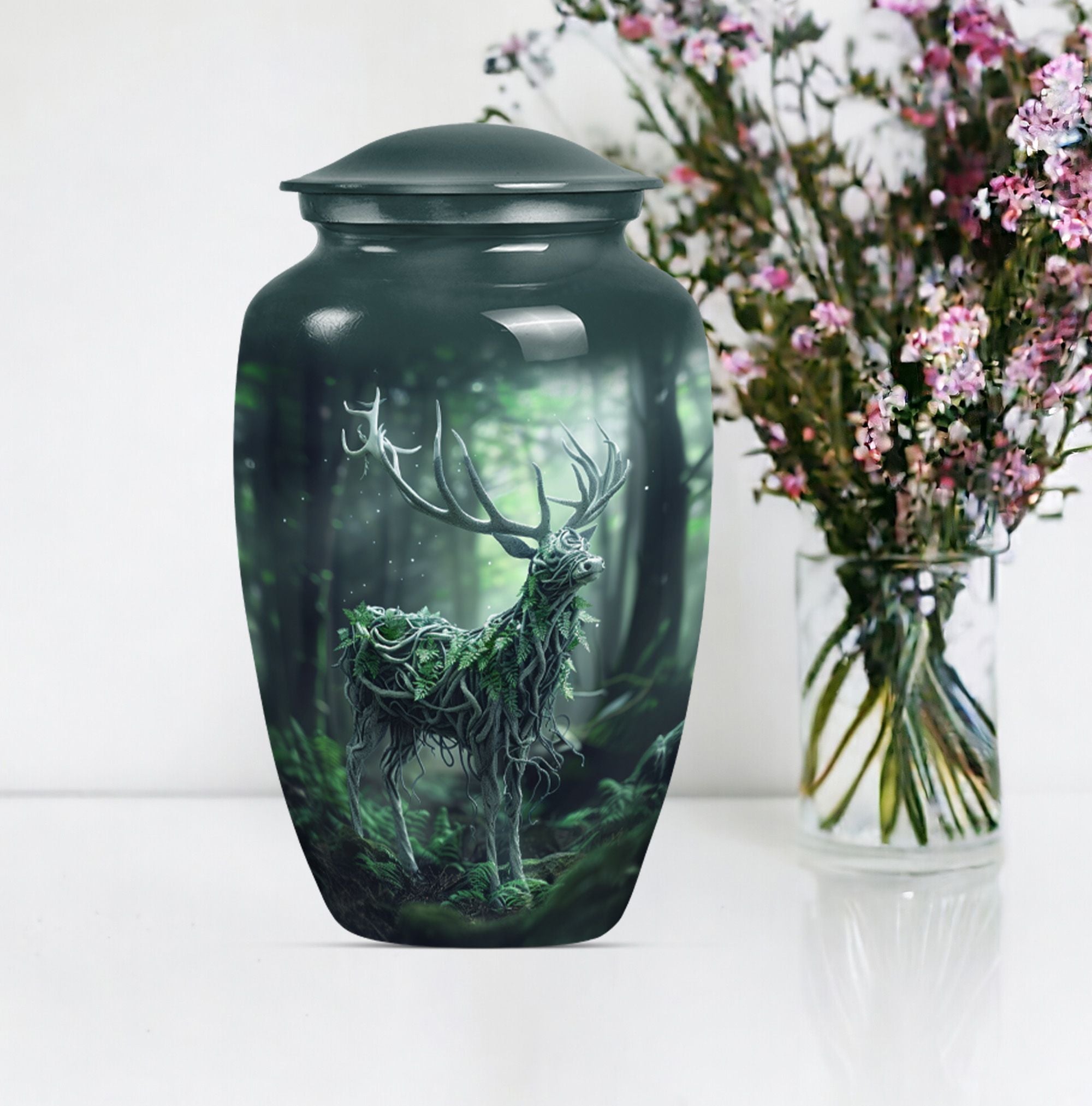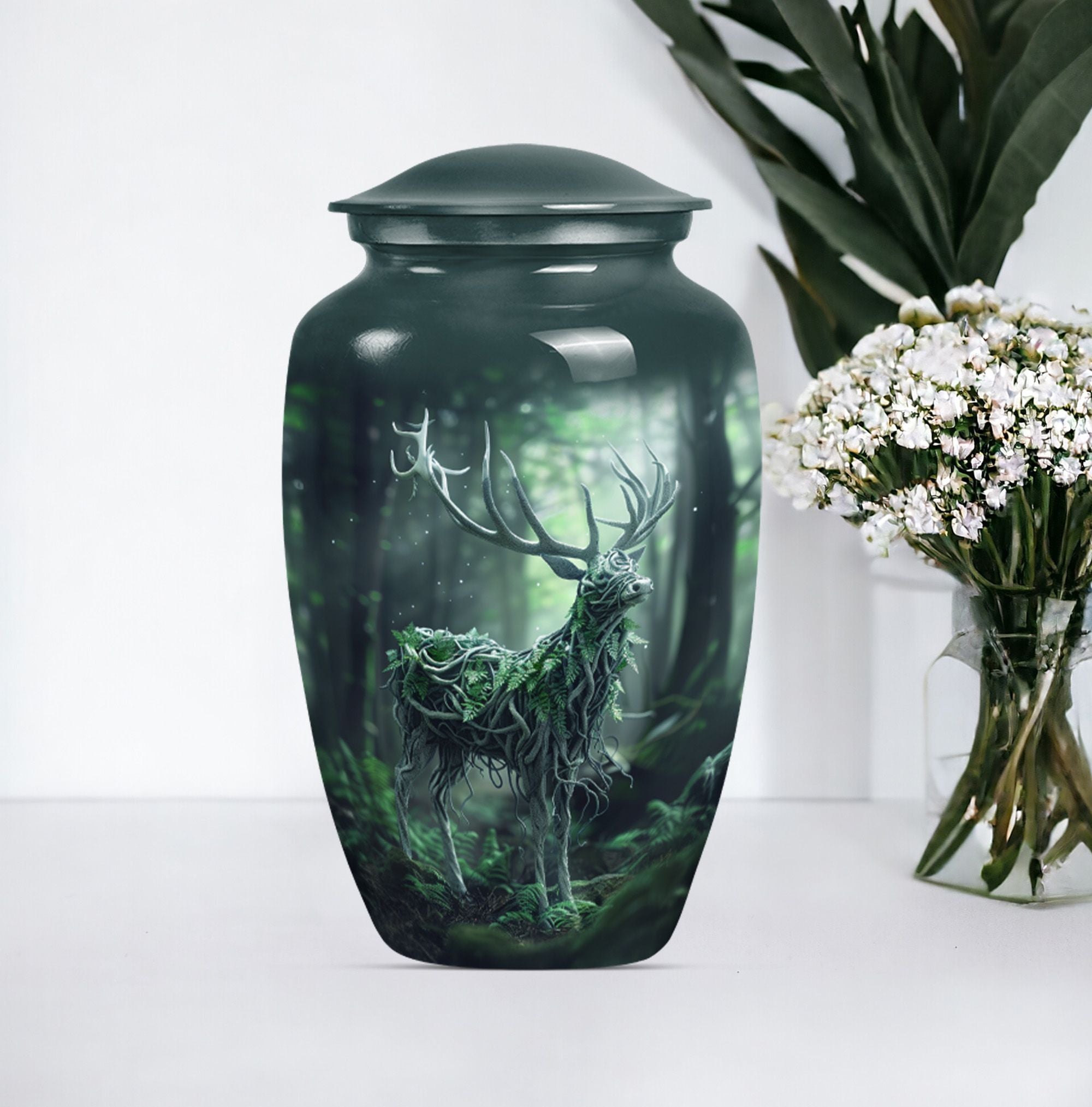 Preserve the memory of your loved ones with our elegant Deer Urn -- a beautifully crafted, dignified solution for cremains. It stands at a noble height of 10 inches and weighs a solid 3.3 pounds, illustrating its sturdiness and resilience. Our funeral urn for ashes adult possesses a capacity generous enough to hold up to 200 cubic inches of cremains. It's made from premium quality aluminium, ensuring it lasts for generations. The urn features a captivating design with a Wolf Howling theme, reflecting a sense of tranquility and freedom. This large urn serves as a perfect reminder of your beloved male dad or any man who held a special place in your heart. We respectfully provide a soft velvet pouch for tasteful containment and preservation of the ashes. Added personalization allows for engraving names, making the memorial even more exclusive. As an enchanting centerpiece in your home, this deer urn keeps the spirit of your dear ones eternally close.