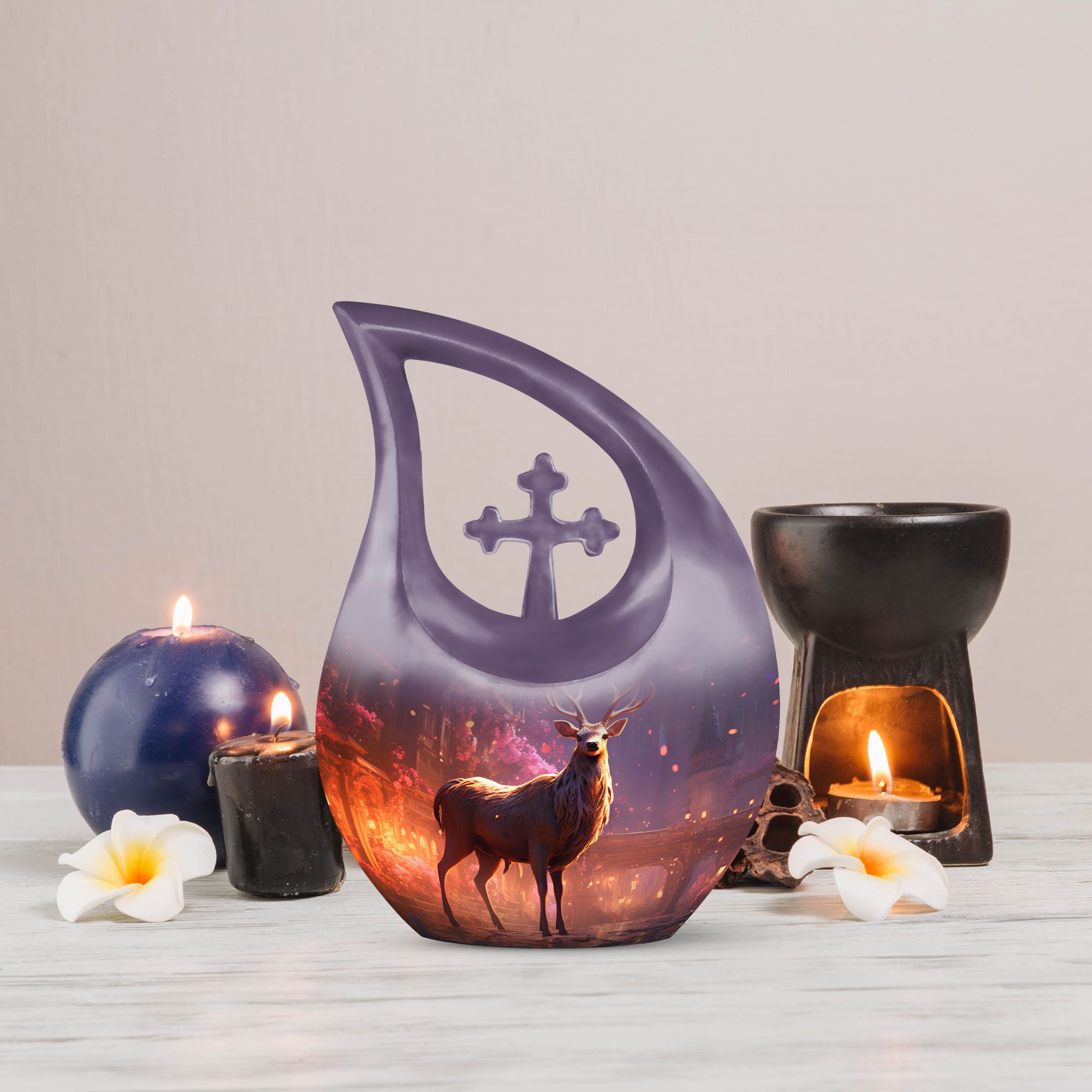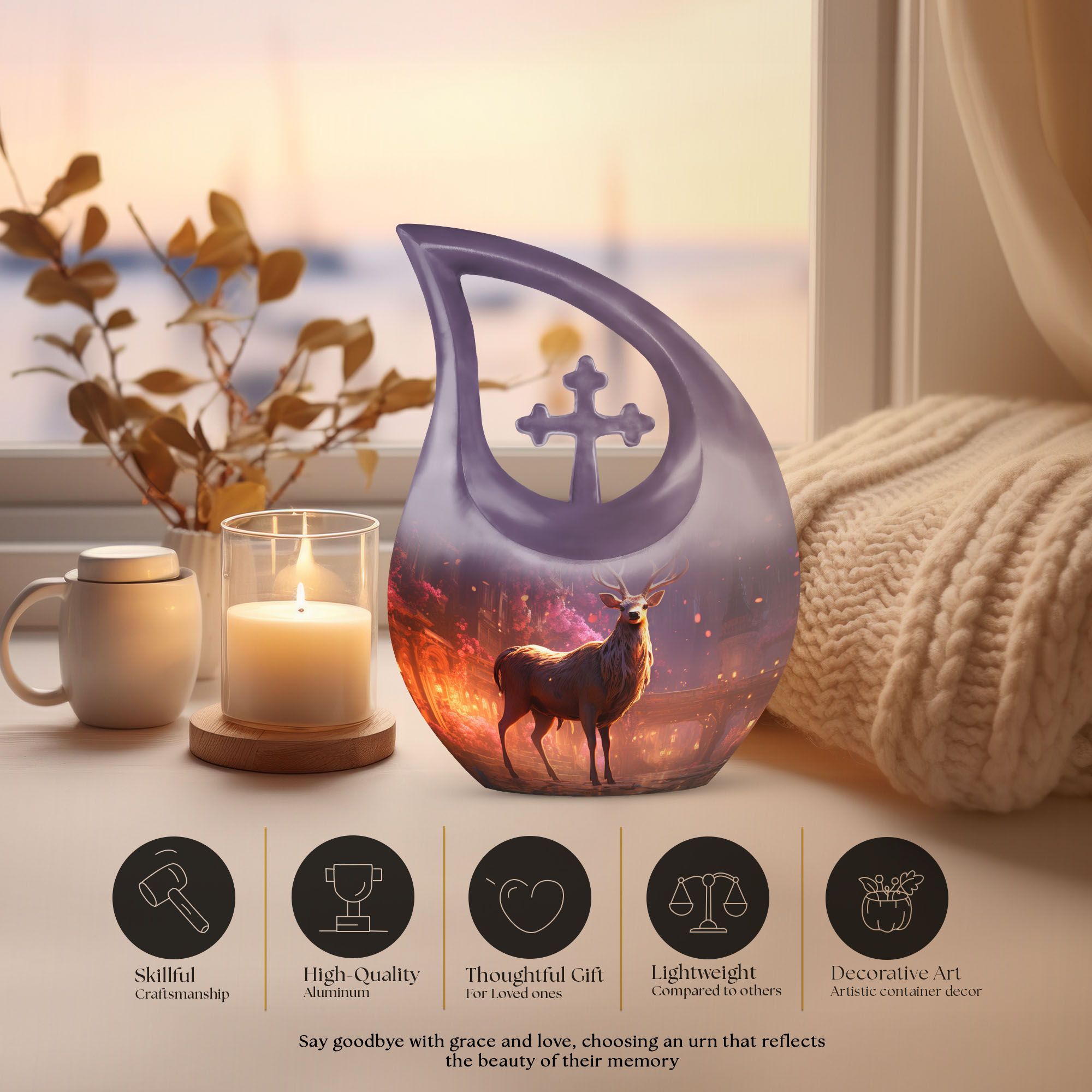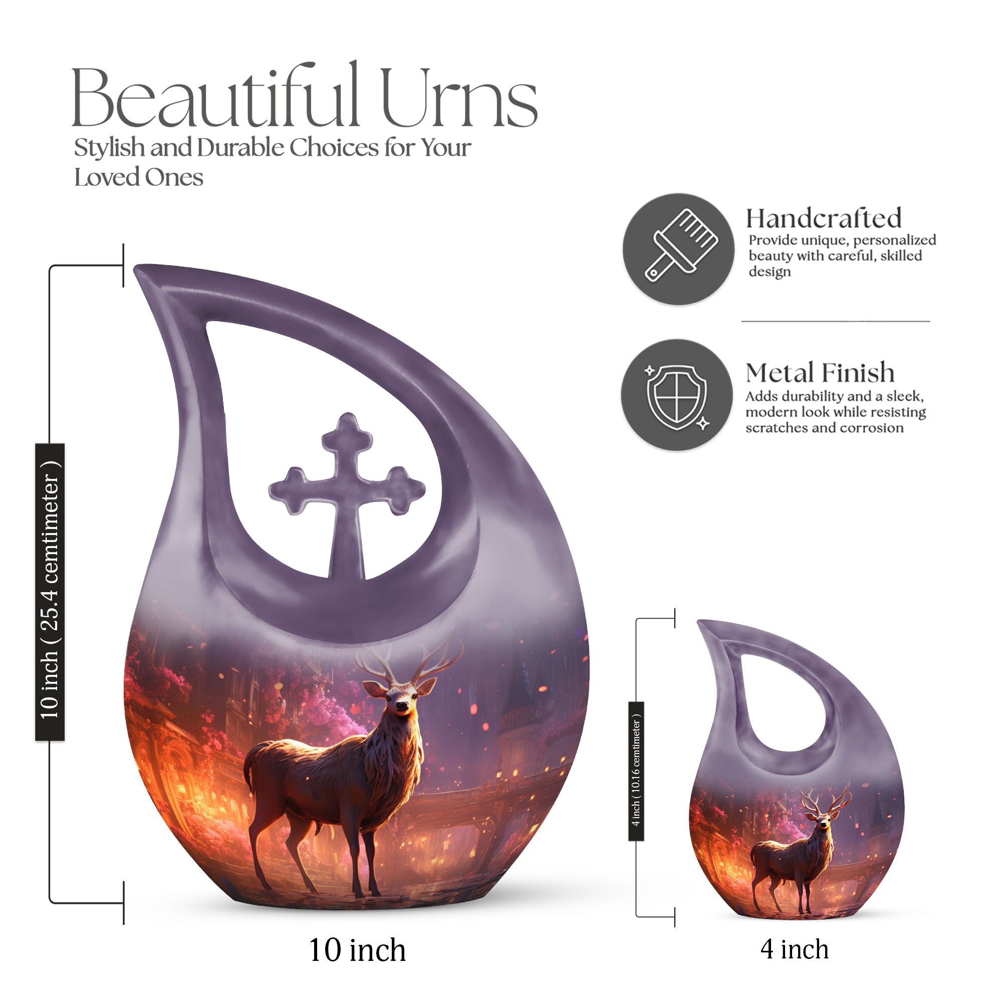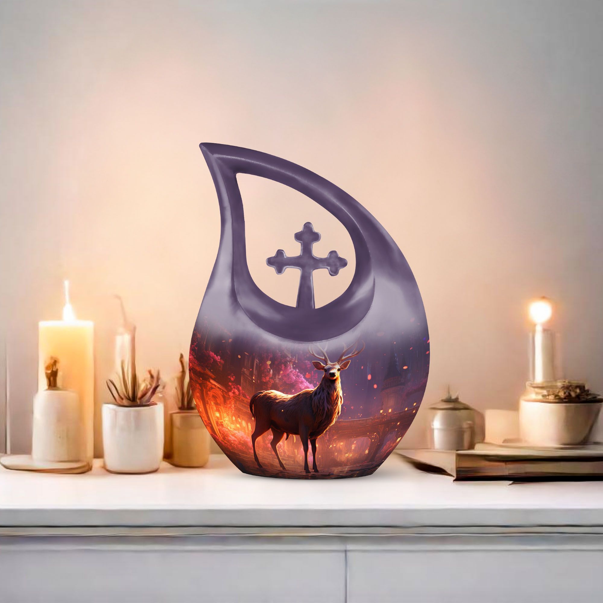 Embrace a captivating tribute to your loved one with our Cross Drop Deer Urn - an eye-catching homage and serene resting place for human ashes. This large urn, strikingly realized in aluminium, stands 10 inches in height, weighs 3.3 pounds and boasts a generous capacity of 200 cubic inches. Its notable 'deer' theme radiates comforting remembrances of nature's beauty, subtly reminding us of the circle of life. Each urn is gifted with a soft velvet pouch, adding an extra layer of protectiveness while handling the ashes. As we understand the profound significance of such purchases, we offer the opportunity for personalization. Preserving the unique memory of your loved one, you can engrave their names, making this not just an urn, but a personalized haven for cherished memories. Looking for dignified memorial urns or custom cremation urns for human ashes? Explore a diverse range of our sensitively crafted, and high-quality large urns for sale.