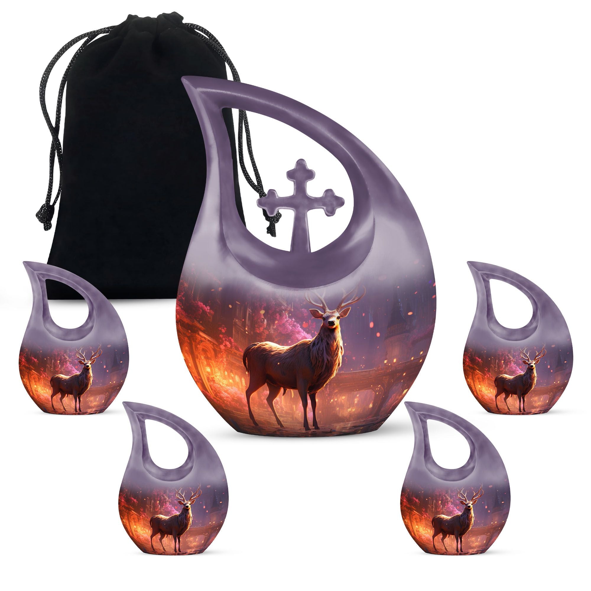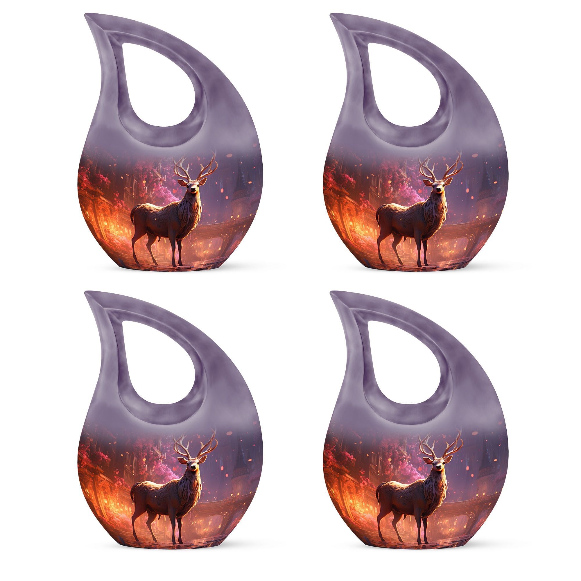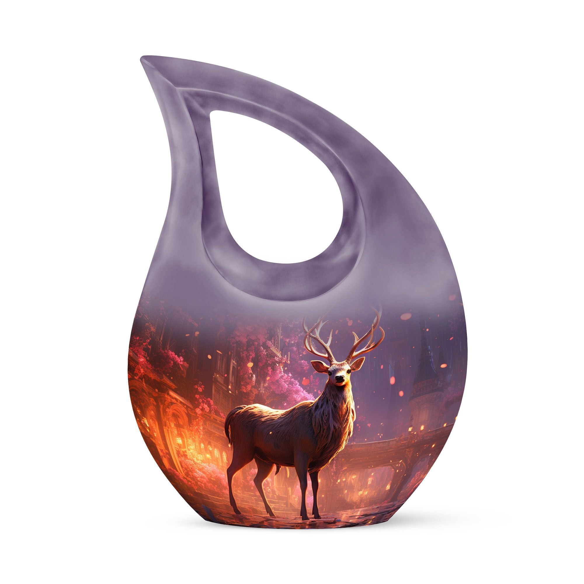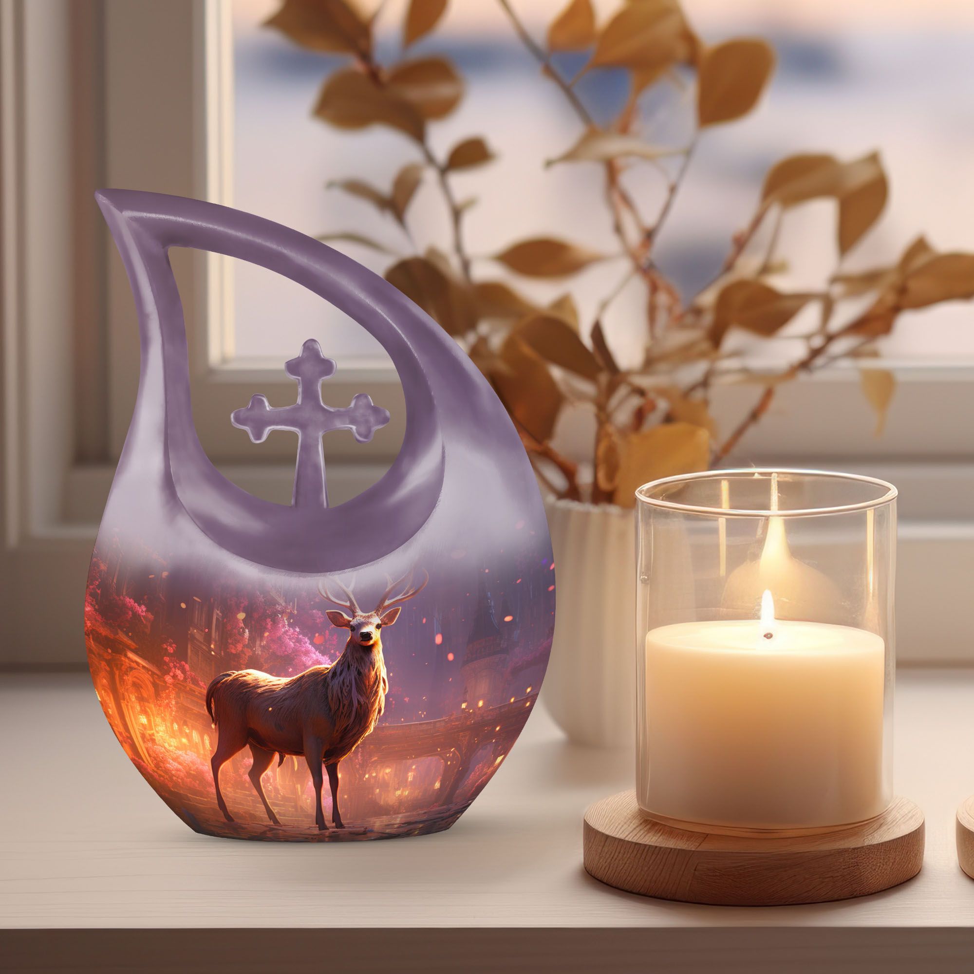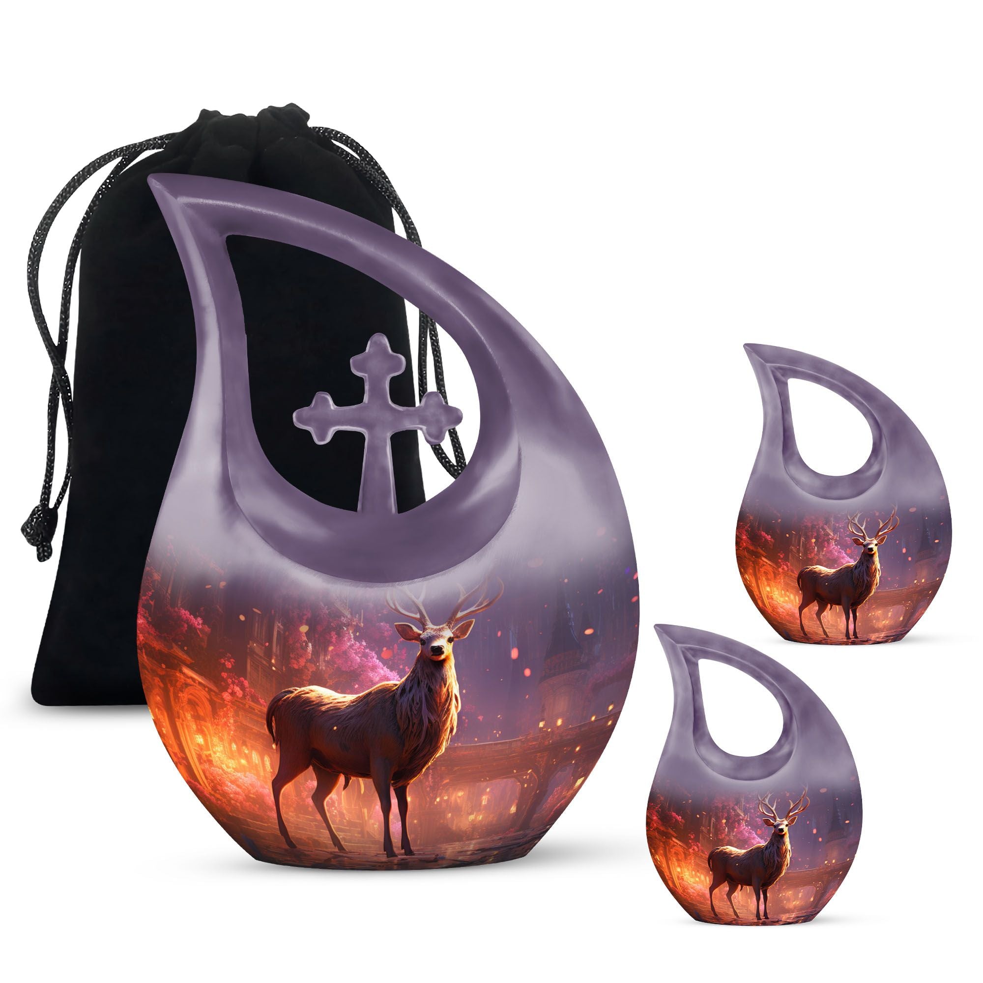 Embrace a captivating tribute to your loved one with our Cross Drop Deer Urn - an eye-catching homage and serene resting place for human ashes. This large urn, strikingly realized in aluminium, stands 10 inches in height, weighs 3.3 pounds and boasts a generous capacity of 200 cubic inches. Its notable 'deer' theme radiates comforting remembrances of nature's beauty, subtly reminding us of the circle of life. Each urn is gifted with a soft velvet pouch, adding an extra layer of protectiveness while handling the ashes. As we understand the profound significance of such purchases, we offer the opportunity for personalization. Preserving the unique memory of your loved one, you can engrave their names, making this not just an urn, but a personalized haven for cherished memories. Looking for dignified memorial urns or custom cremation urns for human ashes? Explore a diverse range of our sensitively crafted, and high-quality large urns for sale.