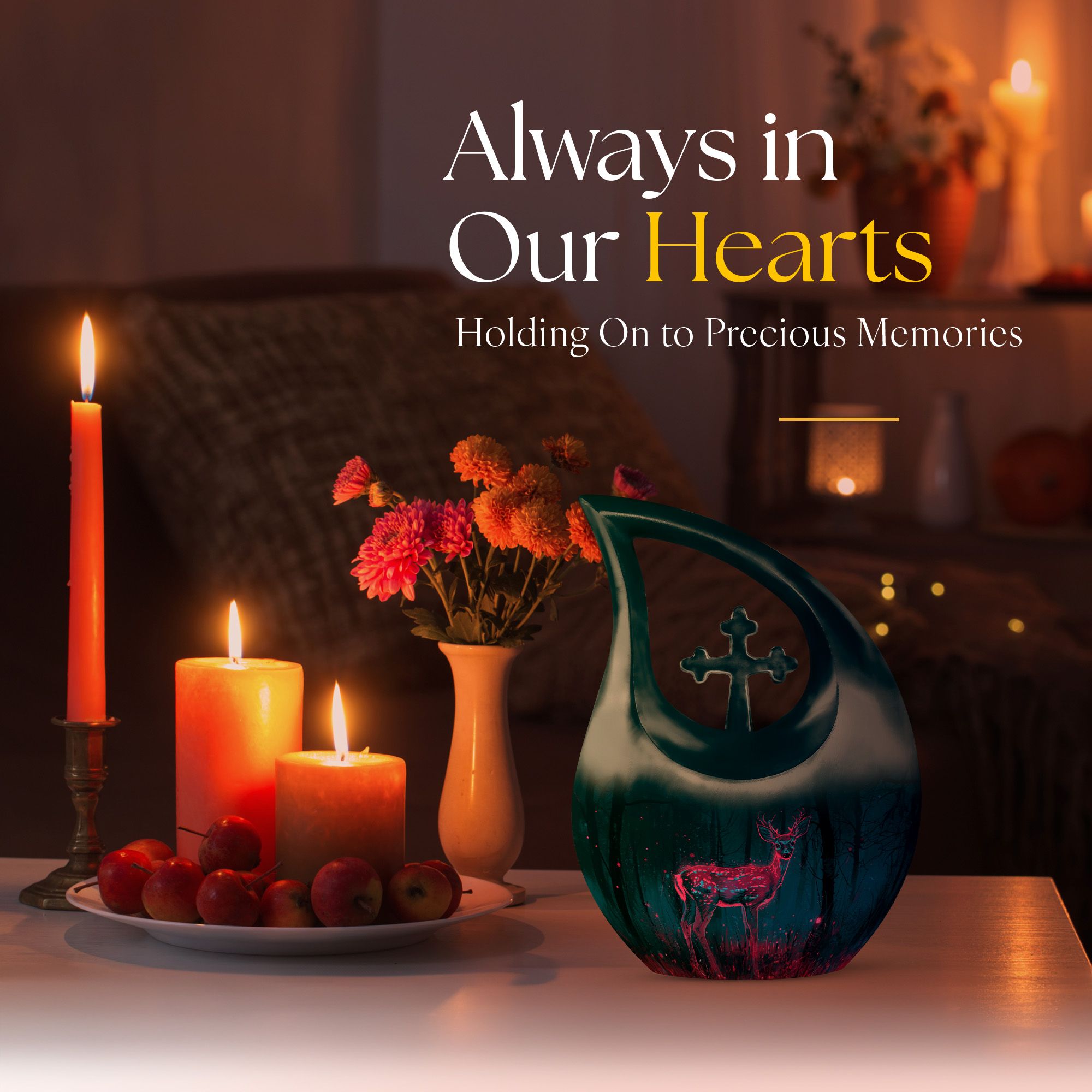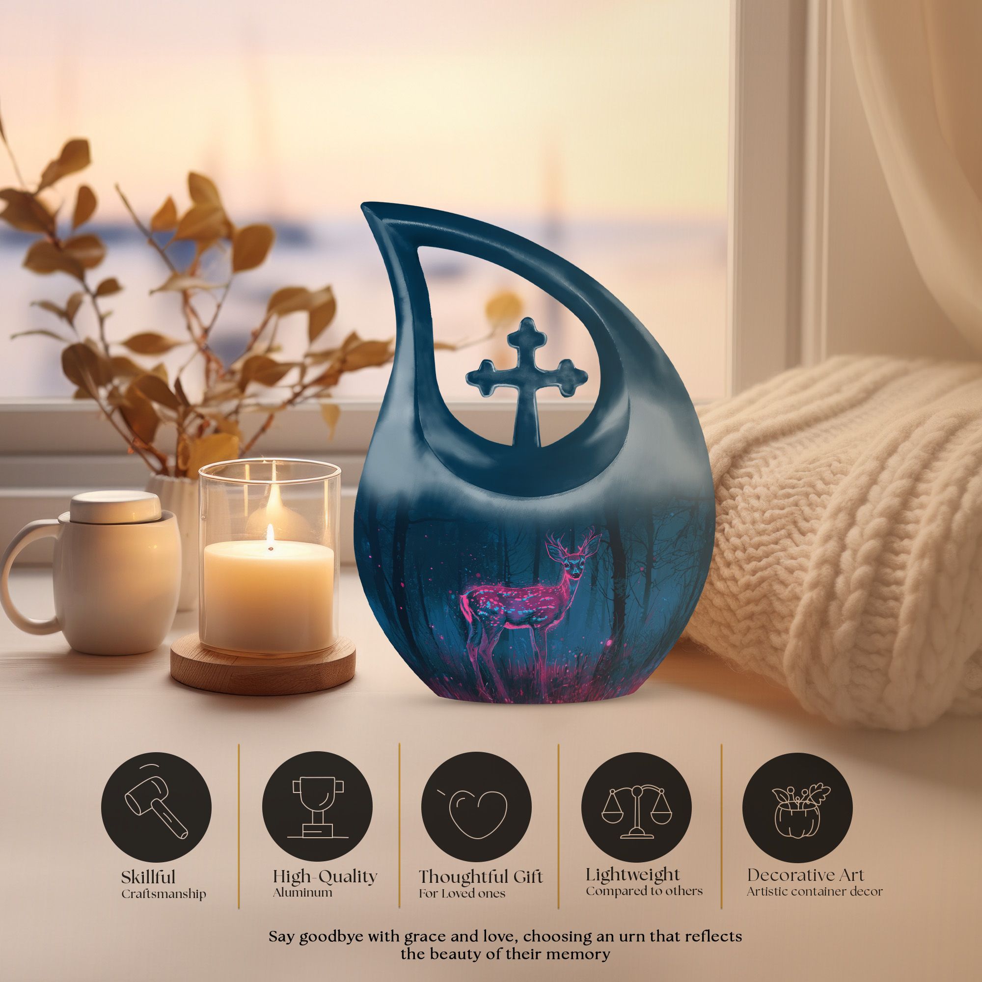 Crafted to be a memorable memorial item, the Neon Forest Deer Urn, offers the profound symbolism of peace and tranquility. This beautifully crafted Urn is presented in a ‘Cross Drop’ design, capturing a spiritual essence, while its vivid Neon Forest Deer theme evokes a tranquil aura. Suited for all, particularly adults and seniors seeking solace in spiritual symbolism, this 10 Inch large urn is constructed of durable Aluminium, ensuring longevity. The urn's substantial dimensions and weight of 3.3 pounds reflects its craftsmanship, standing grand at 10 inches in height with a capacity to hold 200 cubic inches of ashes. Included is a plush velvet pouch providing an extra layer of protection for the containment of ashes within. Strive to make it more personal, with the customization option available for engraved names. Fulfilling the search for 'memorial urns', 'small decorative urns for ashes' or 'large urns for ashes', this piece pairs the sentiment of remembrance with the sturdiness of construction.