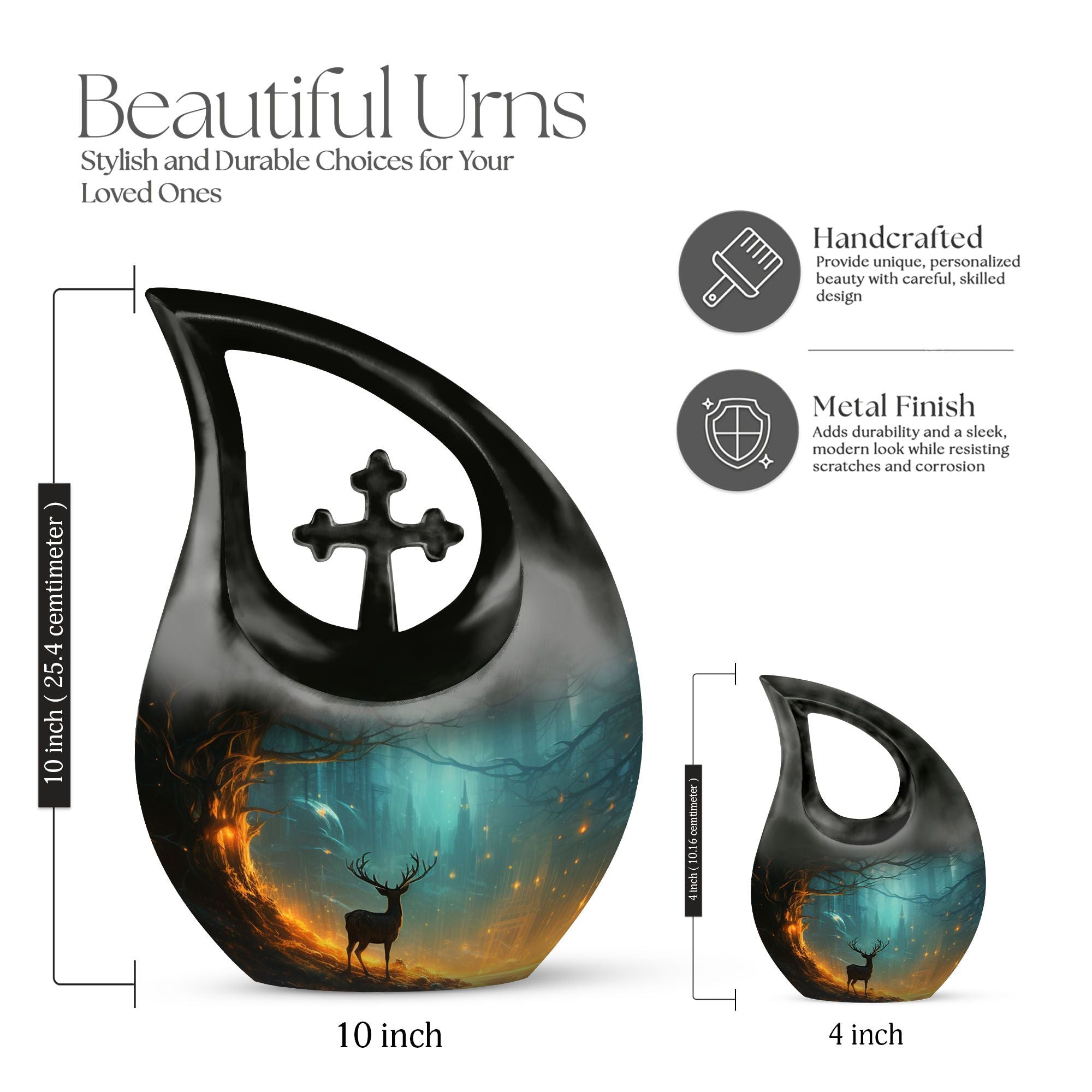Honor your loved one's memory with our distinct Deer Urn. This prominent 10-inch remembrance urn, characterized by its Cross Drop pattern, is an embodiment of peace and reverence. Molded from robust, high-grade Aluminium, the urn exudes an enduring presence. Its significant capacity of 200 cubic inches is designed to securely hold the ashes. Containing a weight of 3.3 pounds, the urn is fabricated to exhibit a comforting heaviness. The urn comes with a delicate velvet pouch, providing a befitting containment for the ashes. Further, we offer customization options, allowing the ability to personalize the urn with an engraving of the departed's name, lending it a warm, homely touch. Our Deer Urn is more than just a repository for ashes; it is a token of enduring love and fond memories. Unconventional terms like 'Deer Cremation Urn' and 'Large Urns' may lead you straight to our product whilst online searching. For a unique, high-quality urn, look no further.