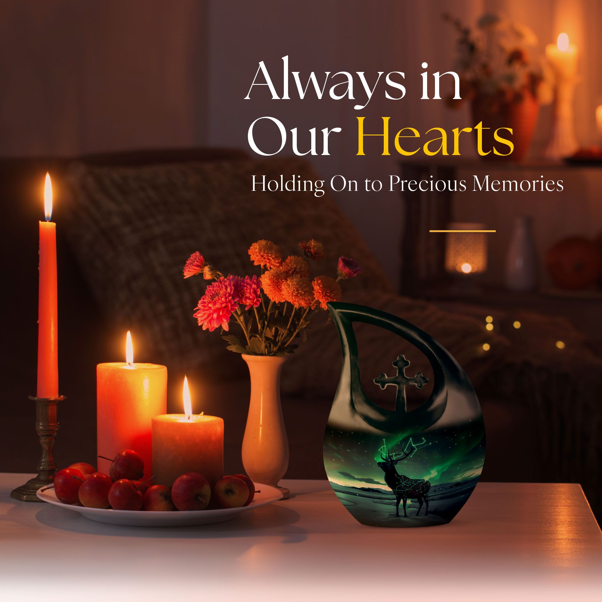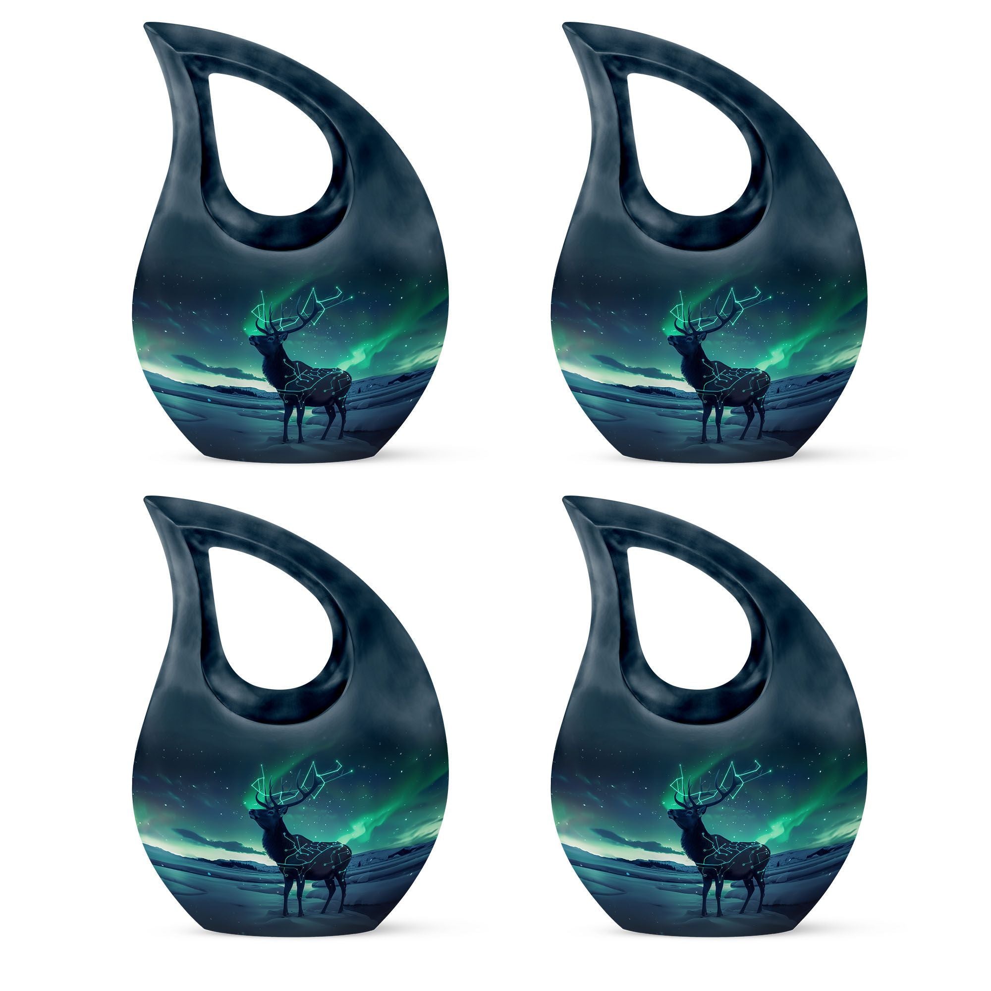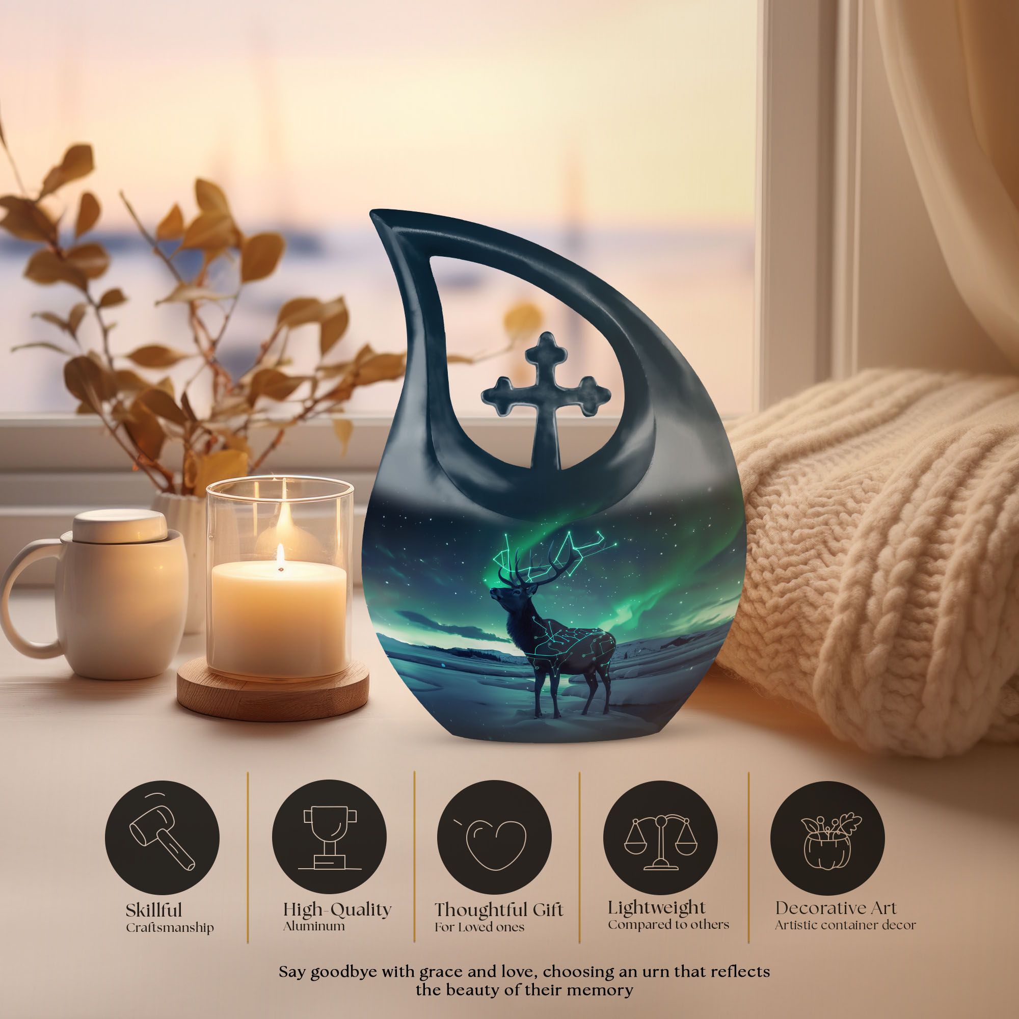 Revered for its stunning Deer theme, this aluminium-made Large Urn is set to become an indispensable part of your Memorial Ceremony Supplies. Weighing just 3.3 pounds, it keeps a subtle presence with its size of 10 inches. The cross drop design speaks volumes about its fine artistry. It offers a spacious interior with a capacity of 200 cubic inches, ample space to securely hold the farewell remnants. The urn comes with a delicate velvet pouch for the respectful containment of ashes. Add a personal touch to this Affordable Cremation and Burial Urn with our customization options - write engraved names and make it unique. This attractive 'Deer urn' skilfully marries functionality with aesthetic appeal, presenting a fitting tribute to your loved ones. Suitable for those searching for Ashes Keepsake, Cremation Keepsakes, Small Urns and Urns for Cremation Ashes.