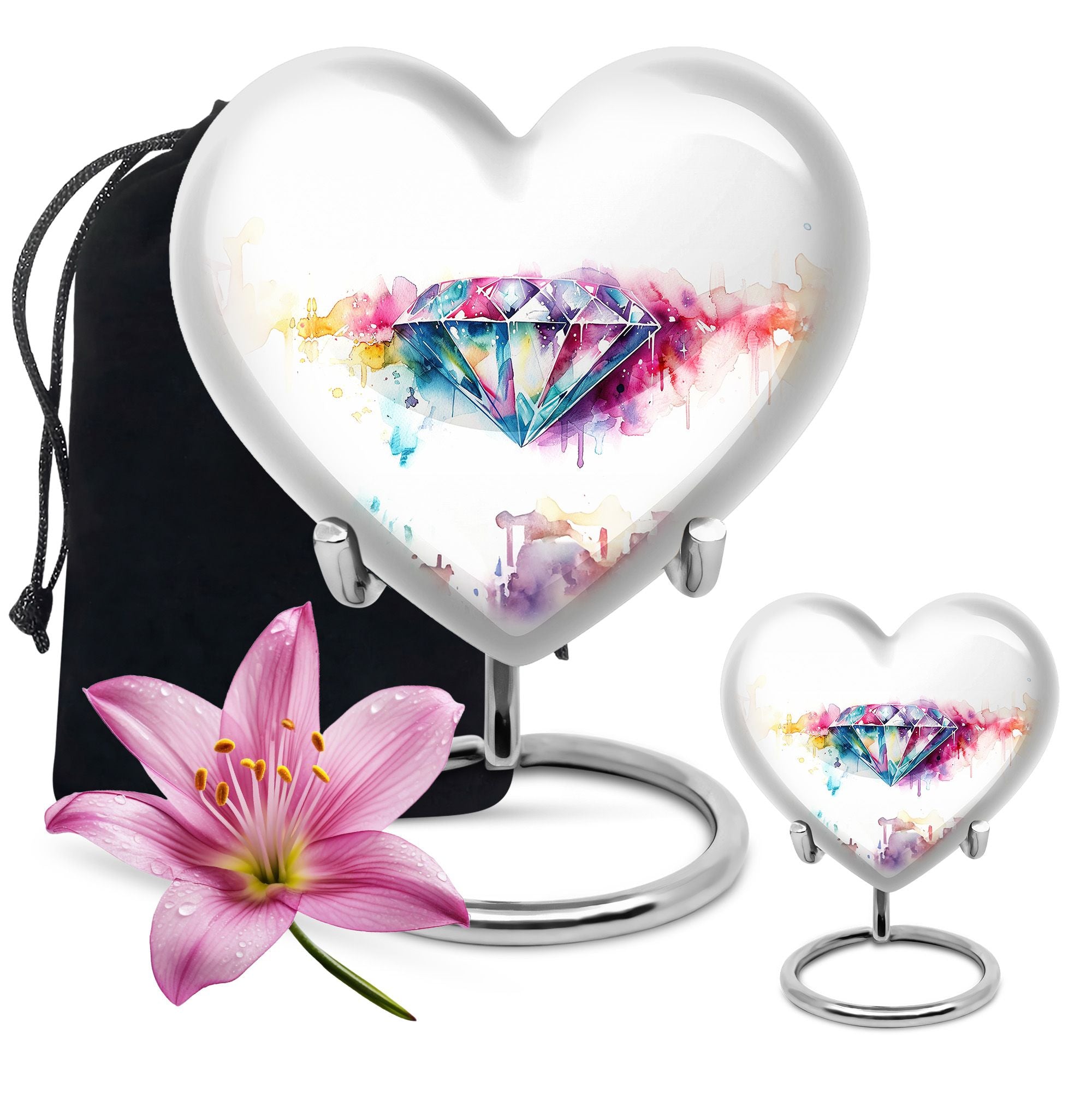 Honor your loved ones with our exquisite 10-inch diamond urn, a stunning selection amongst memorial urns. Tailored fit for adult male ashes, this large urn captures the essence of immortality in its capacity of 200 cubic inches to hold your dear one's memory. Boasting an abstract theme, its heart urn design adds a sentimental touch to your reminiscence. The package includes a velvet pouch for assured containment of the precious ashes. Weighing just 3.3 pounds and crafted with durable Aluminium, this memorial urn proves to be both substantial and manageable. Amplifying its significance, avail of personalised touch with engraved names for a lasting impact. Opt for this edifice of recollection as funeral urn for human ashes, and let it harmoniously blend with your decor as a tribute to the departed soul. Kindly note, our urns are designed to cater to the 'funeral urns for adult ashes women large' category distinguishing our product range.