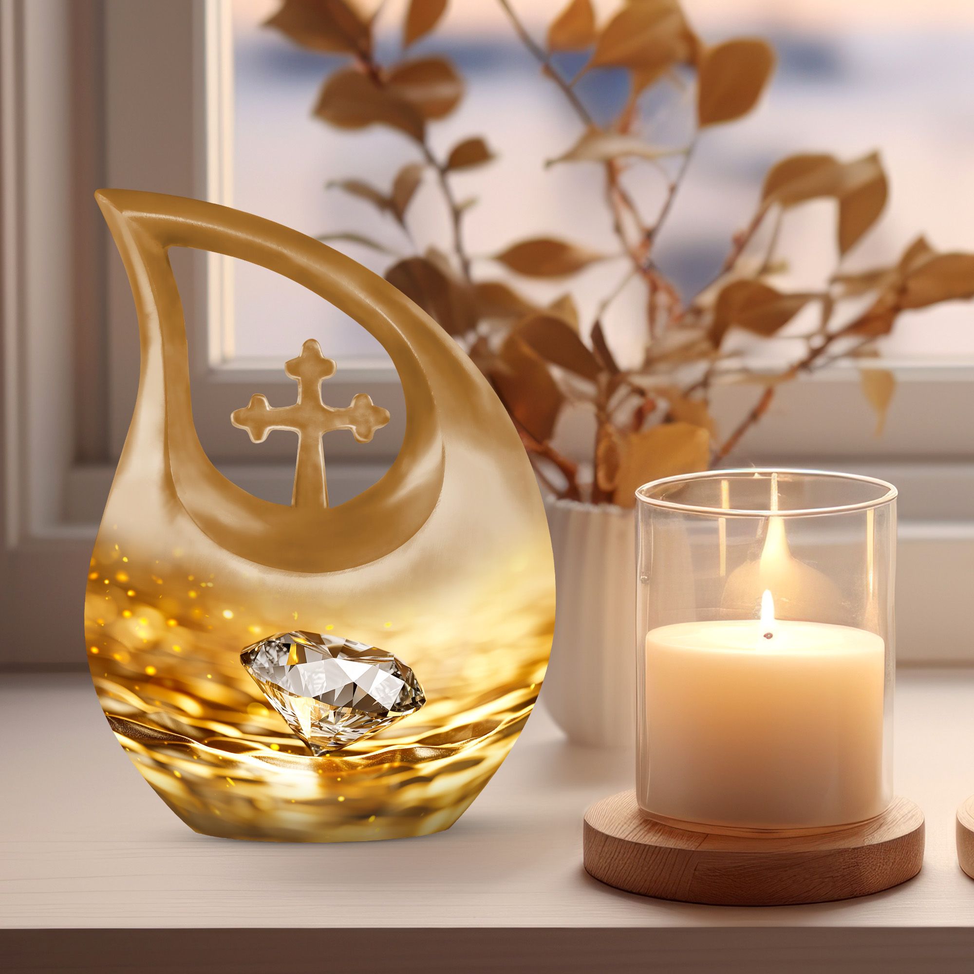 The Diamond Cremation Urn – Golden Handmade Cremation Urn for Human Ashes is a beautifully crafted memorial piece designed to honor a loved one with dignity, elegance, and timeless artistry. Its radiant golden finish and diamond-pattern detailing create a stunning tribute suitable for women’s ashes, men’s ashes, and families seeking a premium memorial urn.