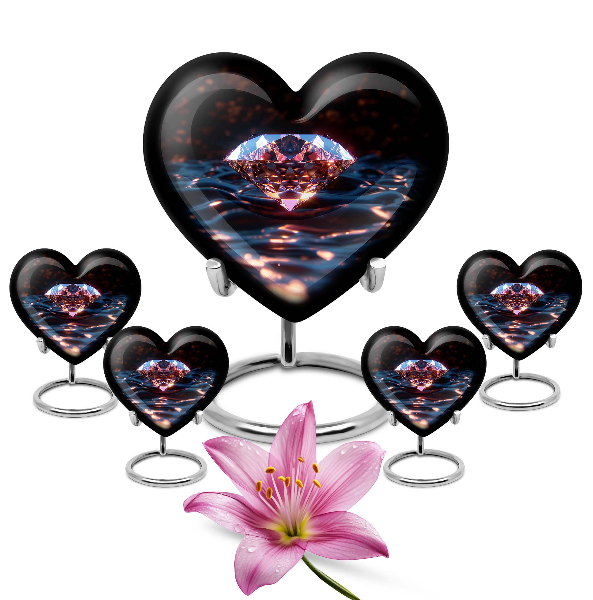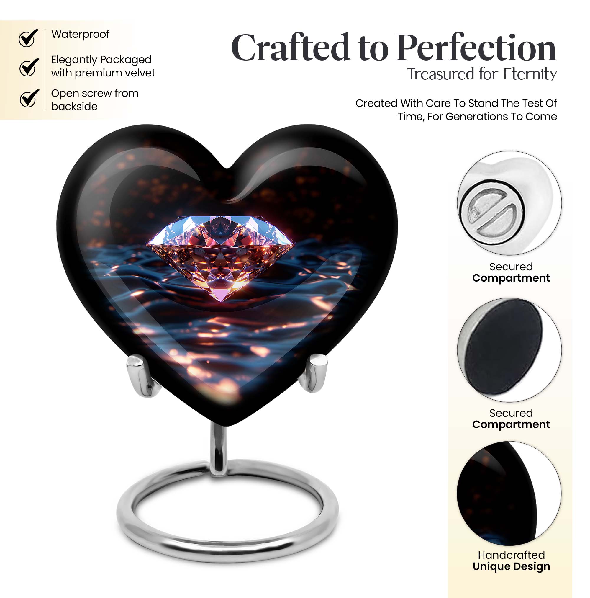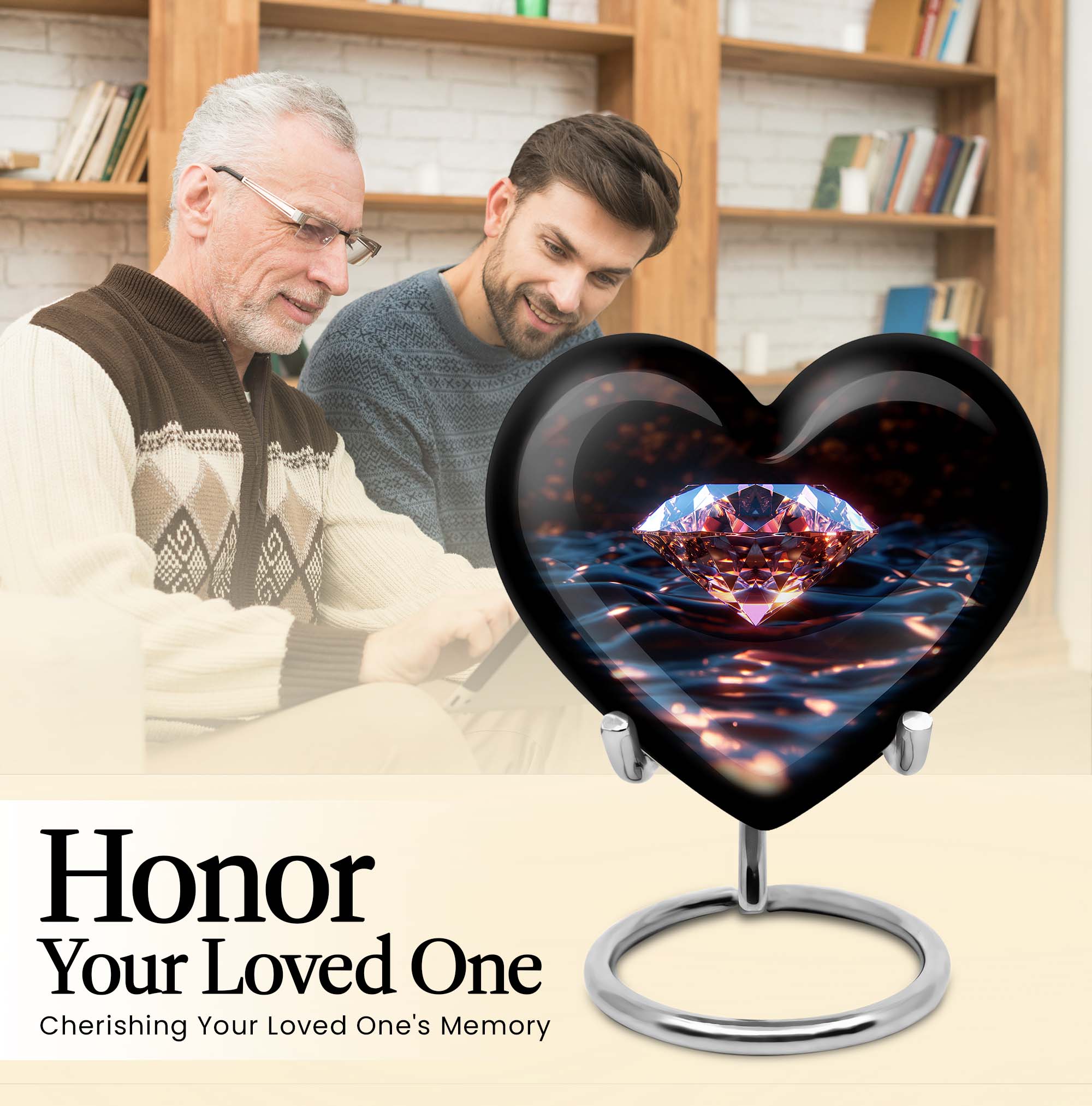 Immortalize the memory of your loved ones with our elegant Diamond Urn. This exquisite 10-inch aluminum heart-shaped memorial forever urn has been meticulously crafted with an abstract theme to ensure that it visually communicates the depth of your affection. Weighing 3.3 pounds, this substantial piece has the capacity to securely hold 200 cubic inches of ashes. Furthermore, for the convenience of our patrons, every purchase includes a velvet pouch, specifically designed for the containment of ashes. Our large urn can be personalized according to your wishes, with engraved names to make it even more special. Whether you're looking for funeral urns for human ashes adult or simply a beautiful human cremation urn, this product caters to your needs, evoking serenity and remembrance every time you gaze upon it. Uncommon terms like 'Memorial Urns' and 'Urns metal' highlight the craftsmanship and detail that has been poured into the creation of this piece. Add a touch of uniqueness to your sacred memorial rituals with our Diamond Urn.