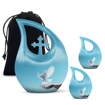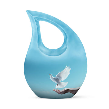 Crafted from premium aluminum, this urn showcases an exquisite hand-painted white dove gliding across soft clouds. The fine detailing and durable construction ensure long-lasting preservation. Its secure screw-top lid keeps the ashes safely contained, while the polished finish adds timeless grace. Whether displayed at home or used as burial urns for human ashes adult male, it stands as a dignified symbol of remembrance.