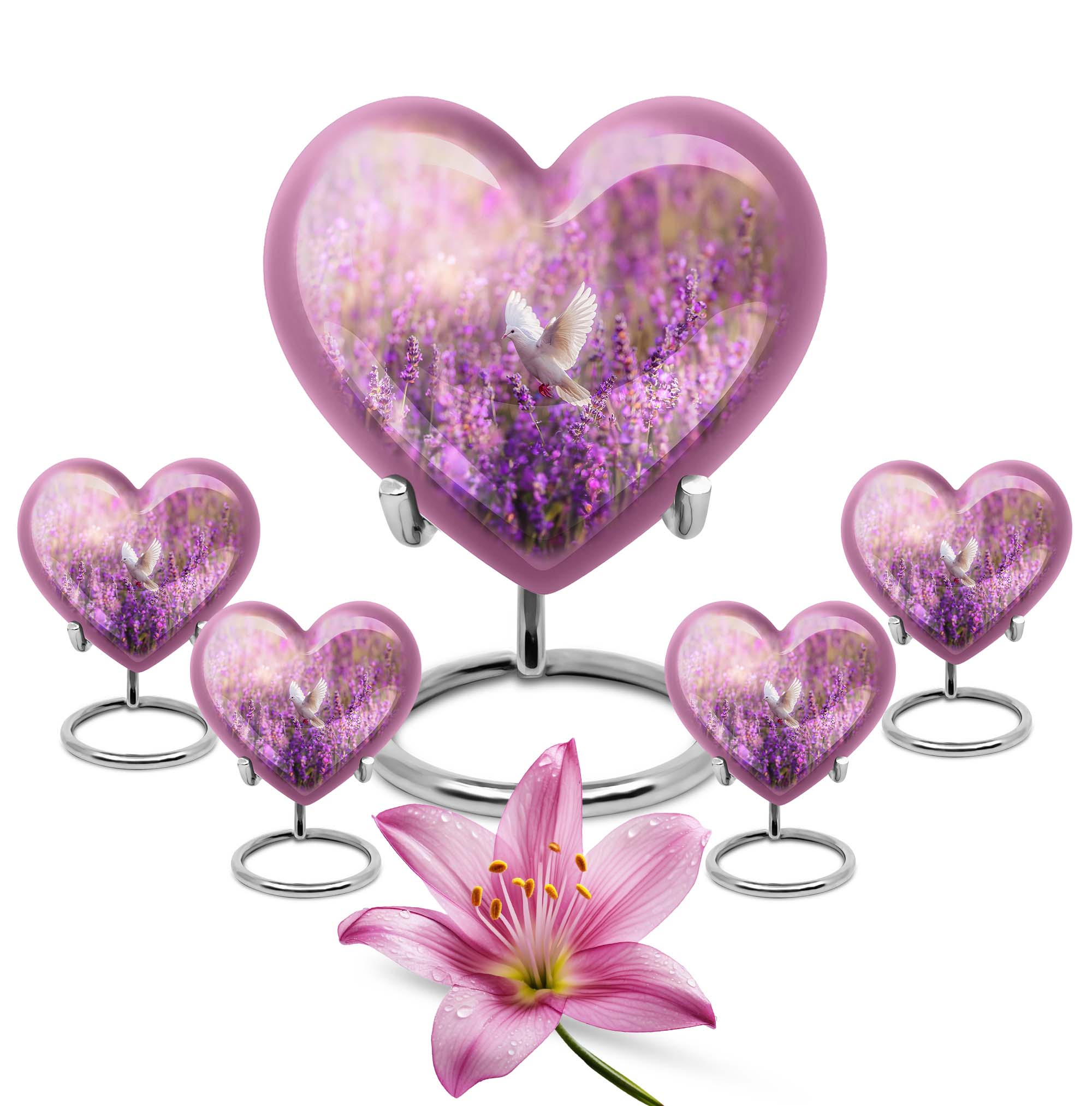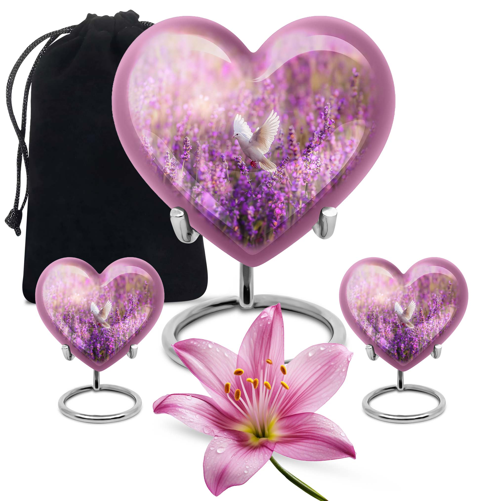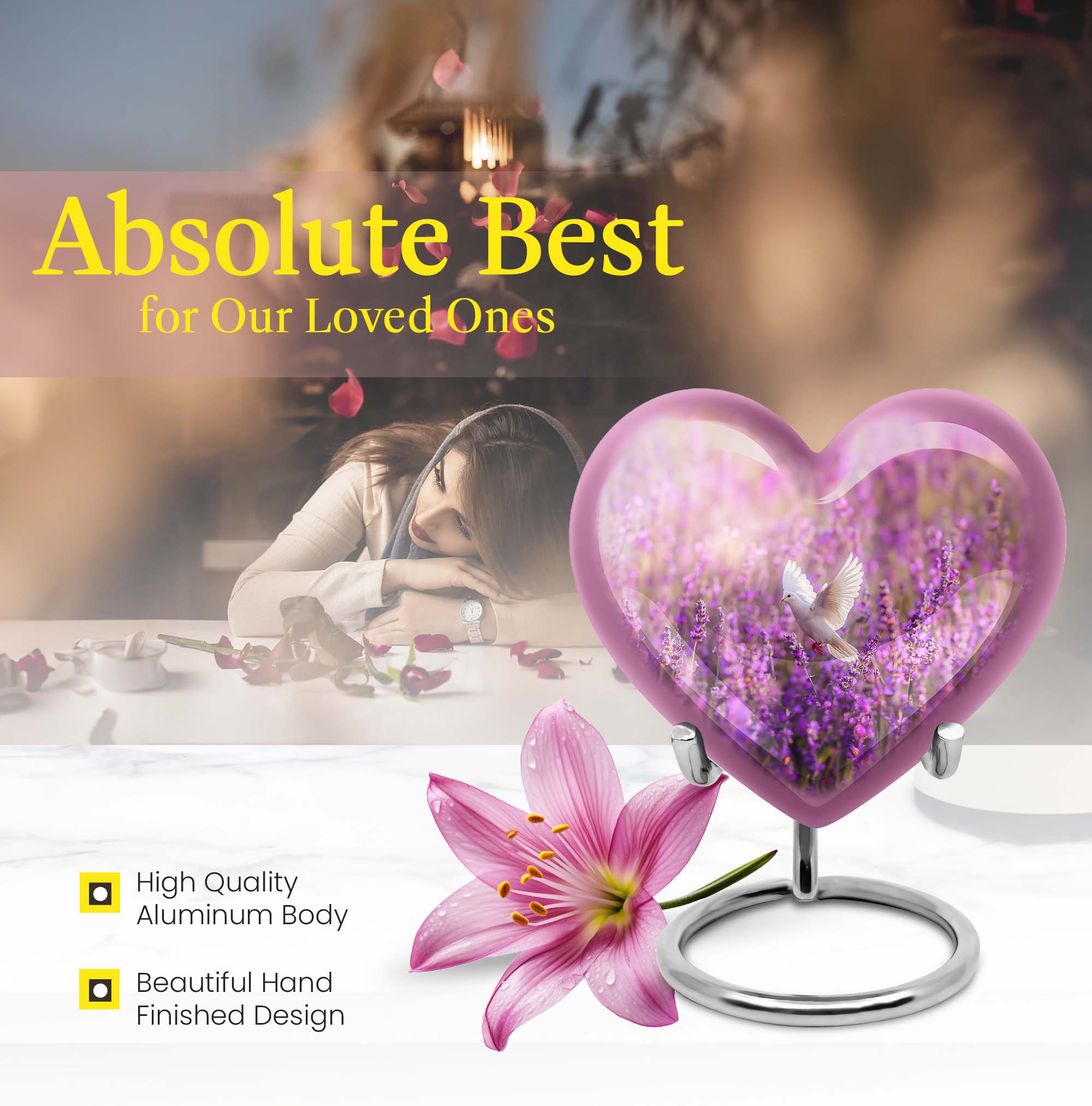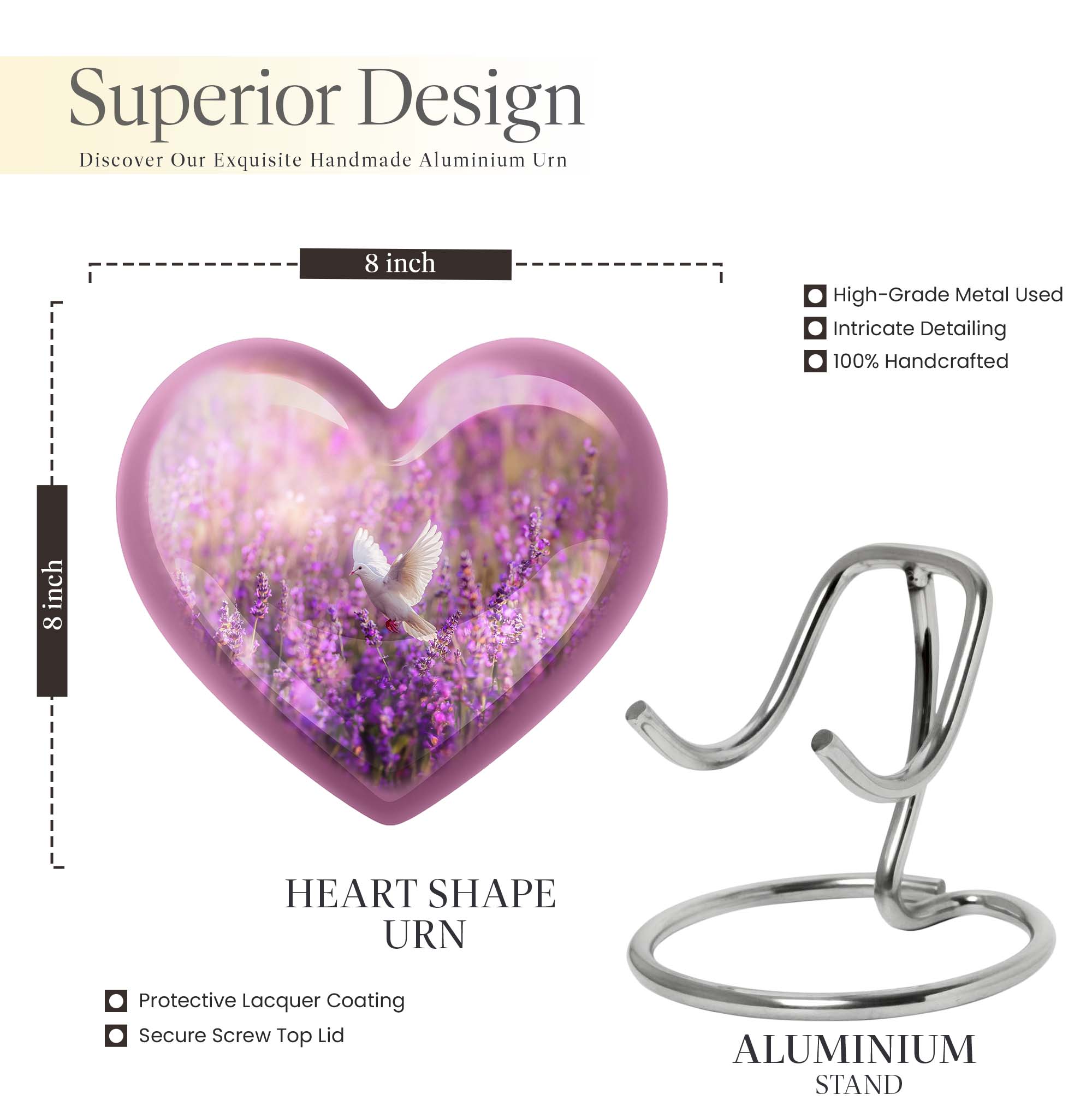 Meticulously crafted, our beautiful heart urn offers a unique resting place for your dear ones' cherished memories. The intricate design of the white dove on the purple theme accentuates its aesthetic appeal while effectively providing a holding capacity of 200 cubic inches. Measuring 10 inches in height and weighing 3.3 pounds, this aluminium urn is substantial and sturdy, ensuring a long-lasting tribute to your loved one. The urn comes with a velvet pouch for safe containment of the precious ashes. Our memorial urns are ideal for personalizing by engraving names, making them the perfect sentiment in memory of those you hold dear. With a 10 Inch size, this urn can easily accommodate the ashes of adult women and men alike. The urns feature a butterfly theme, resonating with the concept of freedom and transformation in the afterlife. These large urns are more than a mere container - they represent love, respect, and an enduring bond. Great detail is given to the material, finish, and design, making it a dignified choice for a final resting place.