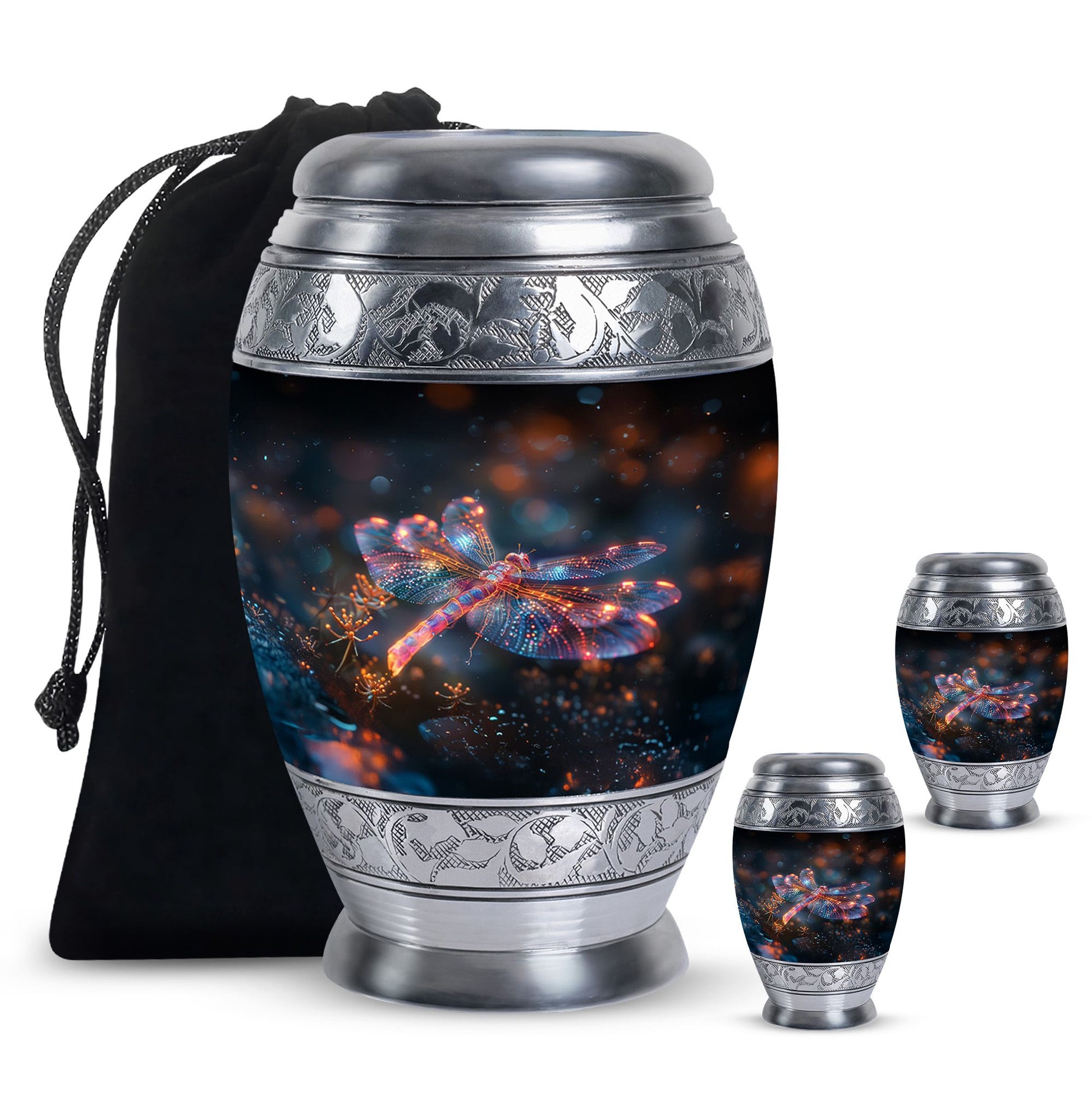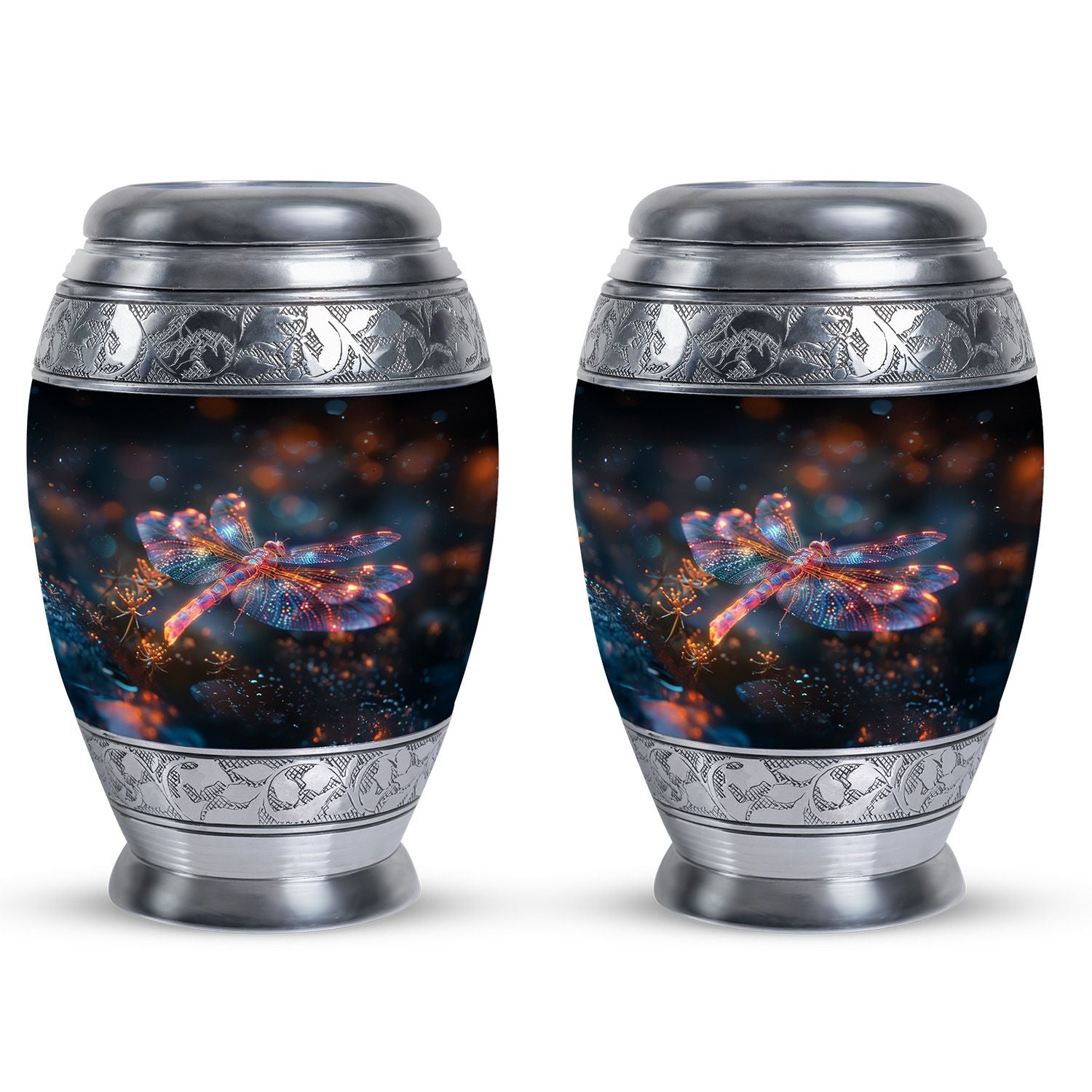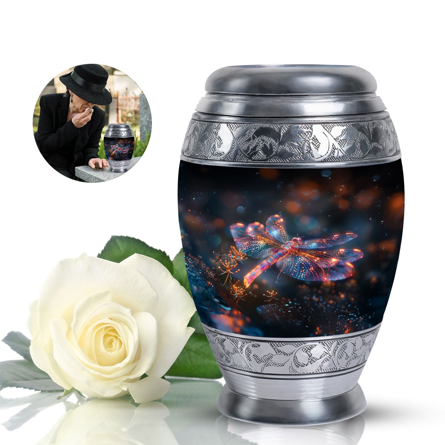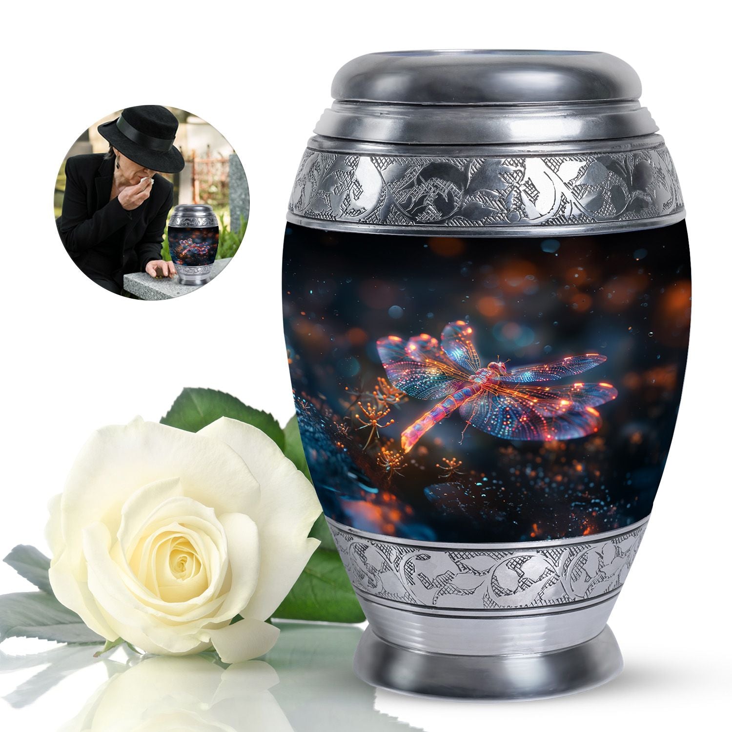 The Cosmic Dragonfly Dance Urns offer a graceful way to honor and remember a cherished loved one. Designed for large funeral urn use, they are perfect as urn adult male, urns ashes adult female, or funeral urns for adult ashes women. The delicate dragonfly motif symbolizes transformation and hope, providing comfort and a meaningful tribute for families during times of loss.