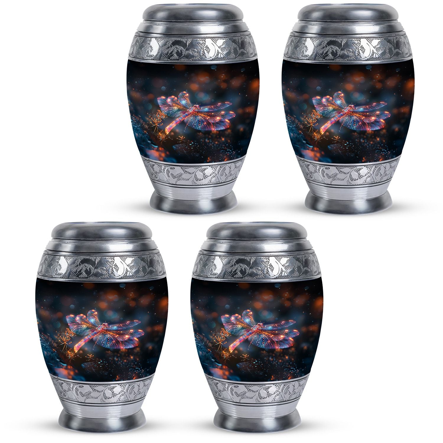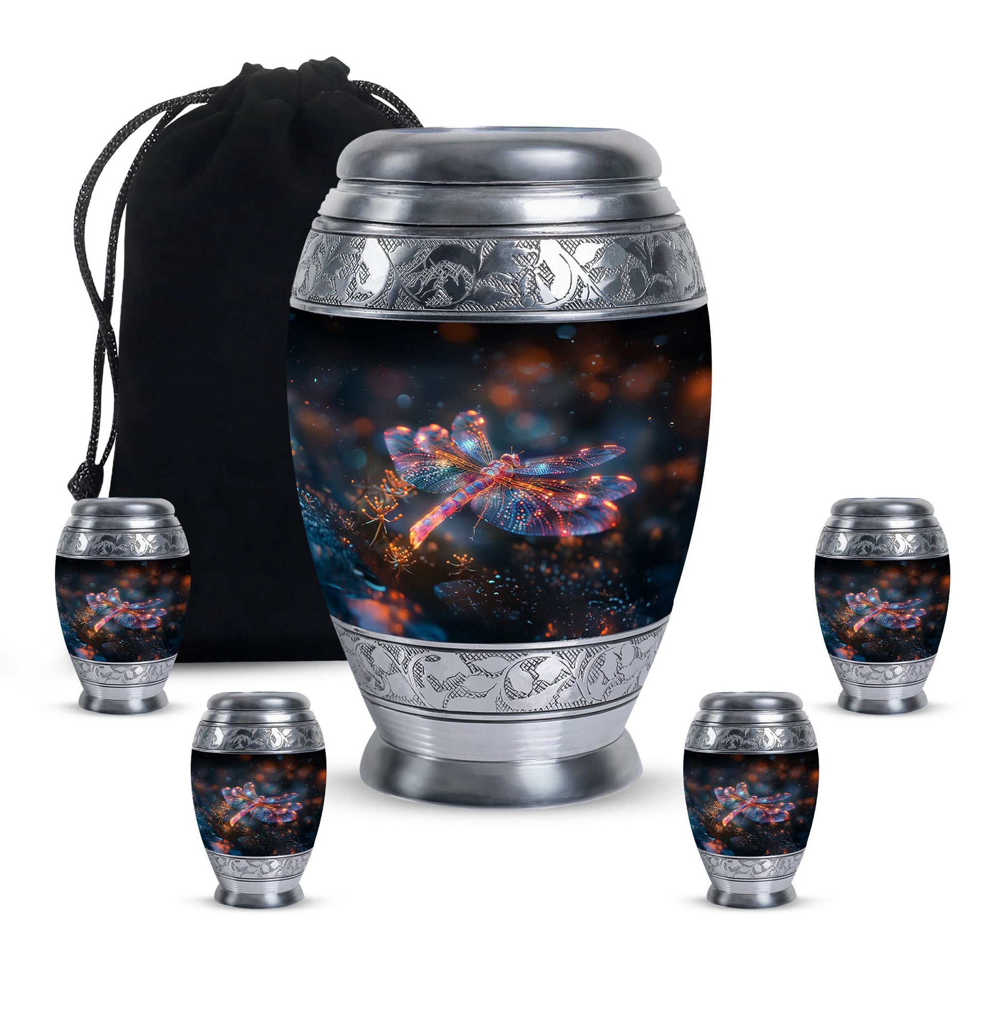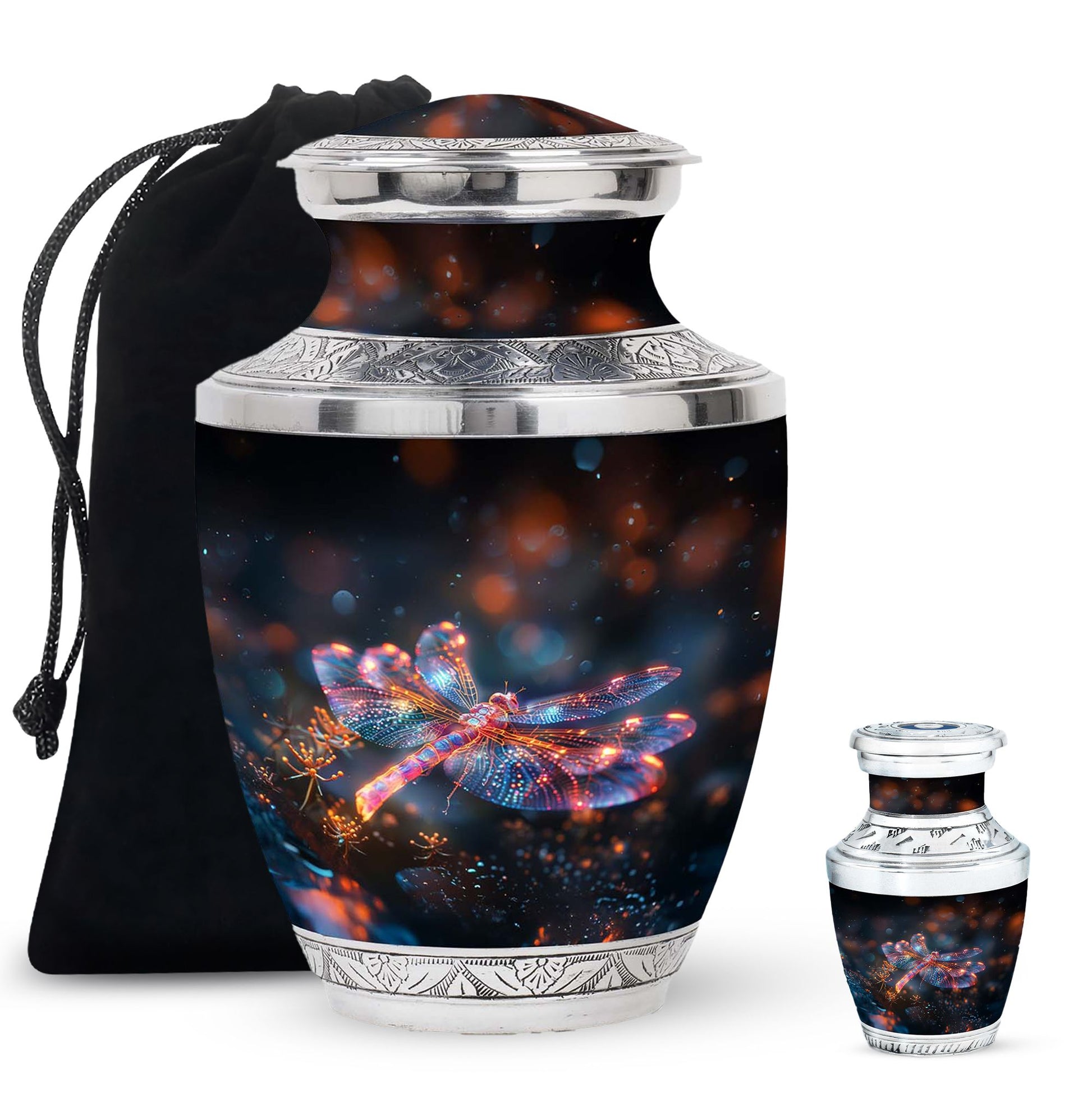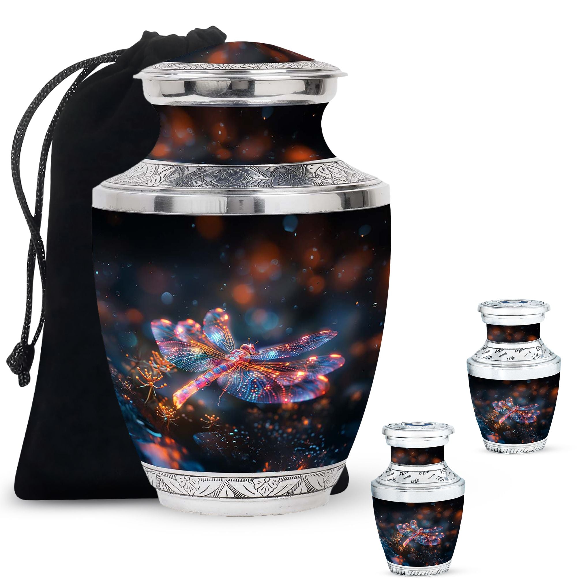 The Cosmic Dragonfly Dance Urns offer a graceful way to honor and remember a cherished loved one. Designed for large funeral urn use, they are perfect as urn adult male, urns ashes adult female, or funeral urns for adult ashes women. The delicate dragonfly motif symbolizes transformation and hope, providing comfort and a meaningful tribute for families during times of loss.