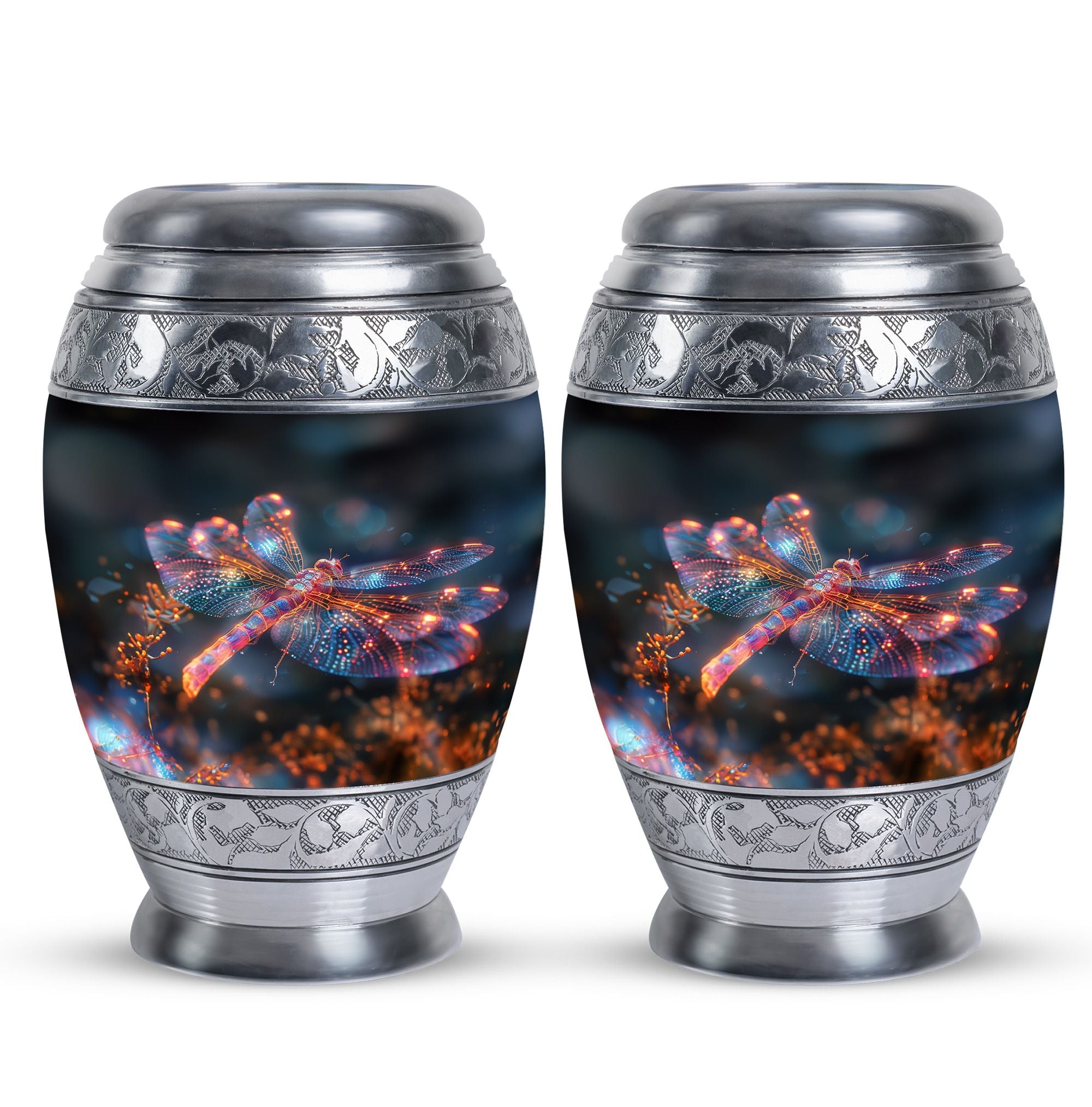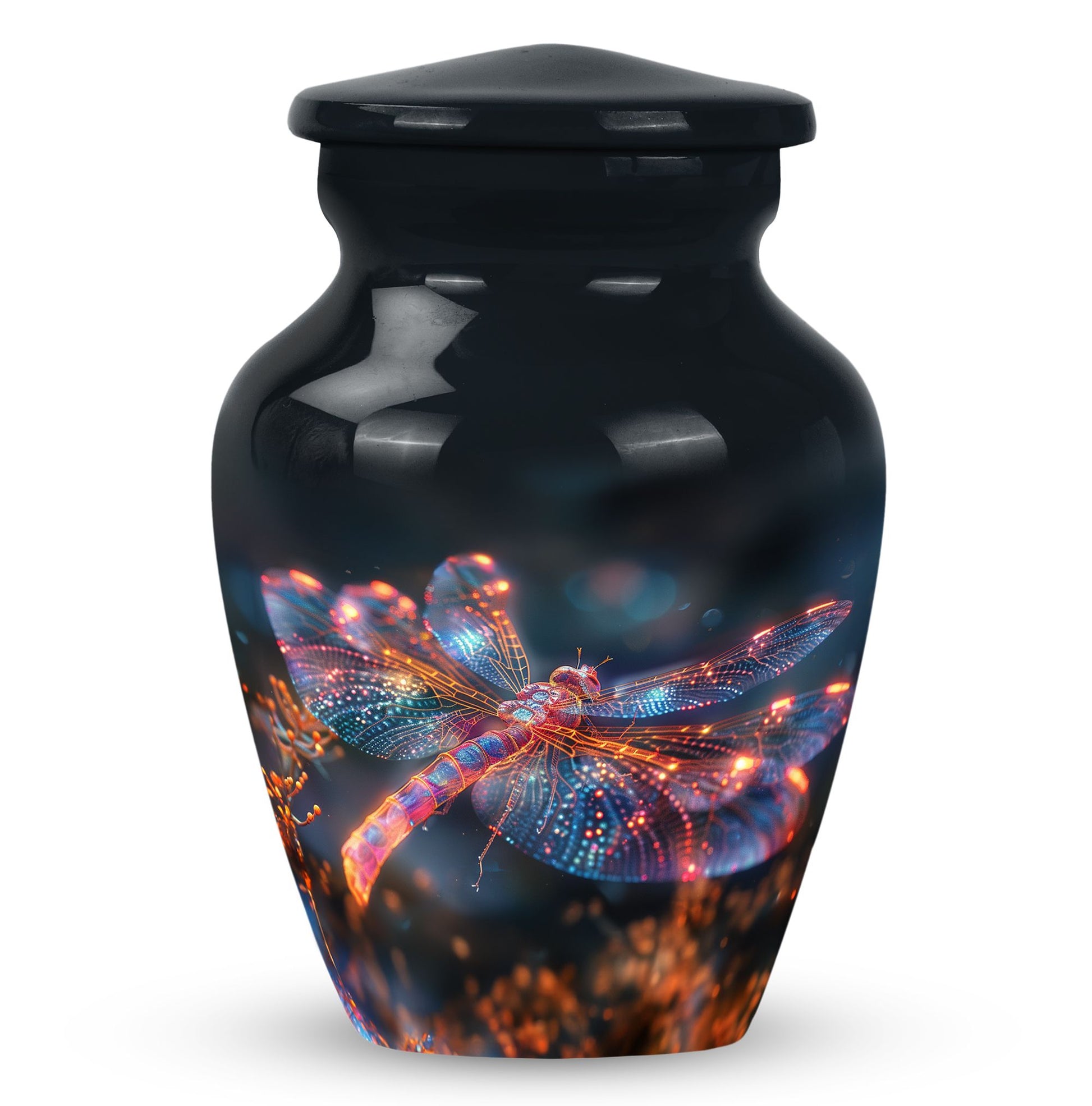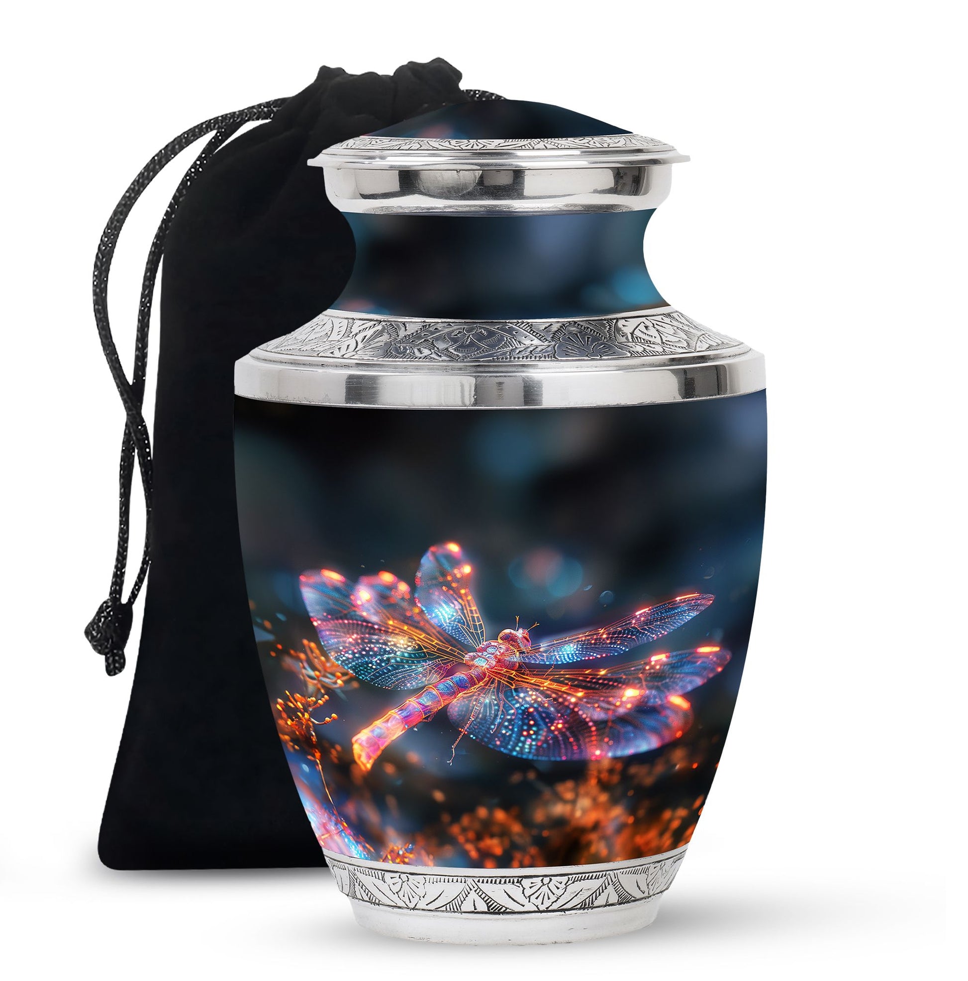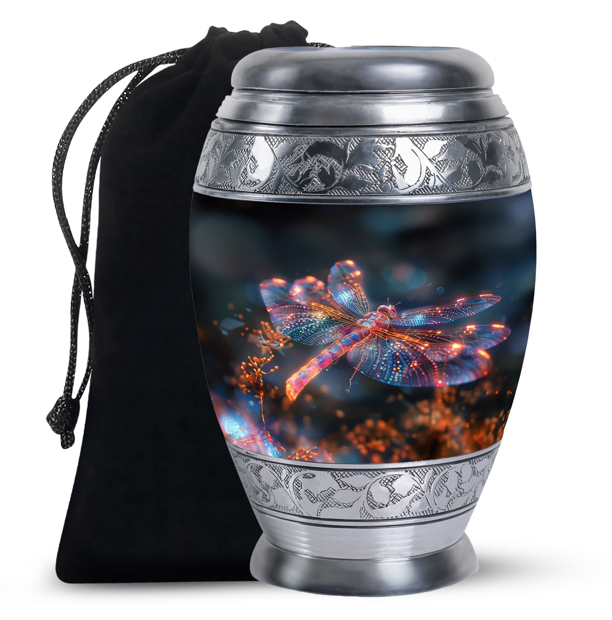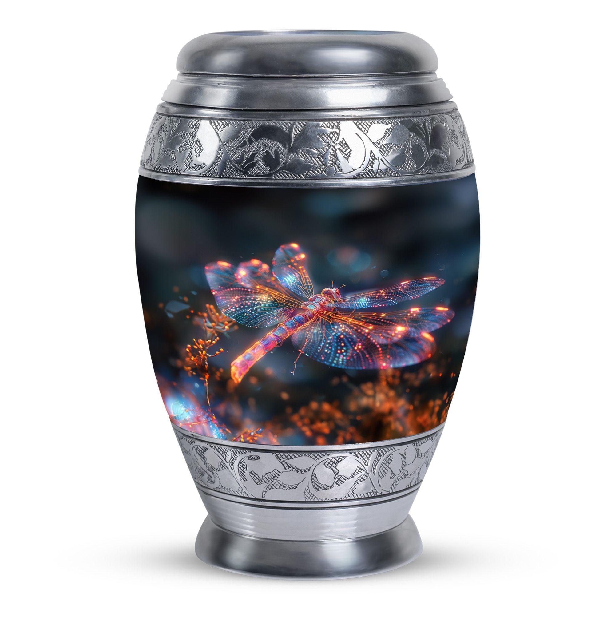 Crafted with precision and compassion, this piece blends fine craftsmanship with durable materials. The vibrant dragonfly motif, glowing in warm fiery tones, represents renewal and peace—making it one of the most meaningful adult urns for men & women. Made of premium aluminium, it provides secure storage for ashes and can be used as a burial urn or a stunning display keepsake. Its versatility makes it perfect for those seeking urns for human ashes women or mens urns for human ashes with equal elegance.