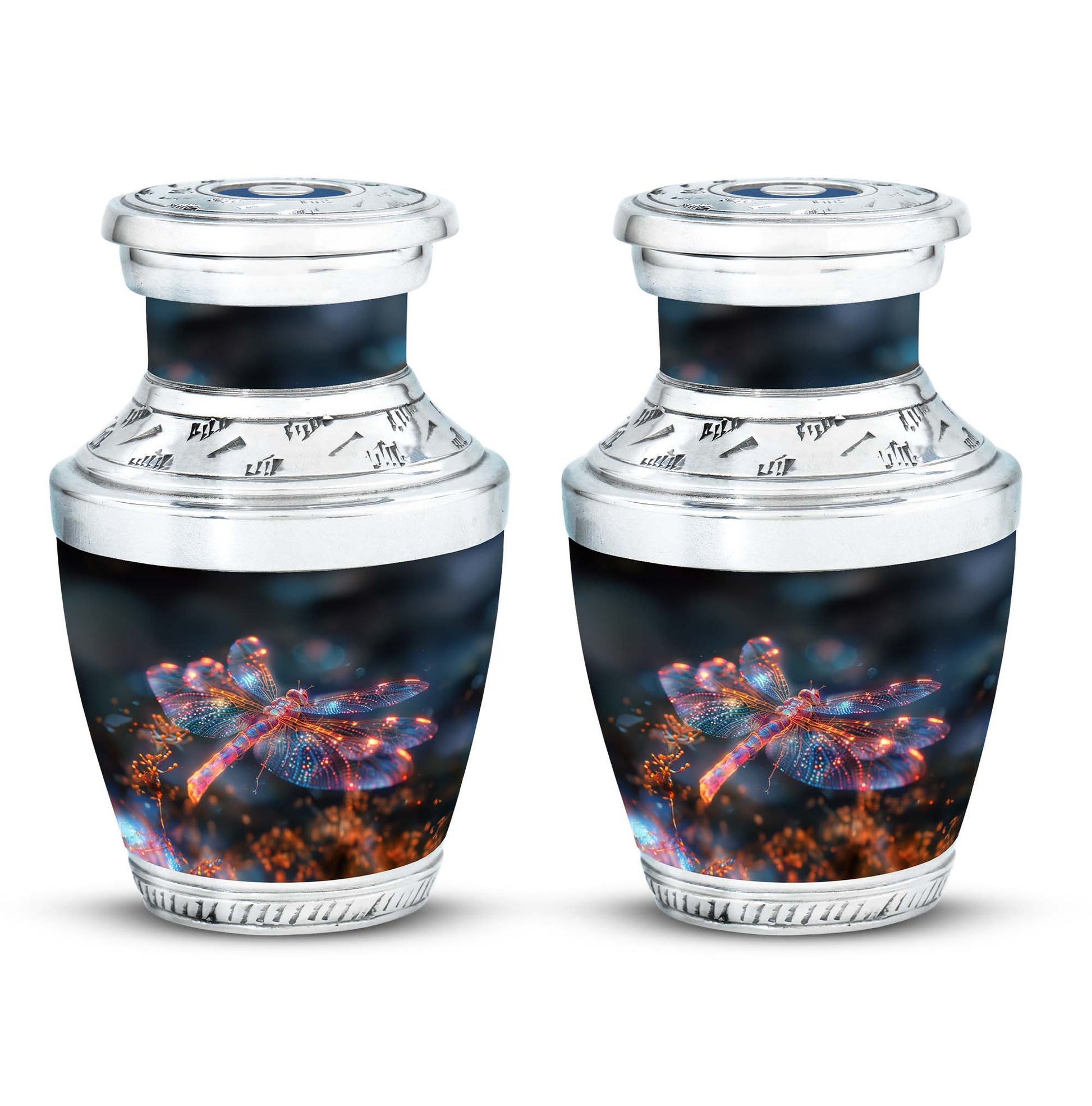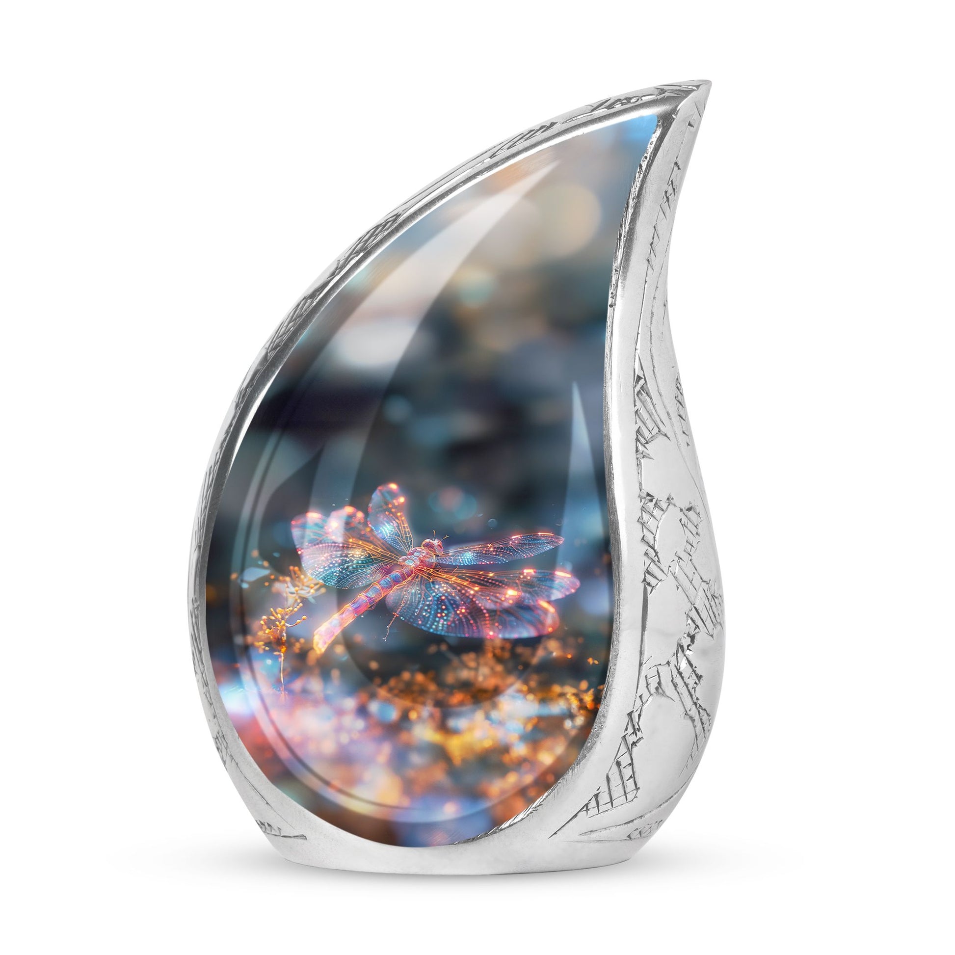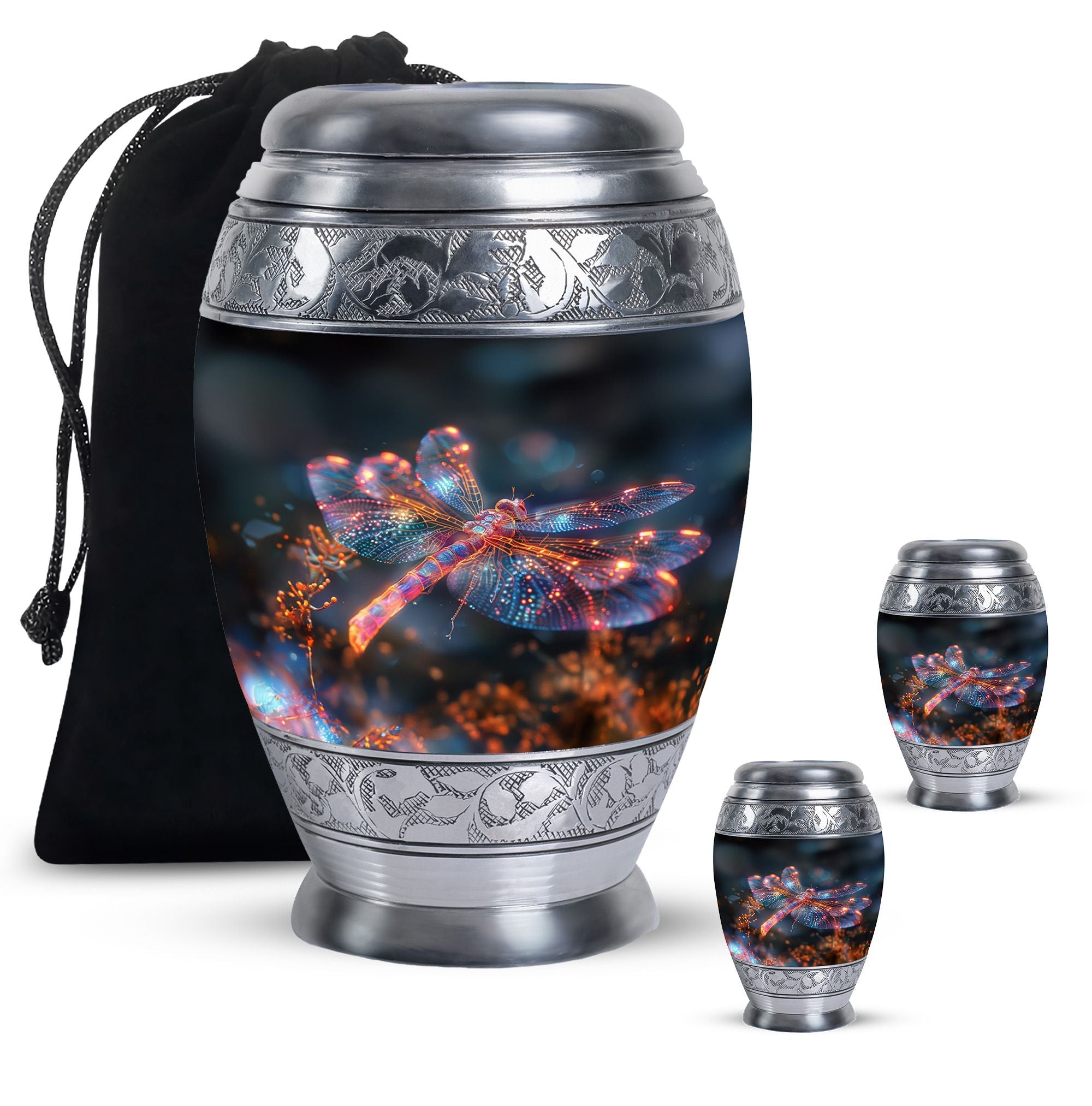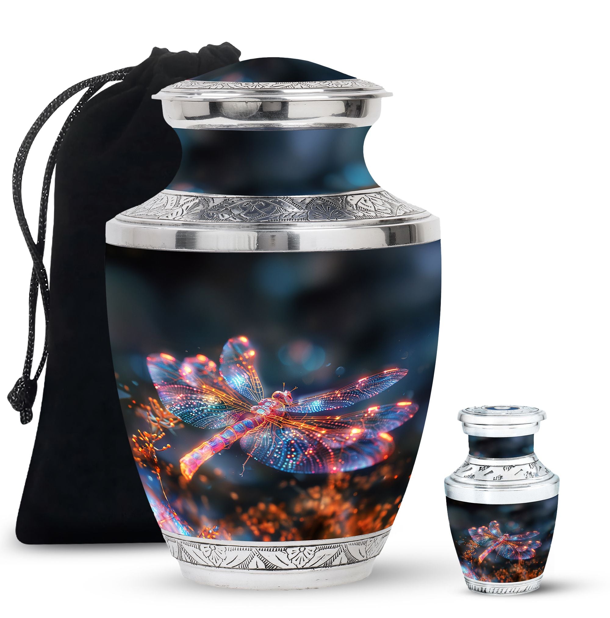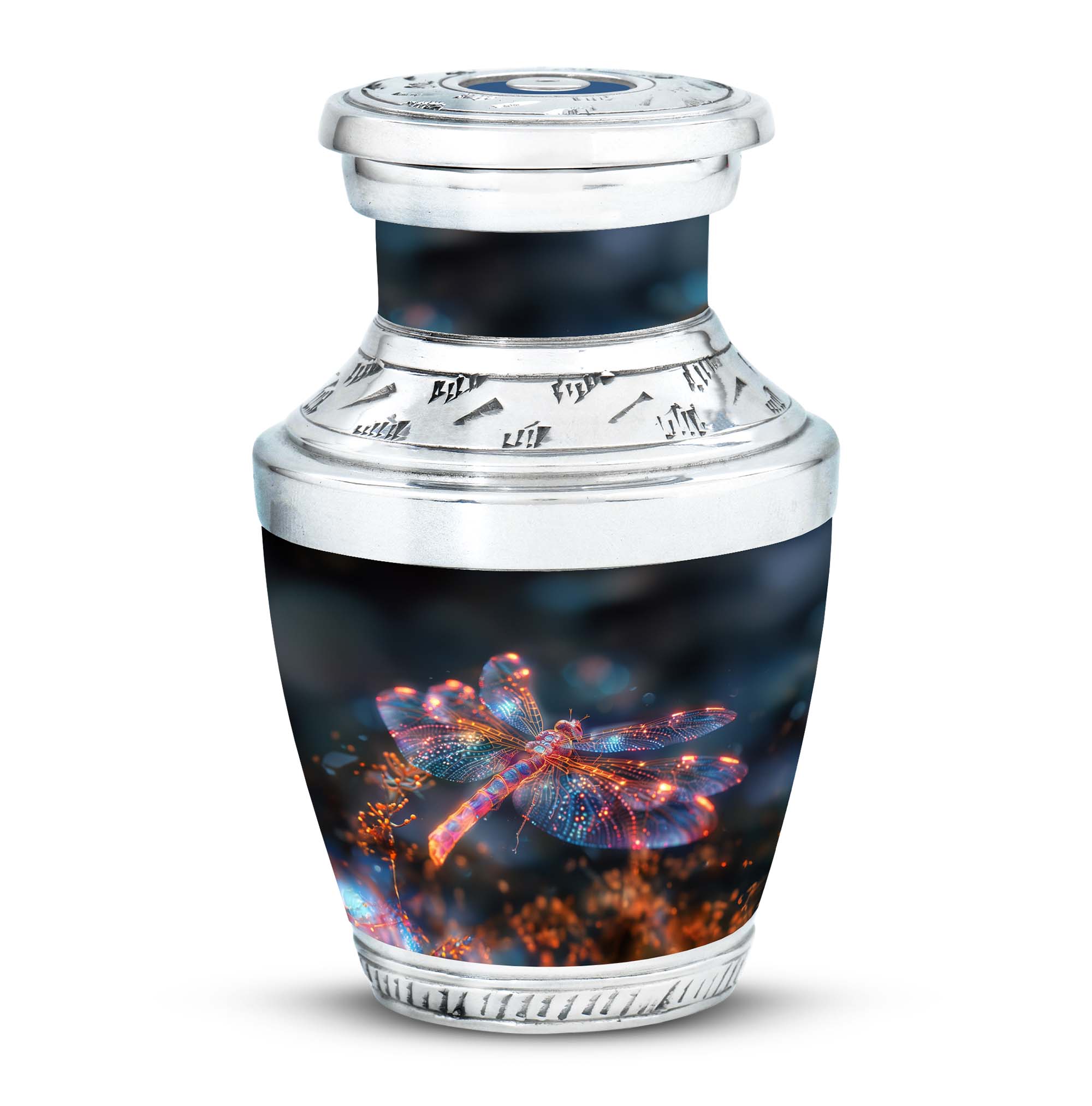 Crafted with precision and compassion, this piece blends fine craftsmanship with durable materials. The vibrant dragonfly motif, glowing in warm fiery tones, represents renewal and peace—making it one of the most meaningful adult urns for men & women. Made of premium aluminium, it provides secure storage for ashes and can be used as a burial urn or a stunning display keepsake. Its versatility makes it perfect for those seeking urns for human ashes women or mens urns for human ashes with equal elegance.