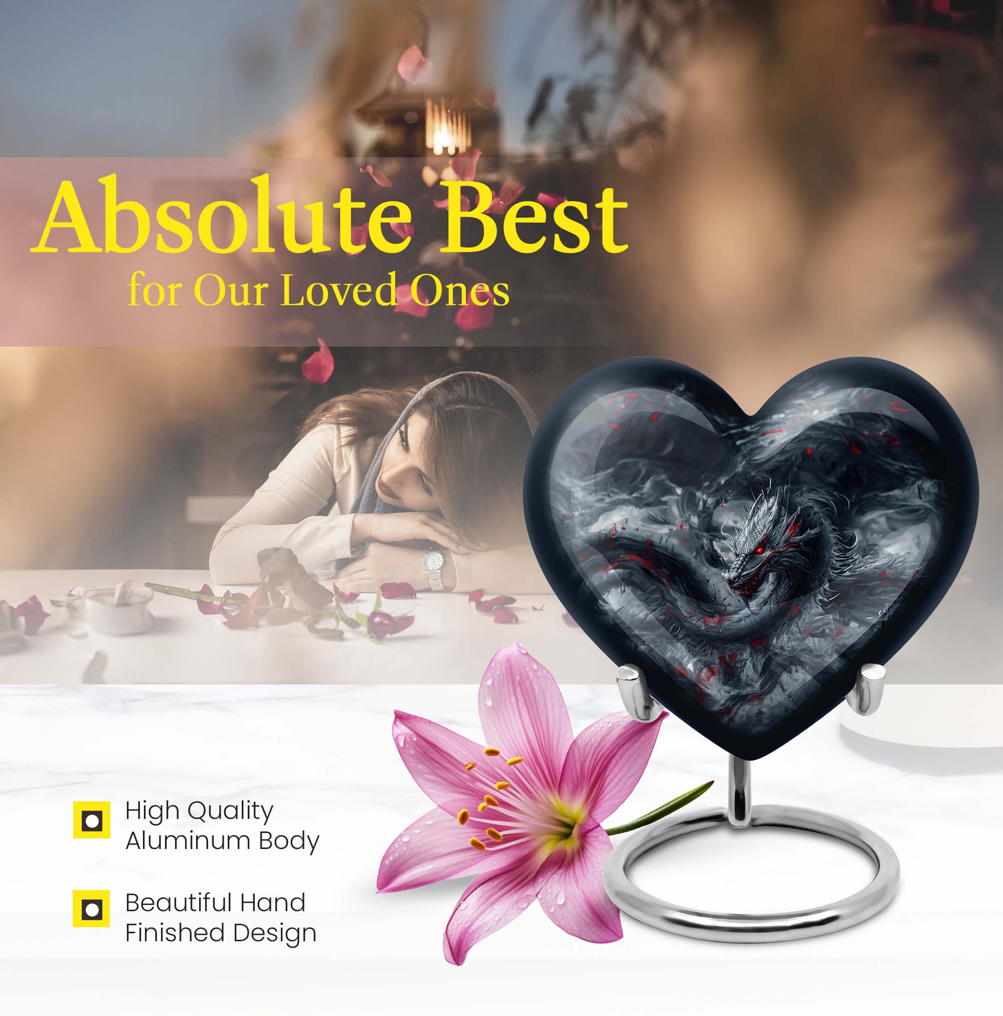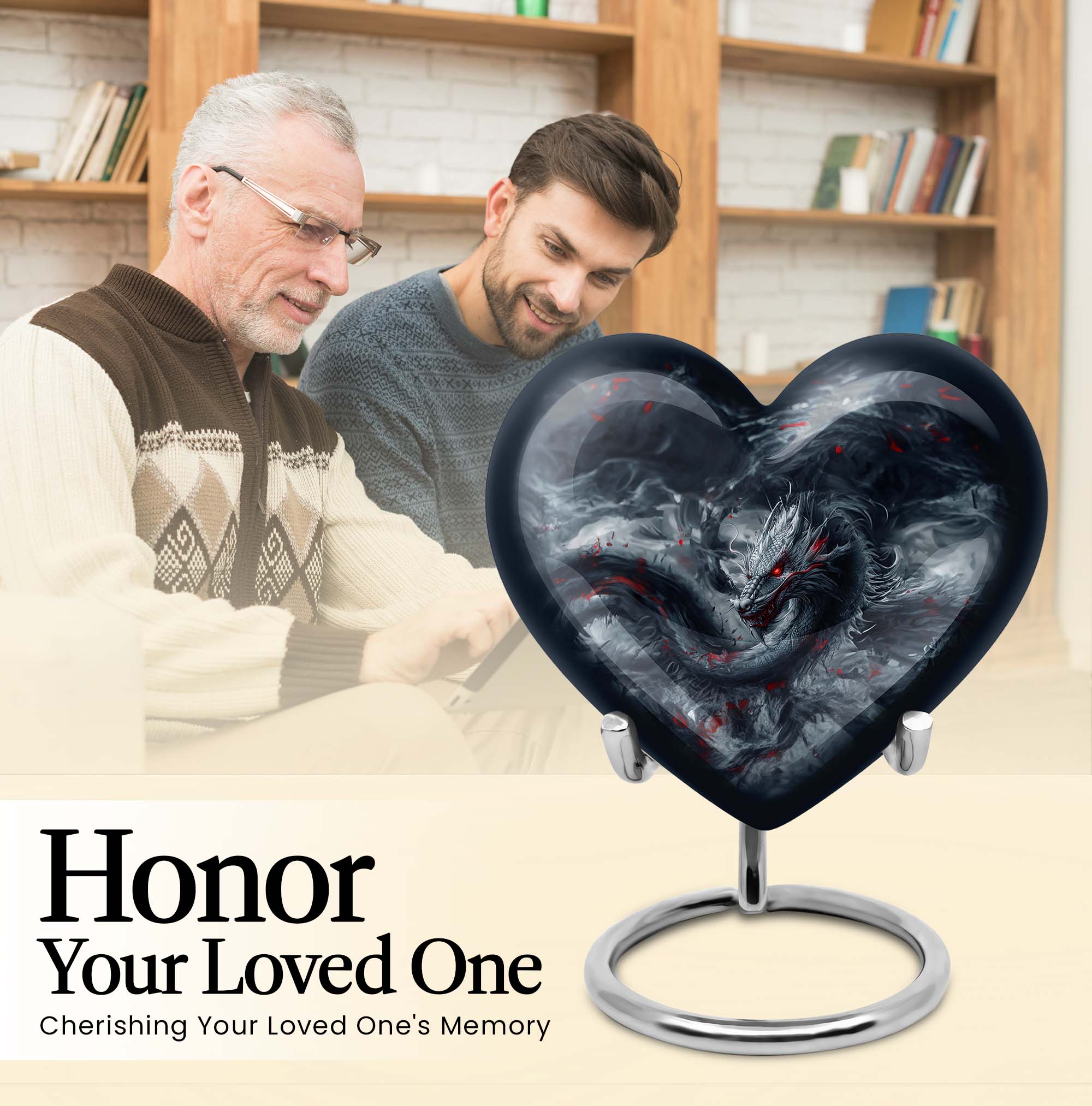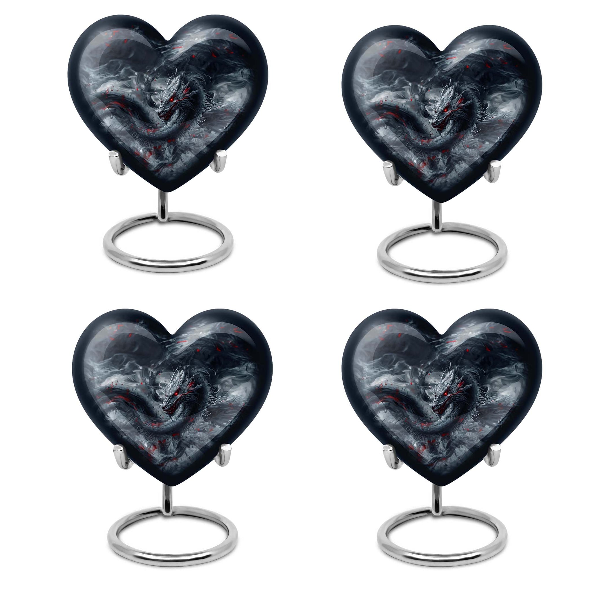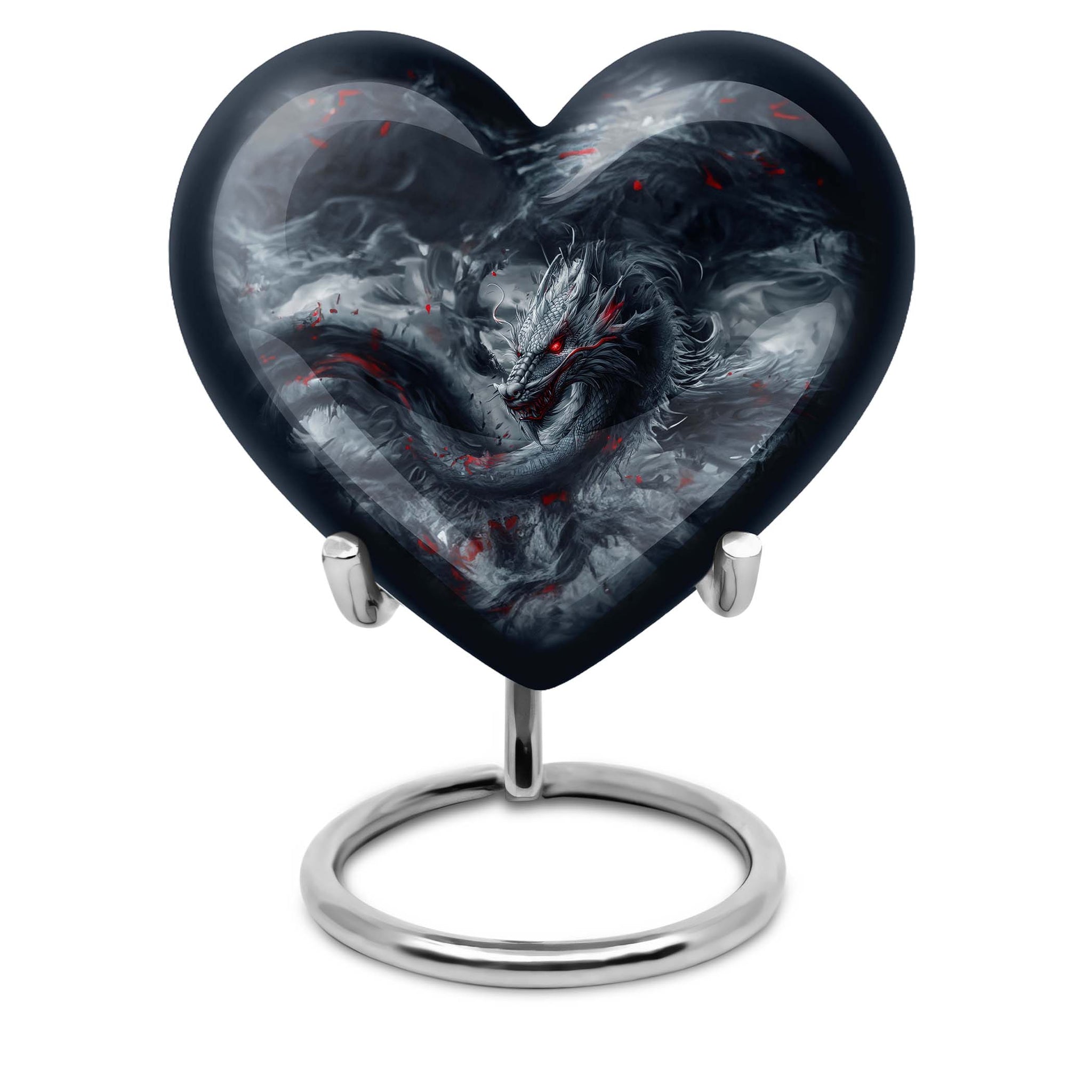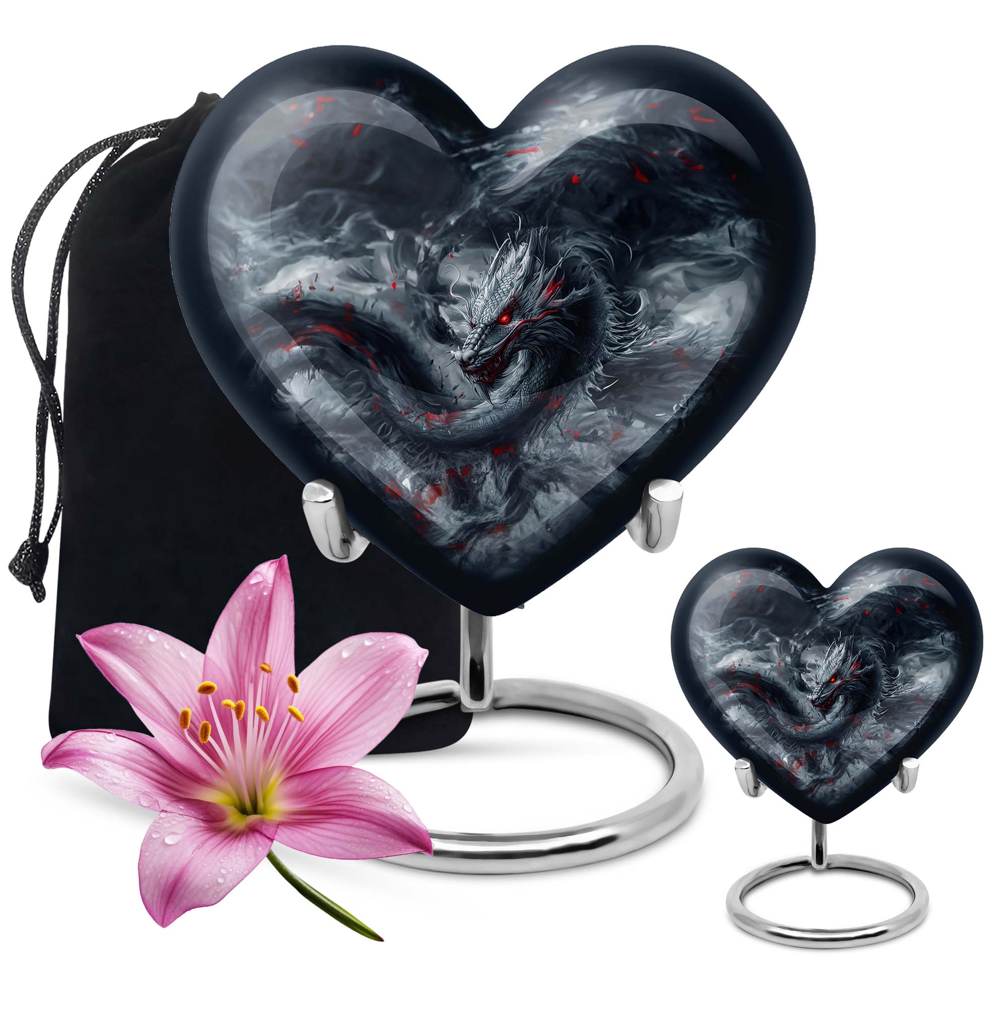 Accentuate your memorial ceremony with our carefully crafted dragon urn, a remarkable funeral urn for men's ashes. Combining reminiscent artistry with practicality, the heart urn veils the serene essence of final respects. Our large aluminum cremation urn measures 10 inches high and can accommodate 200 cubic inches of ashes. Hefty yet suitable to handle, it exudes refinement without compromising durability, weighing a mere 3.3 pounds. The urn's abstract theme reverberates a somber, distinct vision, prompting an introspective connection with its owner. Customize this eccentric cremation urn by engraving names that speak volumes of and for the lost soul. A complimentary stylish velvet pouch assists in containing the ashes discreetly, providing a portable ease to this ceremonial requisite. Our product signals an era of decorative human ashes urns, outshining yet embracing the legacy of traditional adult urns for ashes. Add a soulful touch to your farewell with this sublime metal urn.
