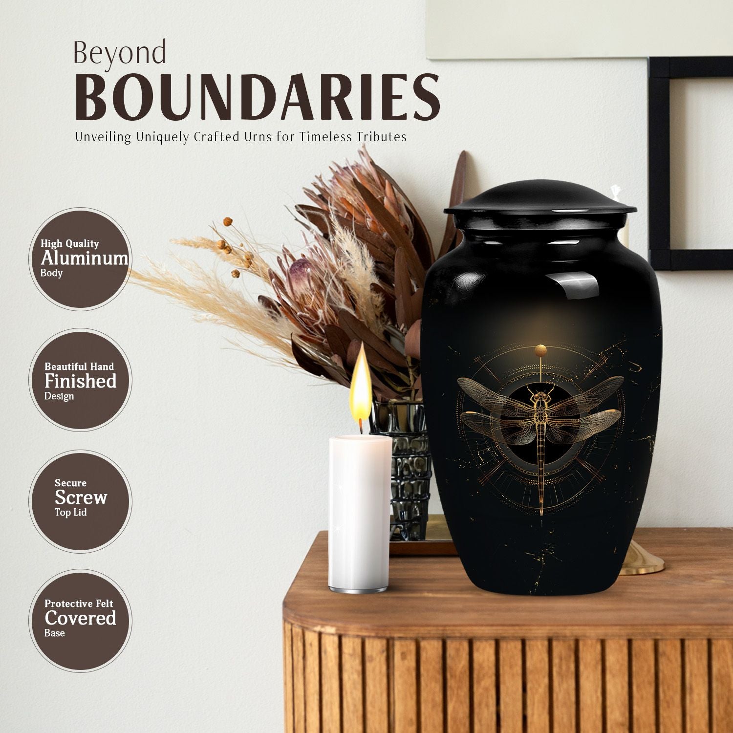 Crafted with meticulous attention to detail, this urn features a stunning cosmic dragonfly design in rich black tones. Made from durable aluminium, it combines elegance with long-lasting quality. Its versatile design makes it suitable for urns for adults men, mens urns for human ashes, or cremation urn men, while providing a secure screw-top lid to keep ashes safe. The stylish finish ensures it complements any memorial setting.