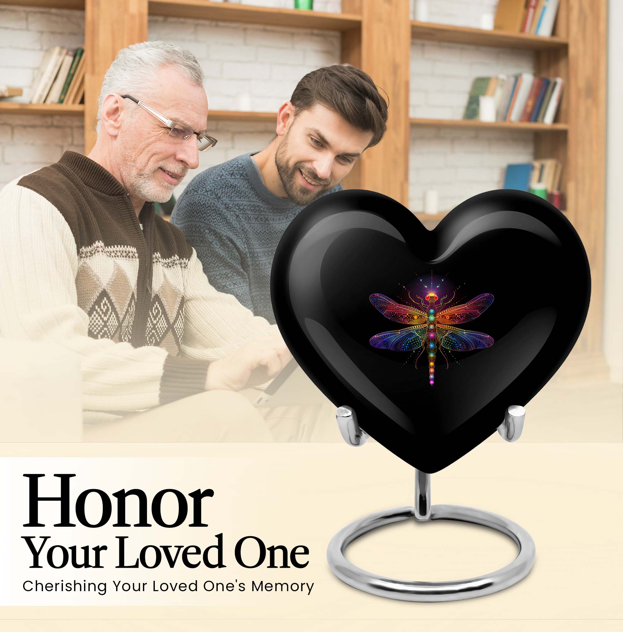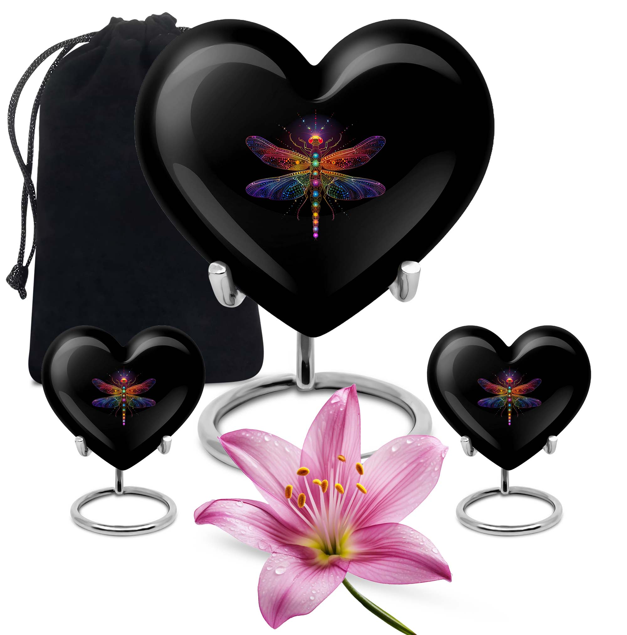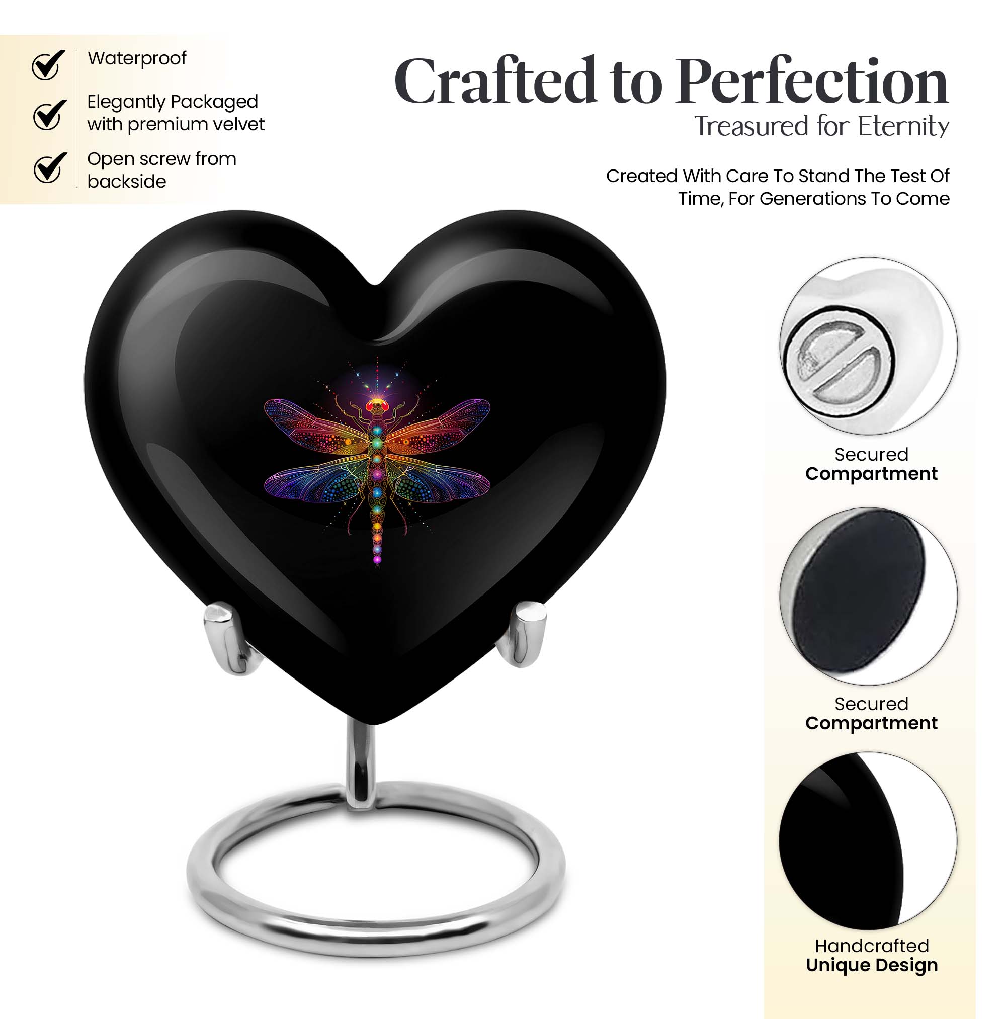 • Design: Cosmic-inspired heart urn with dragonfly motif – symbolizes transformation & remembrance