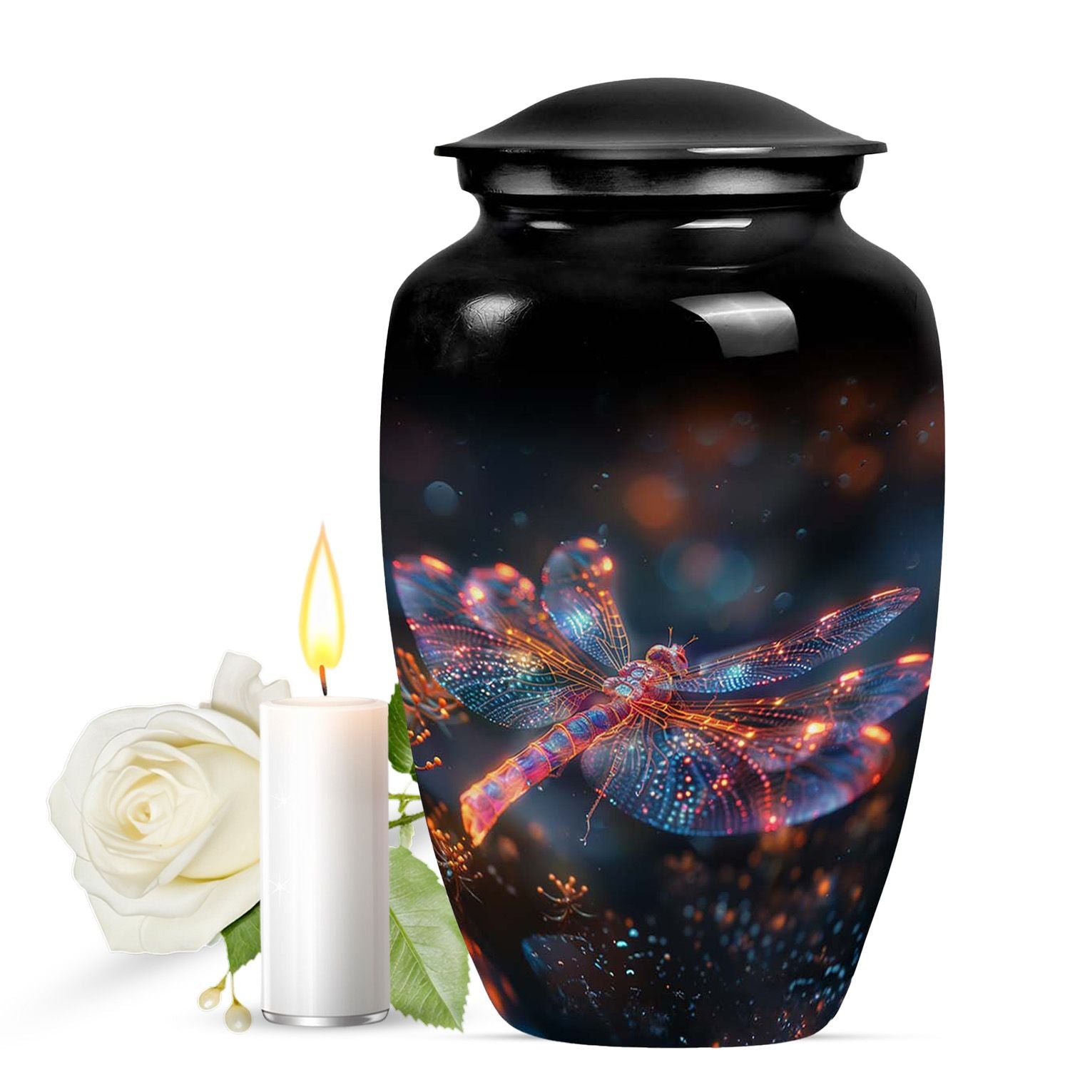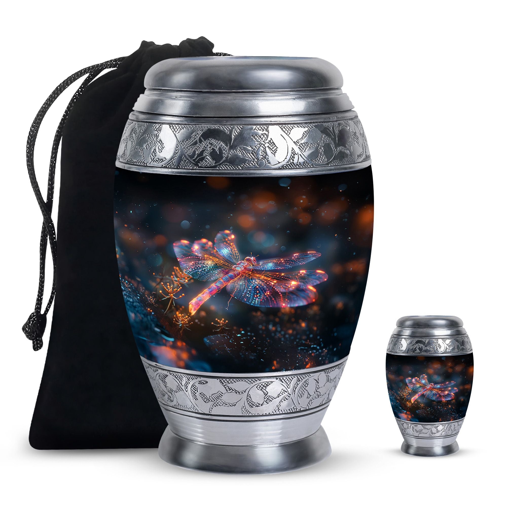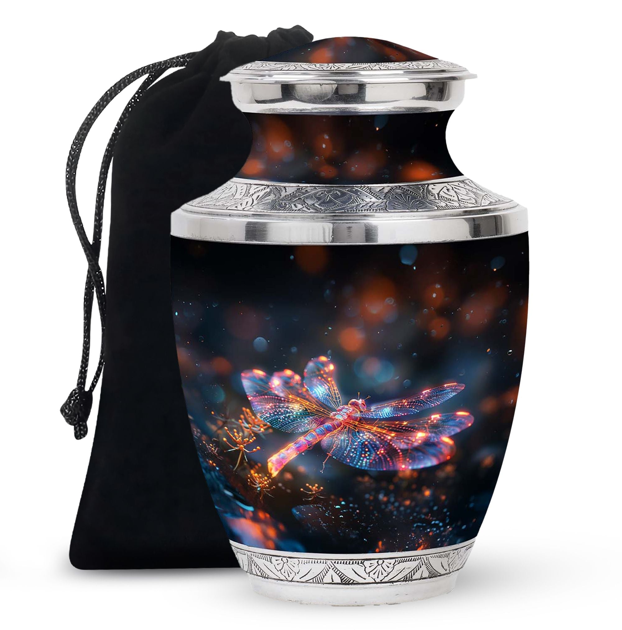 The Cosmic Dragonfly Dance Urns offer a graceful way to honor and remember a cherished loved one. Designed for large funeral urn use, they are perfect as urn adult male, urns ashes adult female, or funeral urns for adult ashes women. The delicate dragonfly motif symbolizes transformation and hope, providing comfort and a meaningful tribute for families during times of loss.