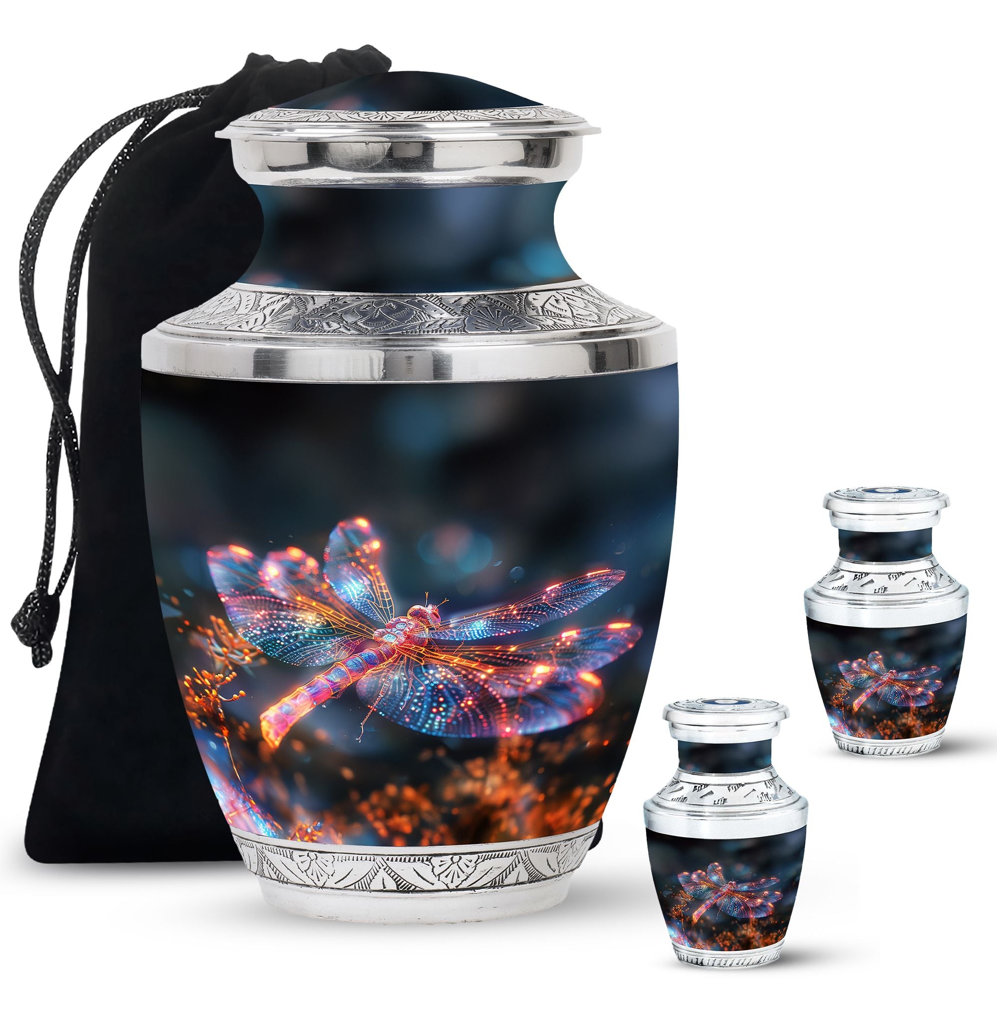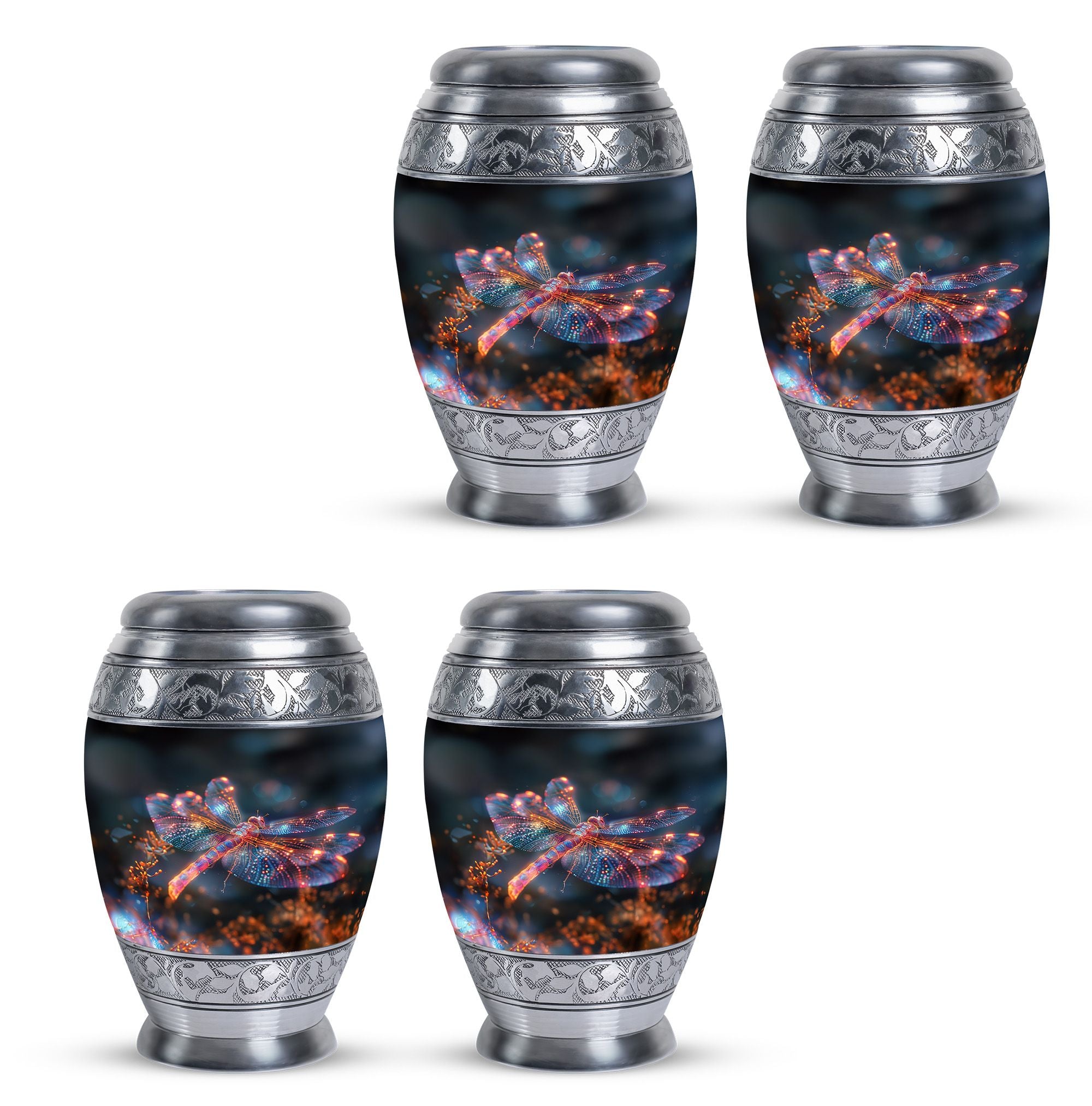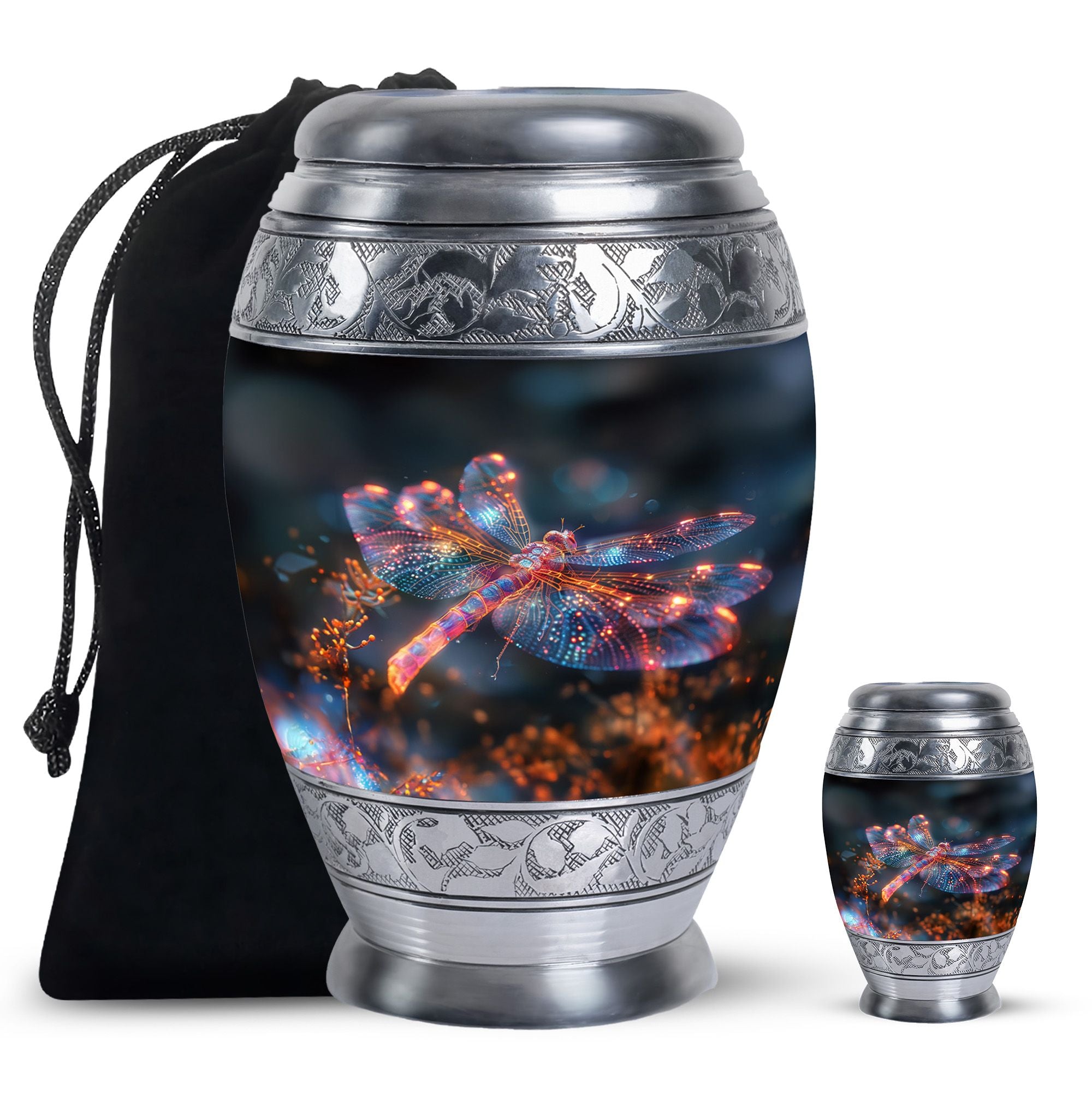 Crafted with precision and compassion, this piece blends fine craftsmanship with durable materials. The vibrant dragonfly motif, glowing in warm fiery tones, represents renewal and peace—making it one of the most meaningful adult urns for men & women. Made of premium aluminium, it provides secure storage for ashes and can be used as a burial urn or a stunning display keepsake. Its versatility makes it perfect for those seeking urns for human ashes women or mens urns for human ashes with equal elegance.