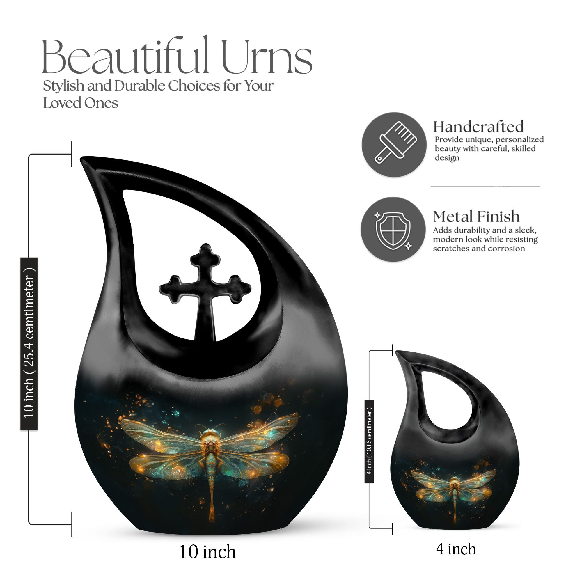 Honor your loved one with this beautifully handmade glowing dragonfly urn, designed to hold the ashes of an adult. Crafted from high quality aluminum, this urn offers both elegance and durability, perfect for a lasting tribute. Measuring 10 inches tall and holding up to 200 cubic inches of ashes, it is ideal for those seeking a unique, nature-inspired cremation urn for ashes.