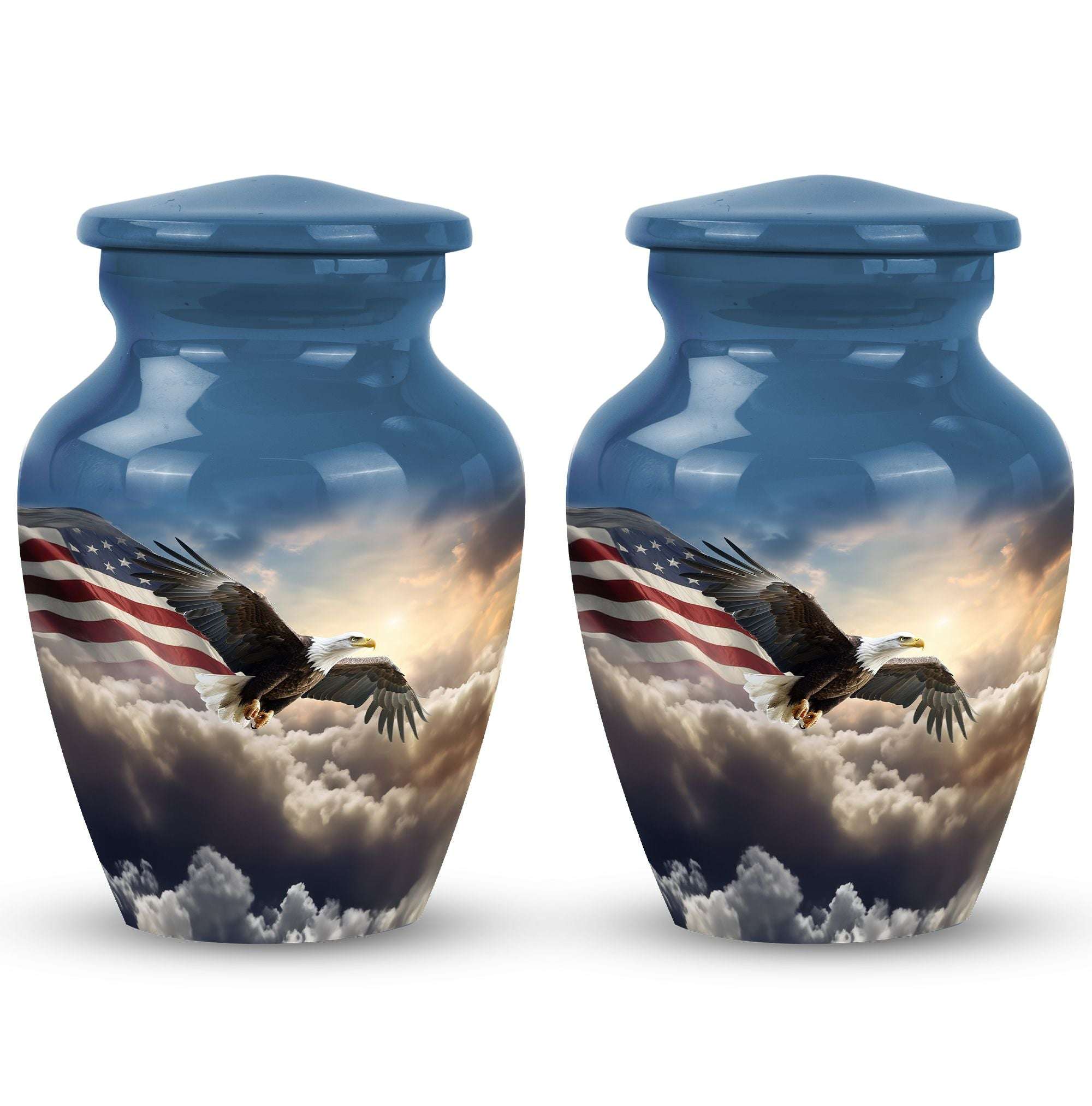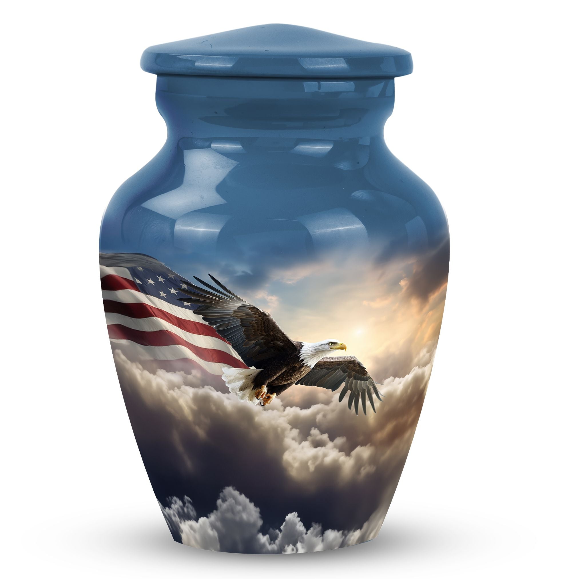 With our 'Eagle Memorial Urn', celebrate and cherish the love and memories of your departed beloved. Specially crafted from high-quality Aluminium, this large 3-inch urn, at a substantial weight of 3.3 pounds, stands tall at 10 inches in height, embodying strength and resiliency. It conveniently houses up to 200 cubic inches of ashes in a heartwarming, self-contained way. Our 'urn for ashes' comes encased in a stately velvet pouch, making it not just a container for human ashes, but an exquisite piece of art and a beacon of remembrance. Ideal as a tribute for men or can serve as urns for dad's ashes, you can add a personal touch to this classic urn by engraving names on it.