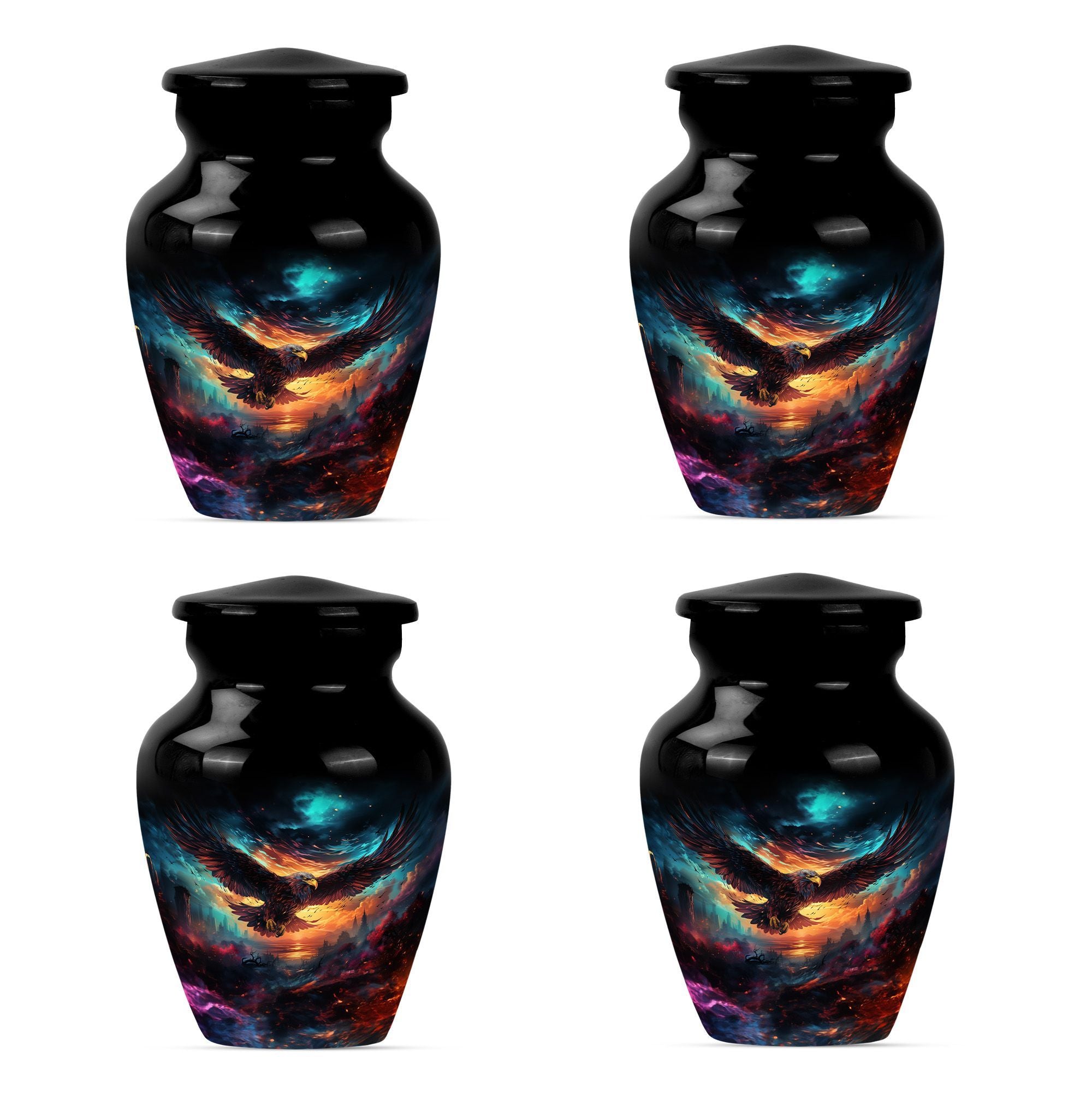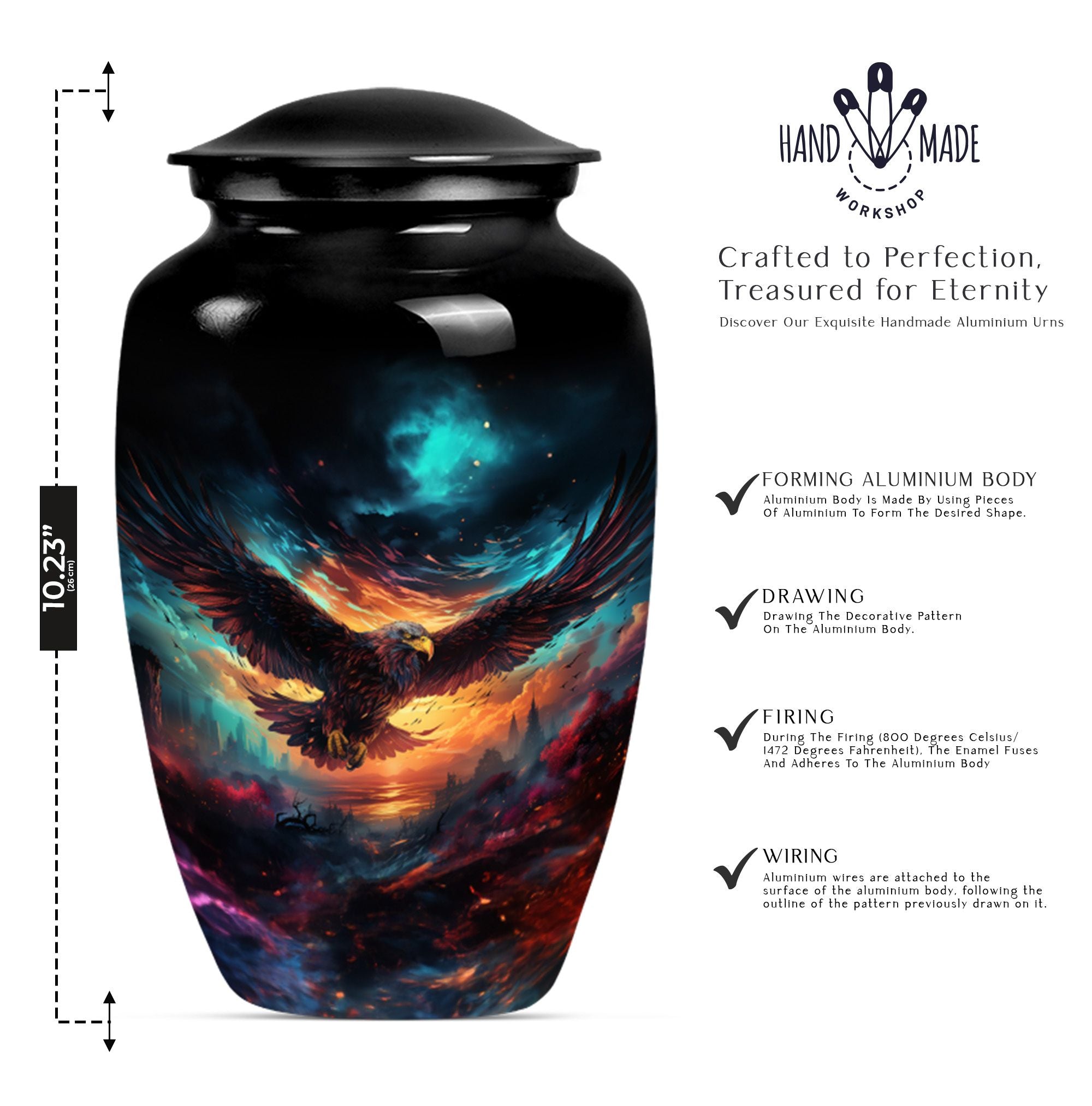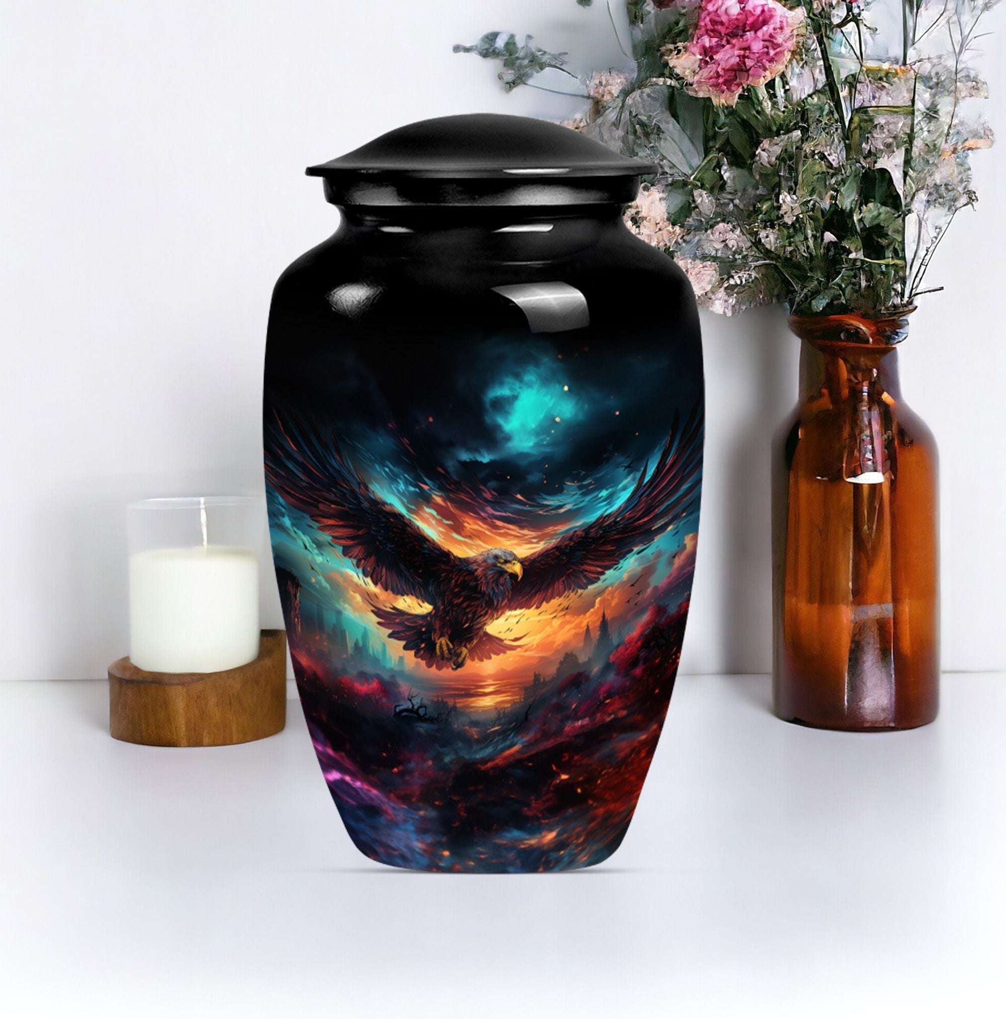 Introducing our meticulously crafted EAGLE Urn, a quintessential choice for memorial medium-sized urns veiled with a profound theme of a Wolf Howling. This large-sized urn, standing at 10 inches in height, has a substantial capacity of 200 cubic inches, ample to securely hold human ashes. Hailing from the realm of funeral medium-sized urns, this urn is composed of high-quality aluminum, guaranteeing robustness and longevity. The quality of materials used ensures that the urn weighs just 3.3 pounds, making it convenient to handle and move around as needed. Esteemed customers seeking urns for human ashes or urns for cremation will appreciate the added customization feature - an engraving of a loved one's name to further personalize this honorable abode. Each urn is delivered with a lavish velvet pouch for safekeeping your loved one's precious ashes. The timeless design adds a touch of classic style to this memorial urn, making it a fitting tribute for your loved one.