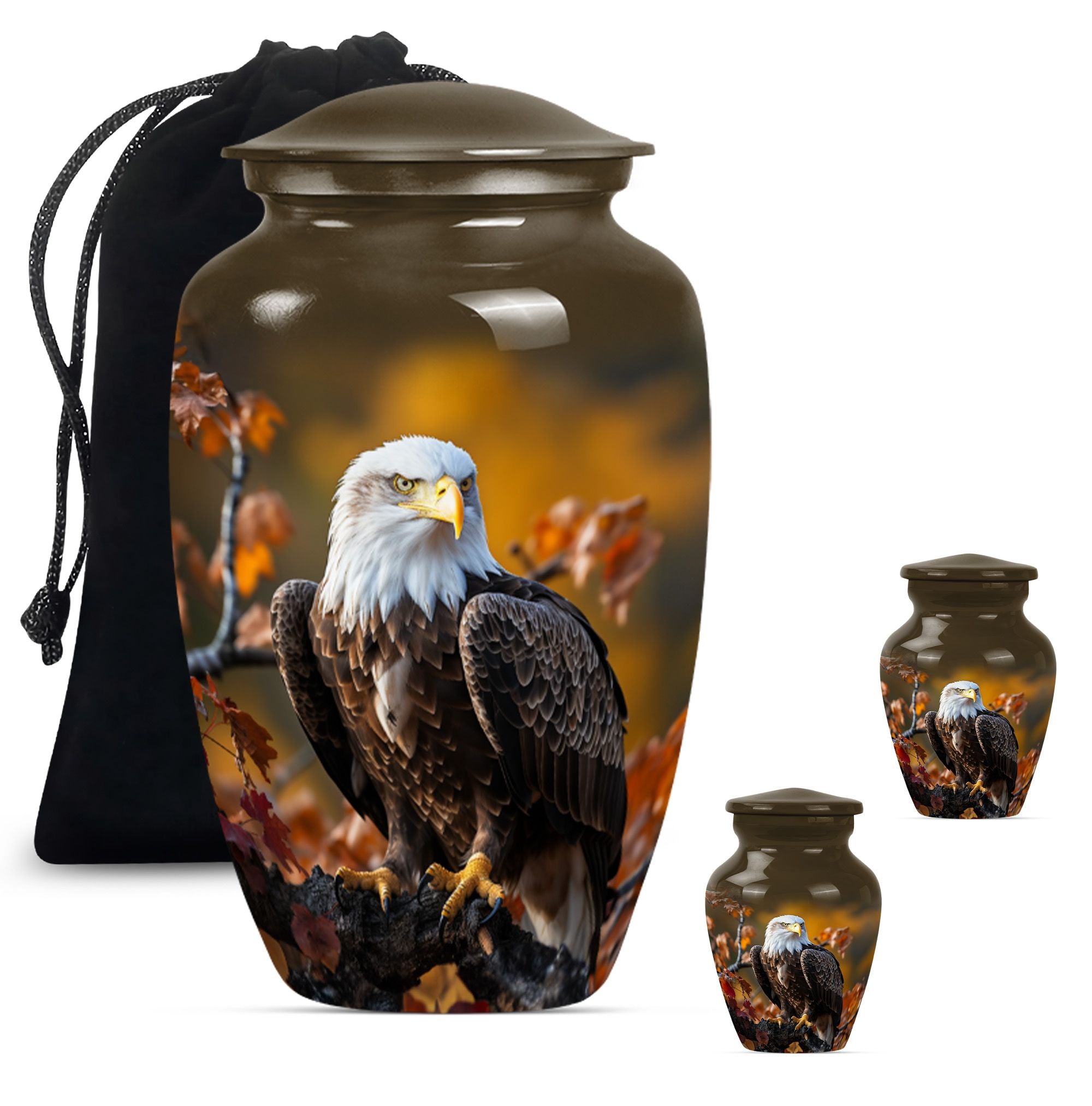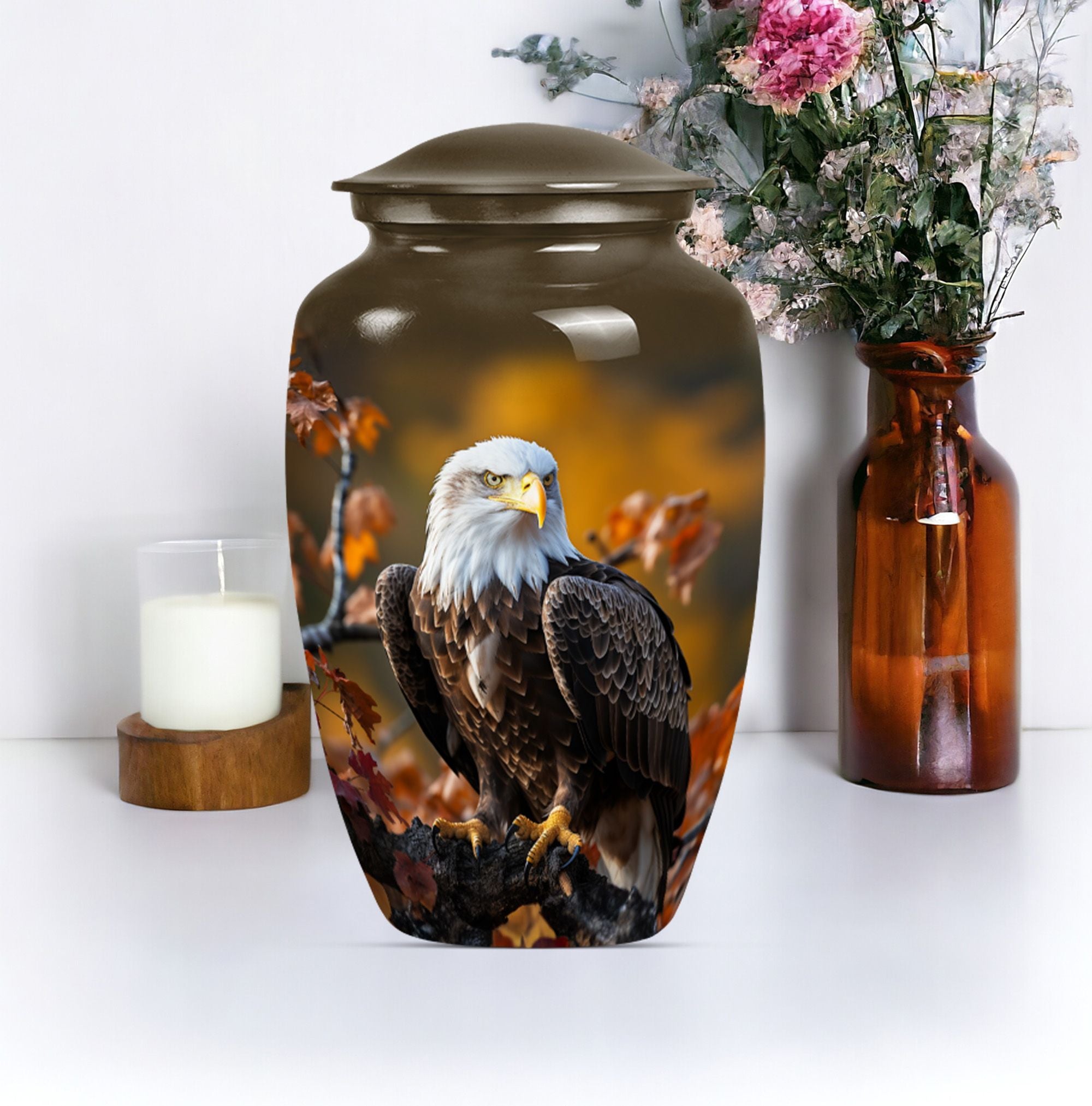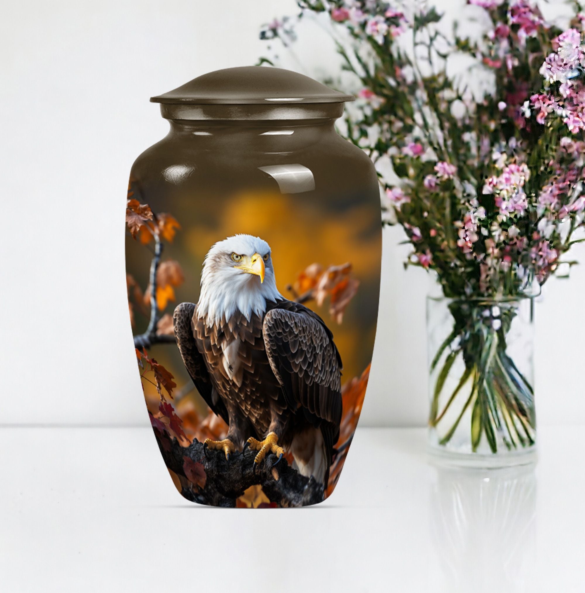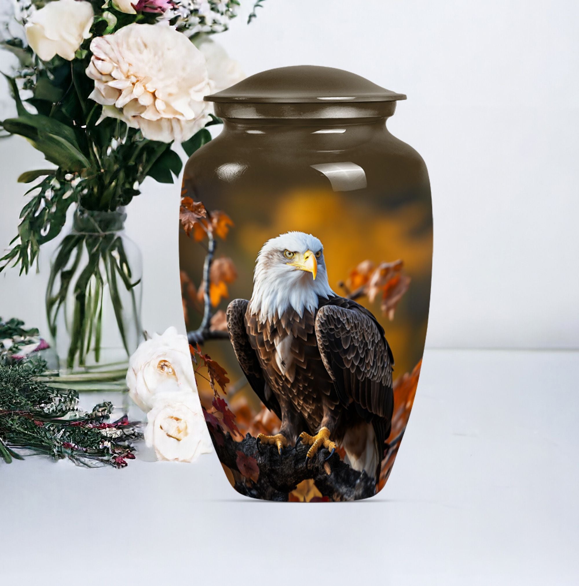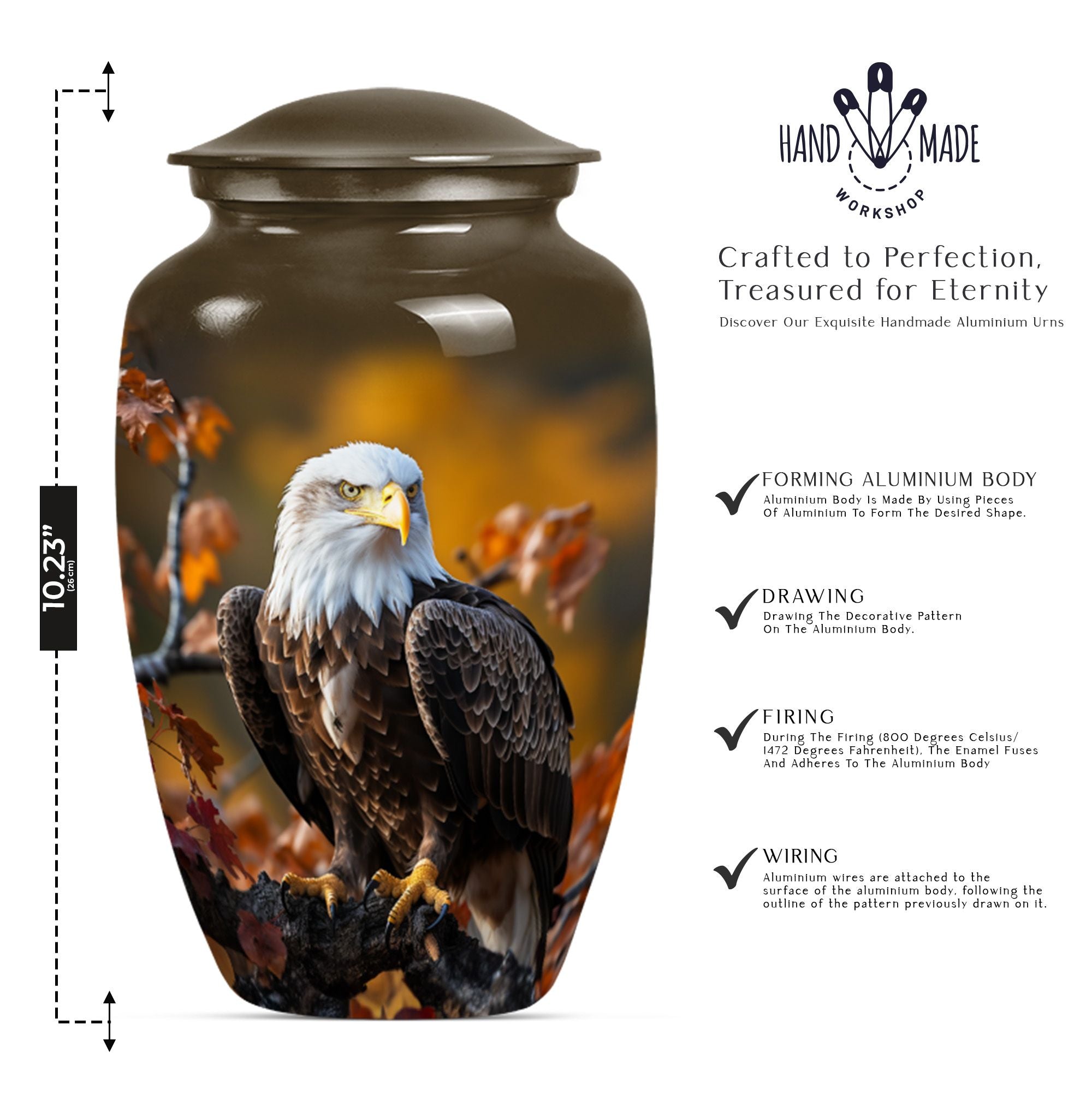 Be prepared for one of life's most profound transitions with the exquisite EAGLE Urn, carefully crafted for the containment of burial ashes. Measuring 10 inches in stature, this large urn is artfully shaped from sturdy aluminium, providing a hefty presence with a manageable weight of 3.3 pounds. The Wolf Howling theme injects a serene beauty to this traditional memorial urn, imparting an essence of tranquility and dignity. With a considerable capacity of 200 cubic inches, this piece ensures substantial space for adult ashes, making it a poignant selection for urns for cremation ashes. It comes inclusive of a velvet pouch for the ashes, providing an extra layer of protection and respect. The piece also provides an option for personalization- you can engrave names, adding a touch of intimacy to this aluminium memorial. Break away from the mundane with an urn that combines functionality, elegance, and personal touch, making the commemoration of your loved ones truly special.