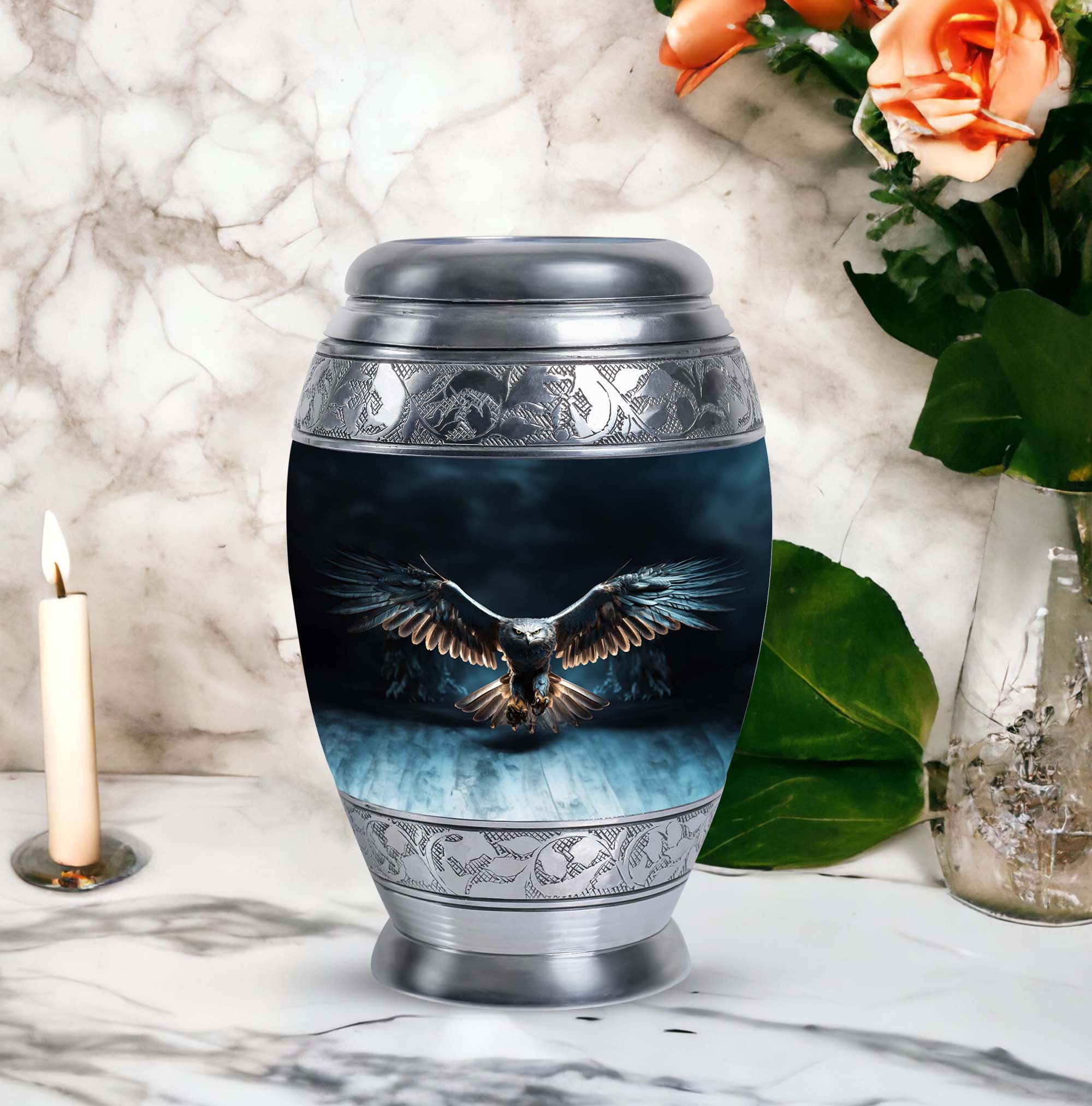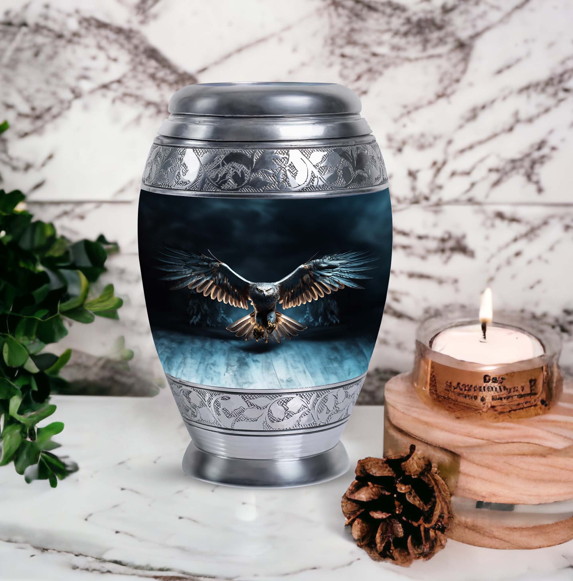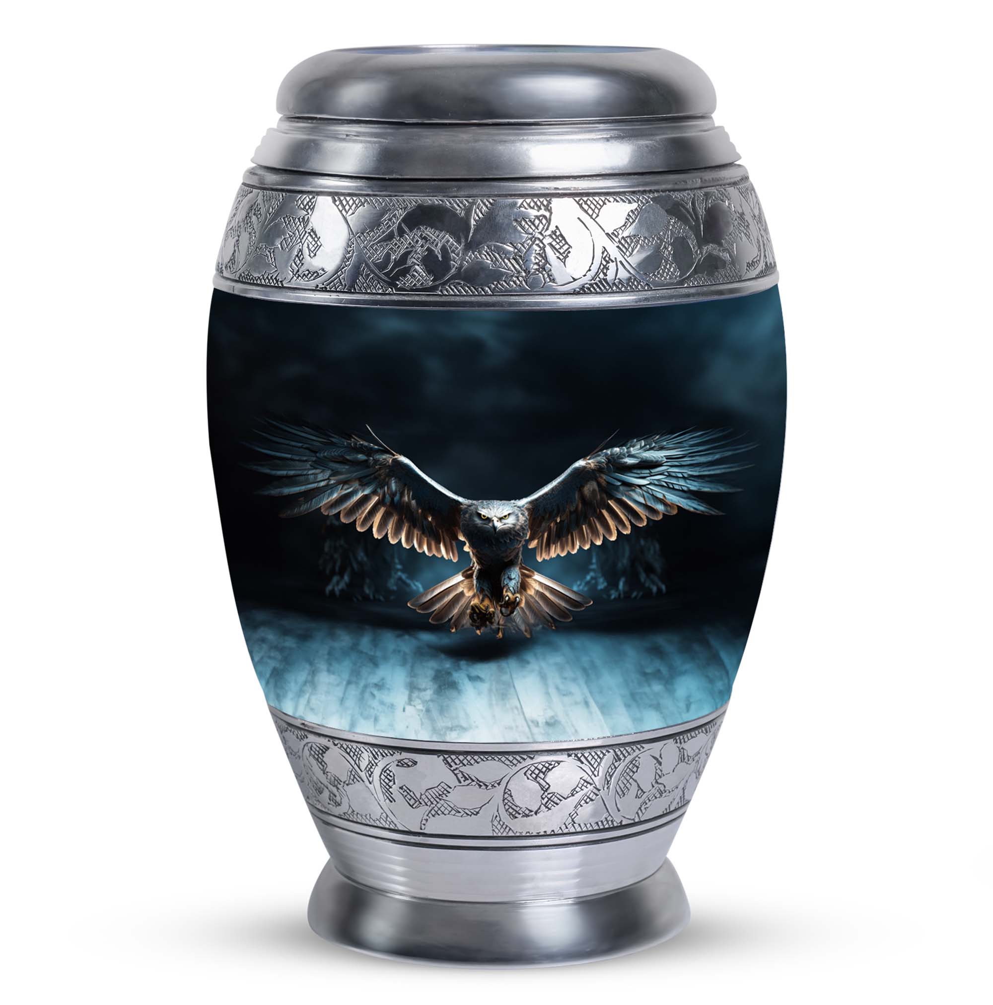 Elevate the remembrance of your loved ones with our Eagle Urns for Human Ashes, a cherished symbol of dignity and strength. This 3-inch large urn is crafted from durable aluminium, ensuring long-lasting protection for precious ashes. Weighing in at 3.3 pounds and standing tall at 10 inches in height, it boasts a capacity of 200 cubic inches, catering to the needs of adults and seniors alike. This classic urn emanates an air of timeless elegance, making it a fitting choice among memorial urns. Each urn is complemented with a velvet pouch for discreet and respectful containment of ashes. To add a loving personal touch to this symbolic keepsake, we offer customization options - engrave names on your metal cremation urn, making this piece truly yours. With our cremation urns for human ashes, transform a personal loss into an everlasting memory. A burial urn tailored to match the profound beauty of the souls it encapsulates. Commemorate the eternal spirit of your beloved with our Eagle Urns.