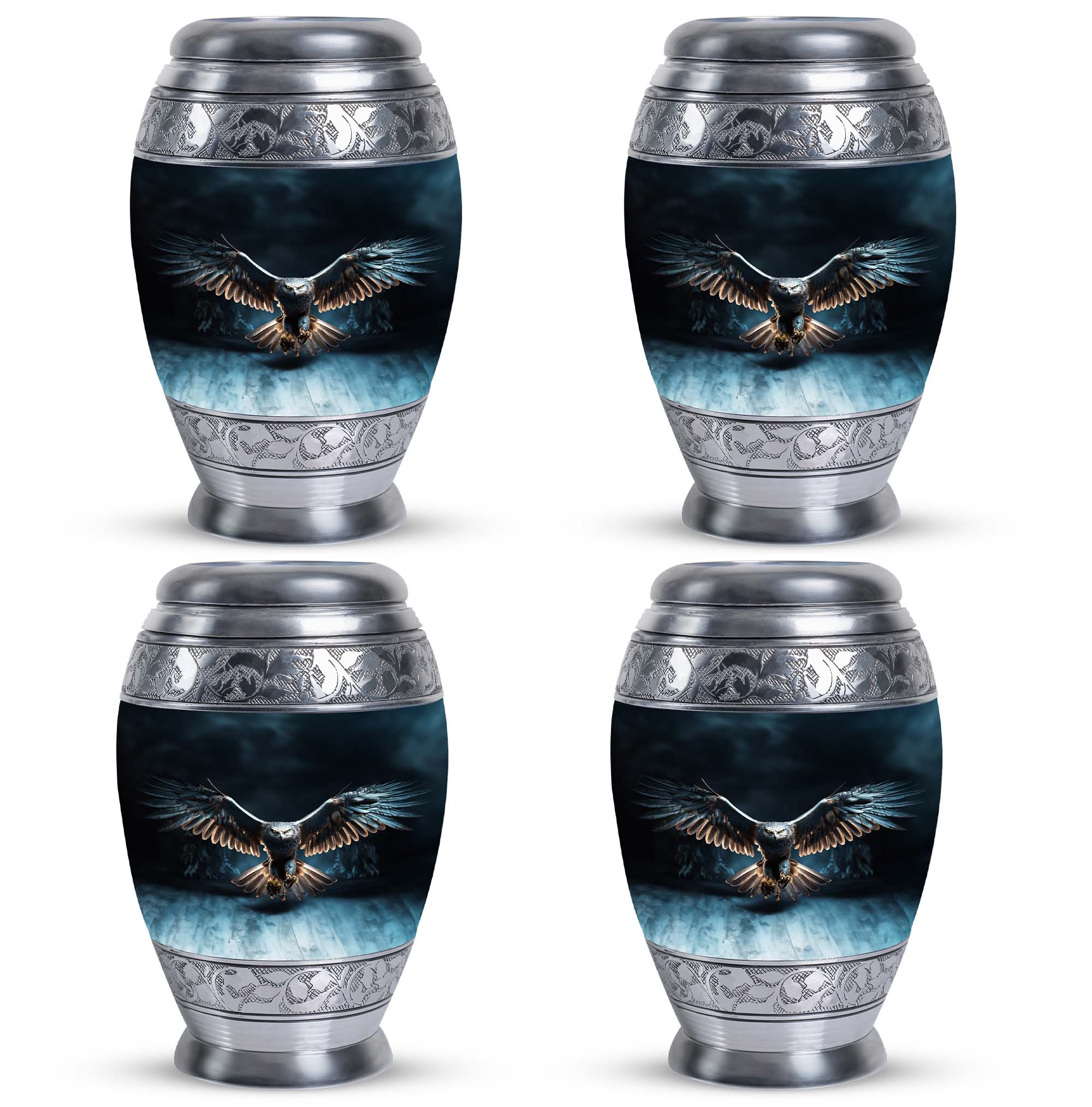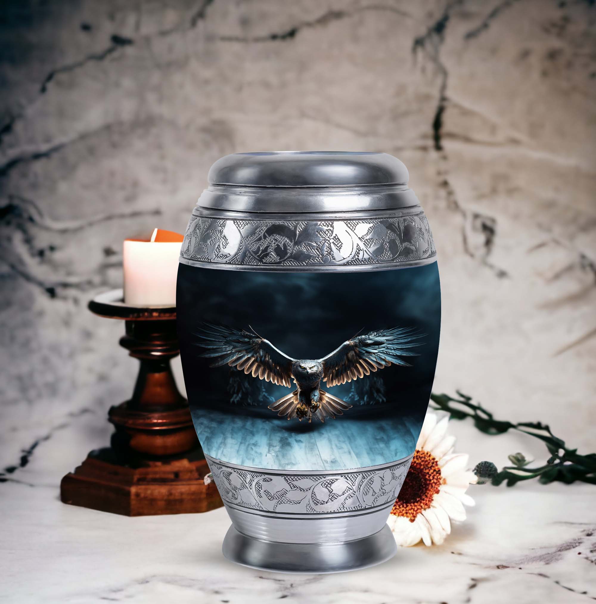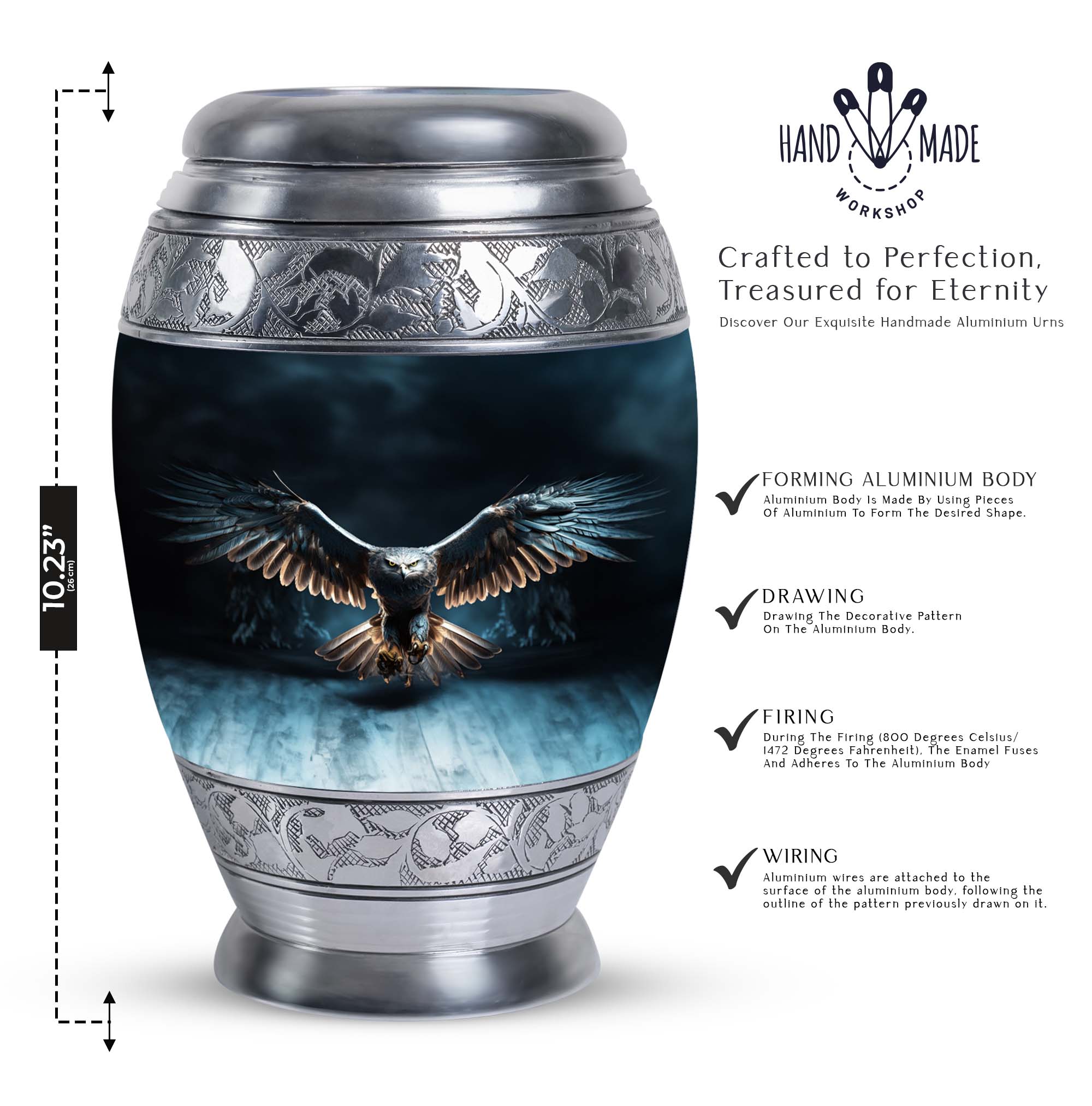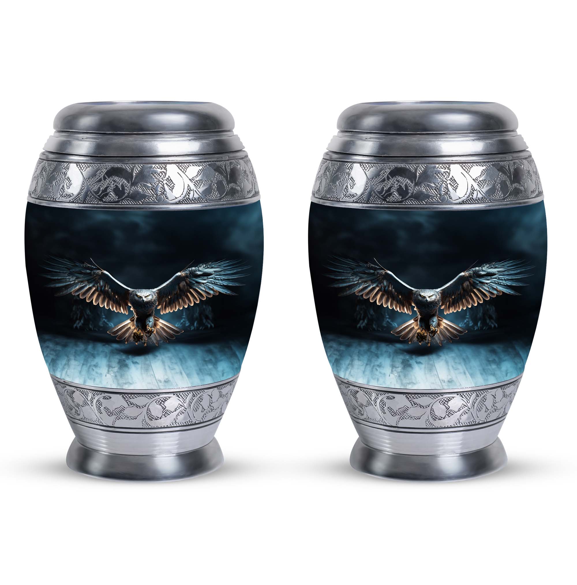 Elevate the remembrance of your loved ones with our Eagle Urns for Human Ashes, a cherished symbol of dignity and strength. This 3-inch large urn is crafted from durable aluminium, ensuring long-lasting protection for precious ashes. Weighing in at 3.3 pounds and standing tall at 10 inches in height, it boasts a capacity of 200 cubic inches, catering to the needs of adults and seniors alike. This classic urn emanates an air of timeless elegance, making it a fitting choice among memorial urns. Each urn is complemented with a velvet pouch for discreet and respectful containment of ashes. To add a loving personal touch to this symbolic keepsake, we offer customization options - engrave names on your metal cremation urn, making this piece truly yours. With our cremation urns for human ashes, transform a personal loss into an everlasting memory. A burial urn tailored to match the profound beauty of the souls it encapsulates. Commemorate the eternal spirit of your beloved with our Eagle Urns.