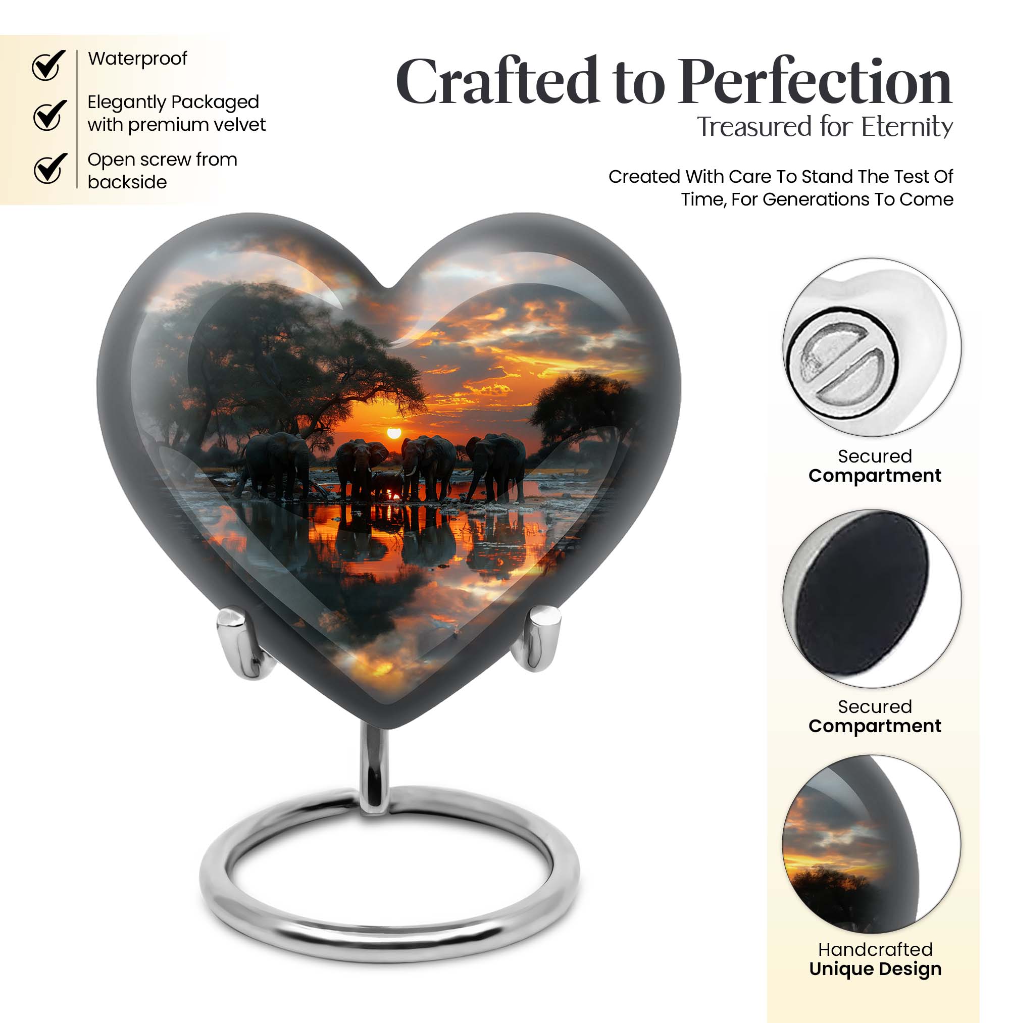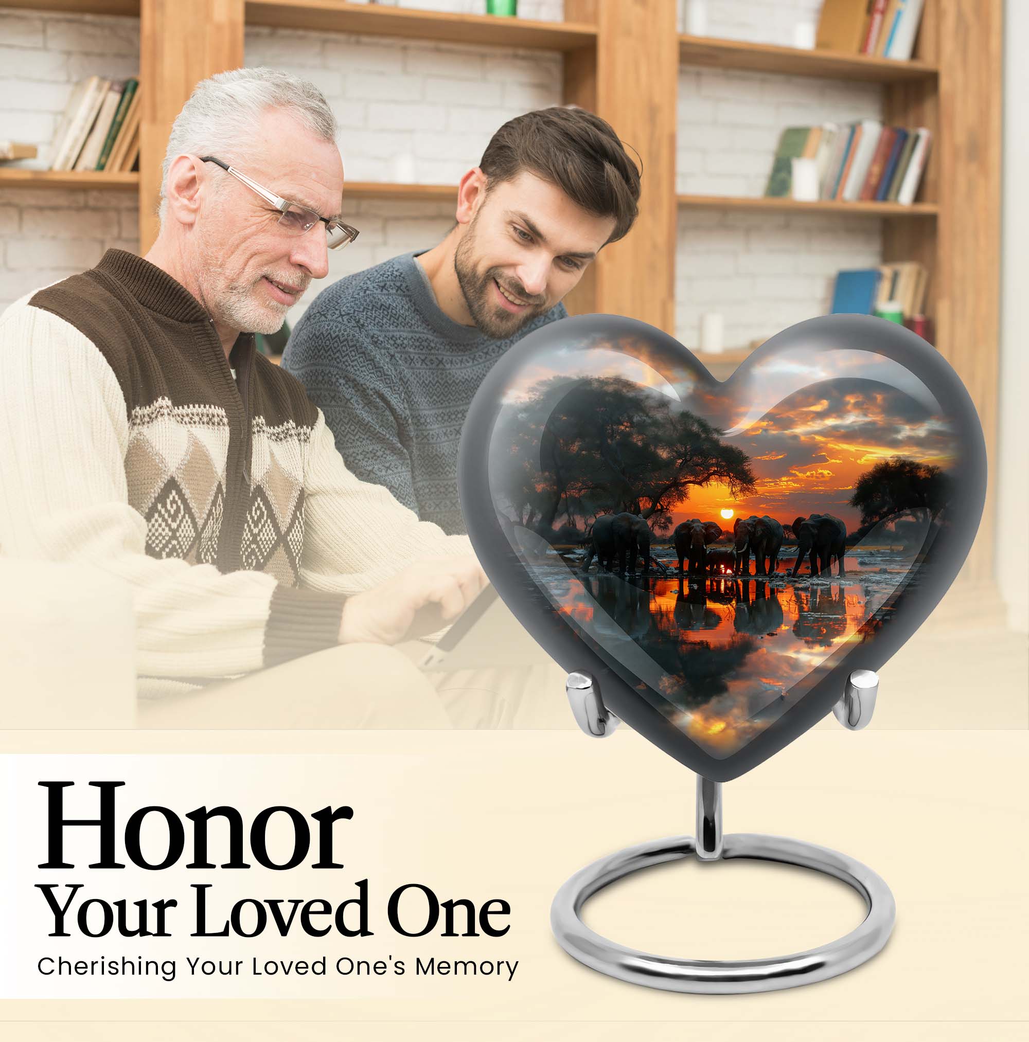 Experience an unparallel mix of symbolism and functionality with this exquisite 10-inch Elephant urn, meticulously crafted from high-grade aluminium for durability. This Large Urn sums up to 3.3 pounds, a sight to behold, meticulously fashioned in a captivating Heart Urn theme featuring delicate butterfly details. The urn’s capacity is generous, holding up to 200 cubic inches. This makes it an ideal funeral urn for mom or any beloved female as it can comfortably contain a substantial quantity of ashes. Offering an exceptional tactile experience, the urn comes with a velvet pouch for safe containment of the dear one's remains. To make this unique urn for ashes even more personal, there's an option to personalize with engraved names. This metal urn for burial in ground stands out in the crowd of memorial urns, demonstrating a fantastic blend of delicacy, robustness and affection. This is not just a 'product', but a cherished remembrance of your loved one.