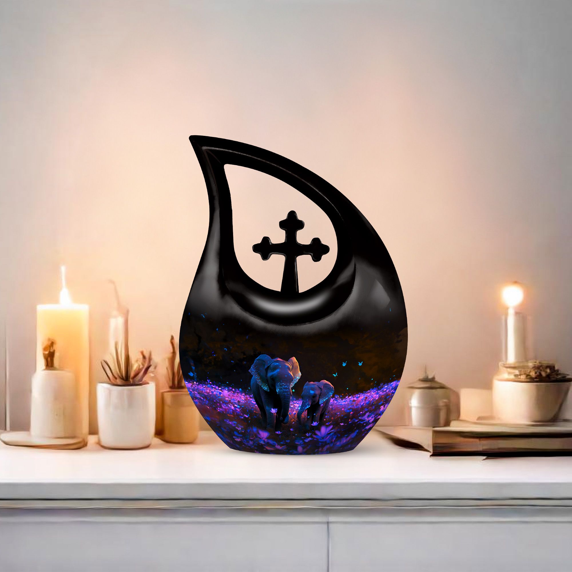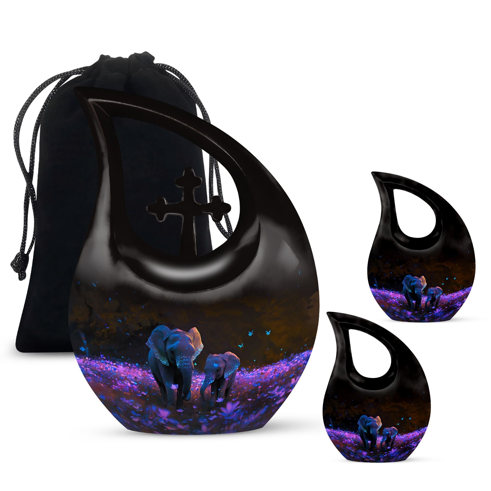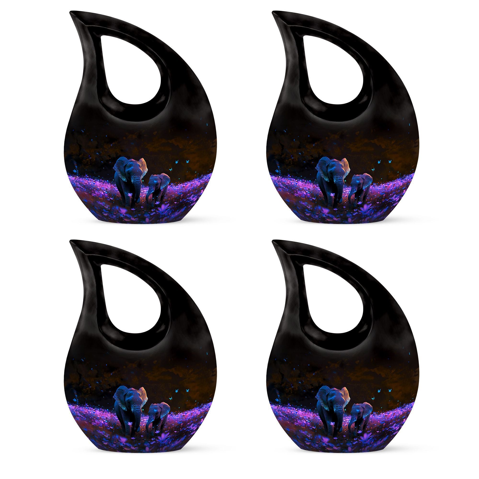 Crafted from premium aluminum, this human cremation urn features a stunning night meadow design illuminated by soft tones of indigo and silver. Two intricately engraved elephants stand side by side beneath a moonlit sky, symbolizing unity and peace. The polished surface and secure screw-top lid ensure safety and elegance, making it perfect for display or burial. Available as a single urn or cremation urns set, it provides a meaningful memorial for those who journeyed through life together.